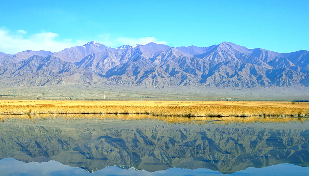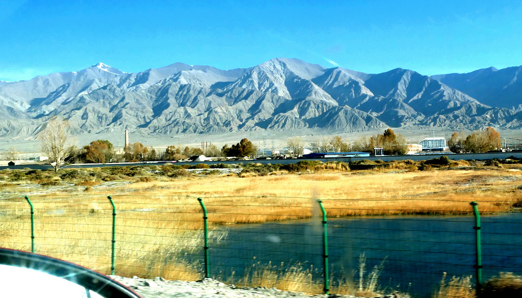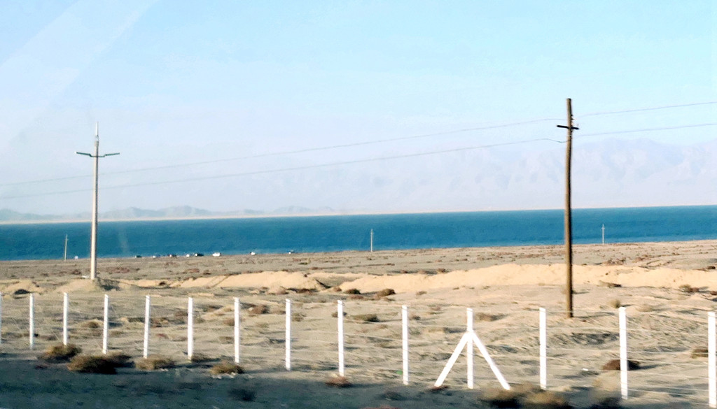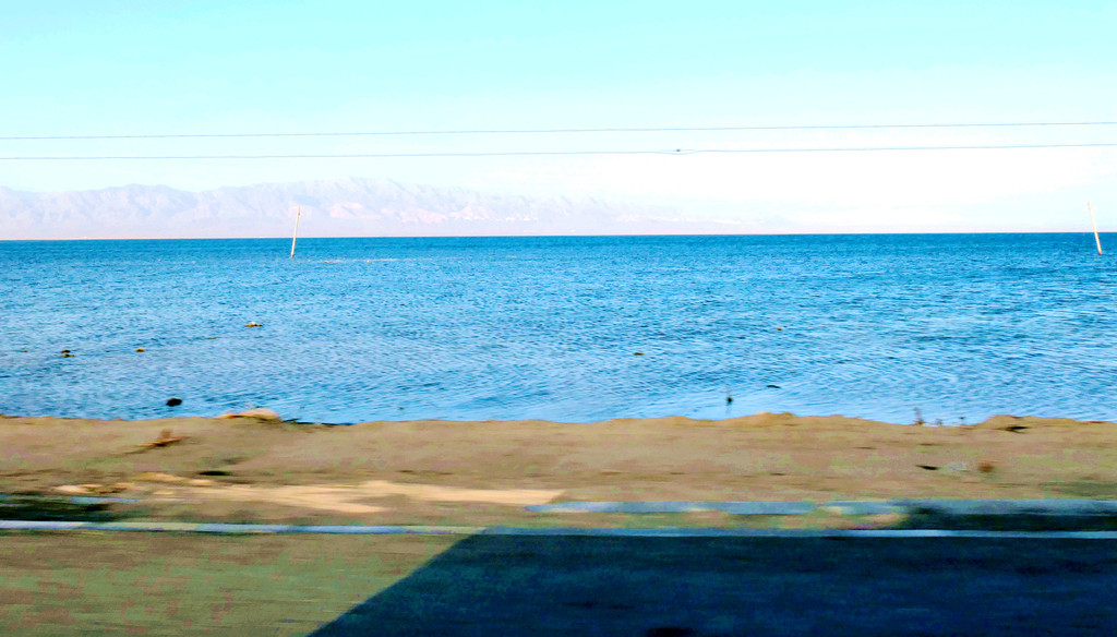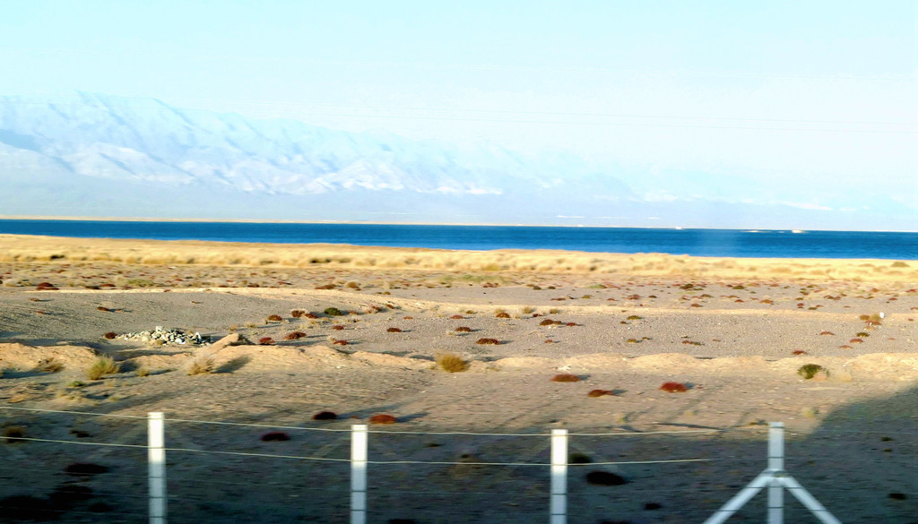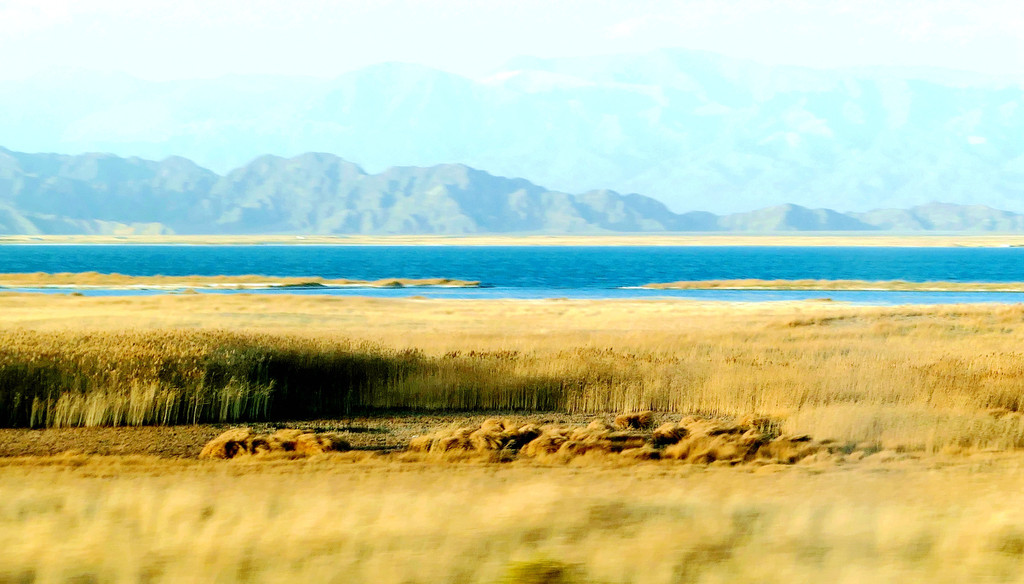 18:27重上柳格高速北行,从公路上眺望,小柴旦湖其实并不小,水面辽阔,一望无际,感觉就像是大海一样。时值深秋,沿湖生长的茂密芦苇已全都换上了秋装,在夕阳映照下呈现一片金黄。婆娑秋草随风摇曳,相伴湛蓝的湖水,再有远处巍峨的山影,汽车一路飞奔,一幅幅的优美画面也相继映入眼帘,湖光山色令人陶醉,手捧相机不停地拍摄。