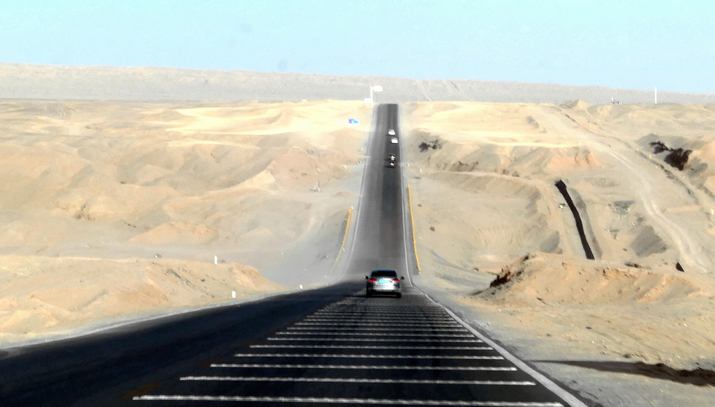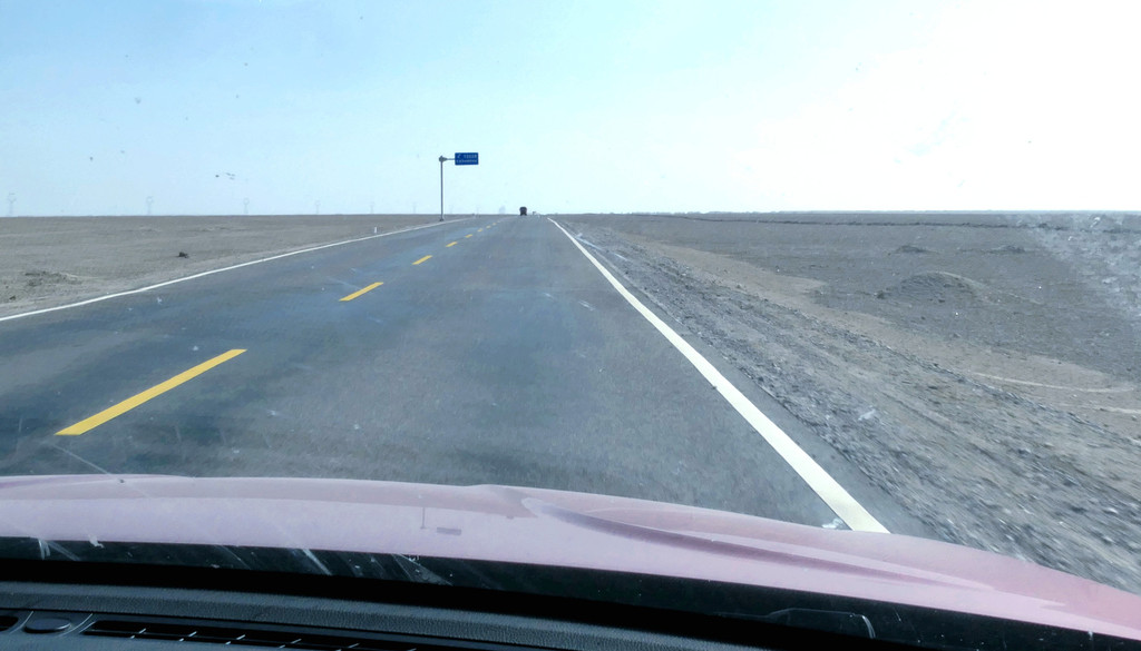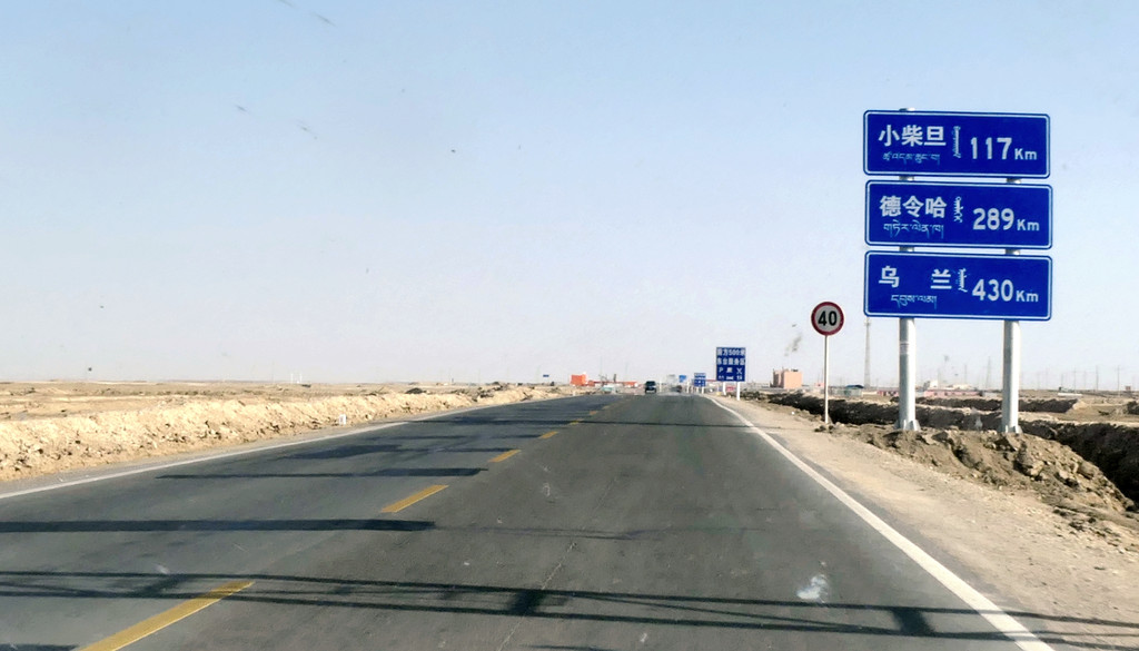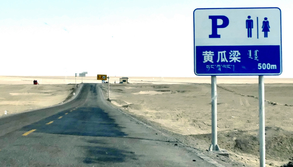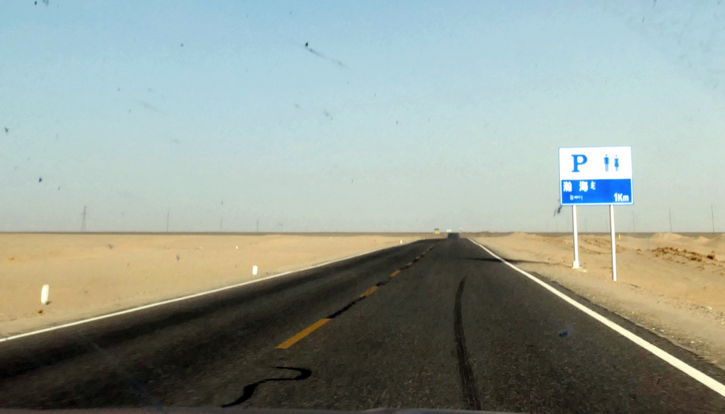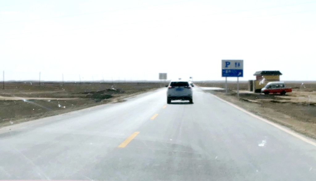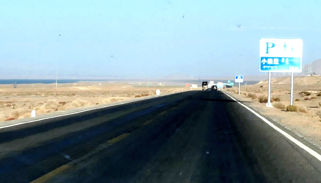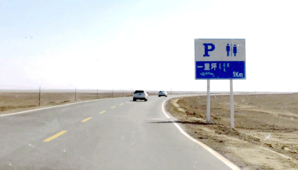 驶过雅丹区域,又是一马平川,12:44看到路牌,表明国道左侧有条简易道路可以通往冷湖、敦煌。12:56驶经“一里坪停车区”,从地图上看,“一里坪”是位于西台吉乃尔湖的北、南两片水域之间,然而,放眼四望,依旧是唯见沙漠、戈壁,一望无际,看不到任何水面。