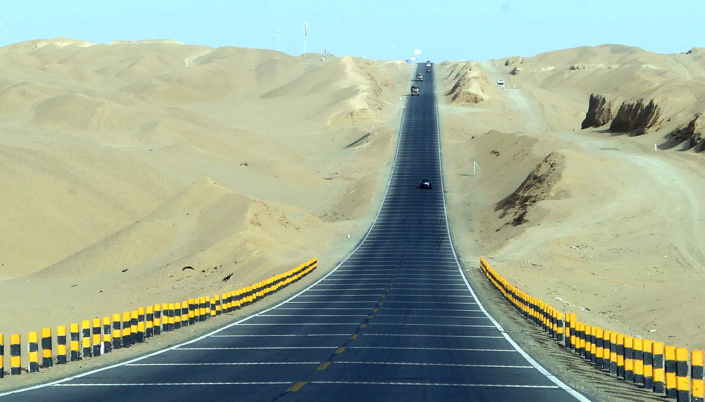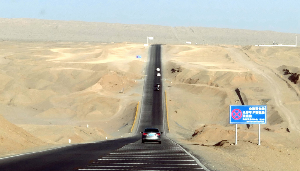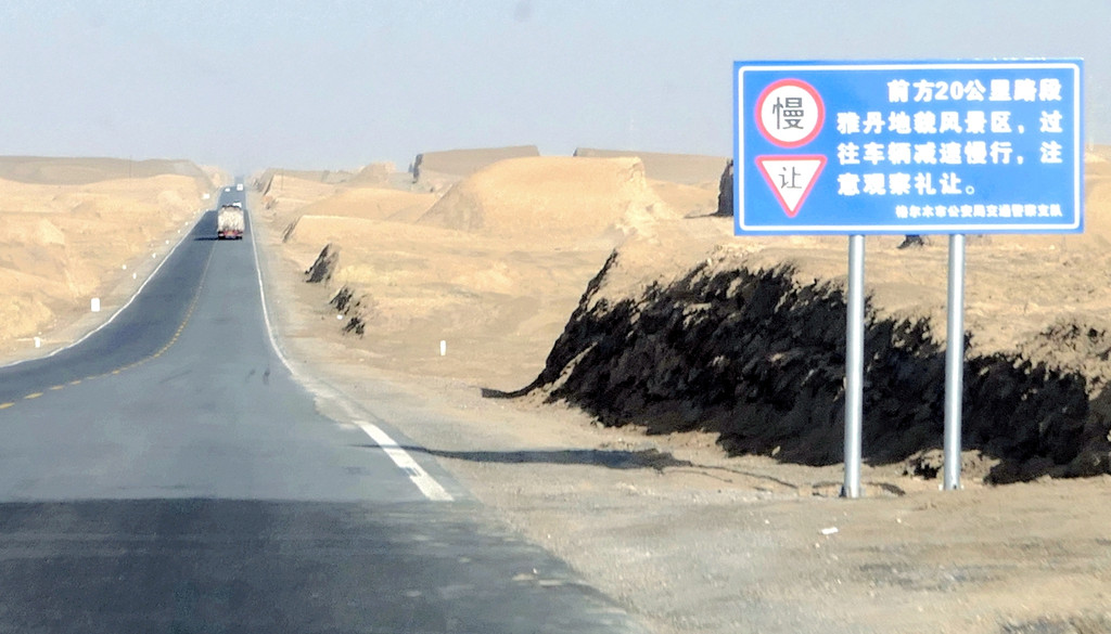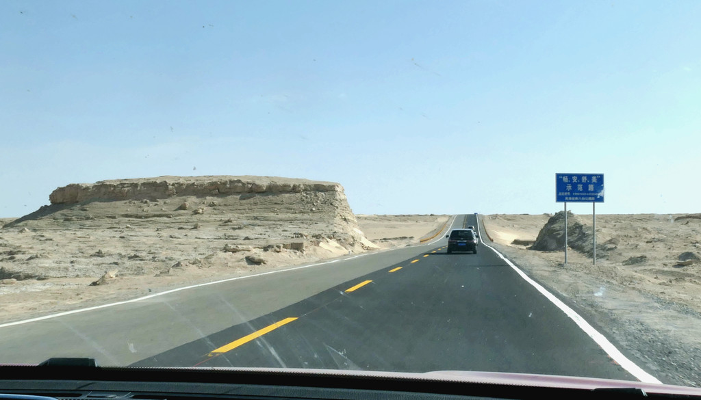 17:01驶经“涩北二号汽田”路口,这里是“涩格线”的起点,途径察尔汗盐湖通往格尔木。我们继续沿G315向东行驶,公路笔直穿越戈壁,地势忽高忽低,公路也随之起伏,于是就形成了“波浪公路”的景观。17:13看到公路交警提示:前方20公里是雅丹地貌景区,要求过往车辆慢行。然而,跟我们此前所经历过的几处雅丹相比,这片雅丹也并不见得有多好看。17:34驶经“瀚海”停车区,也还是仅见一座公厕而已。