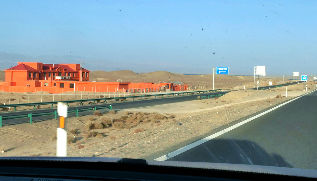 早餐依旧是肉夹馍与馄饨,X.J.还特意多买了两个肉夹馍,他说今日几乎全程都是经历无人区,估计很难找到餐馆吃午饭。8:55“平华大厦”退房出发,撤离前拍下一张窗外街景的照片,画面中是青海油田的职工宿舍与食堂。茫崖是座因石油而兴旺的城市,到处都有石油的印记,小城不大,安详、整洁,给我留下很好的印象。