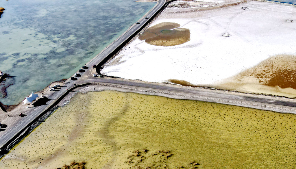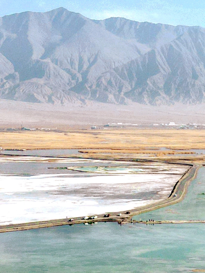 公路两侧的湖水颜色大不相同,北侧翠绿带黄,南侧深蓝发黑,因而,西台吉乃尔湖的这片湖区也被称作是“鸳鸯湖”、“双色湖”,成为国道G315沿线上的一处网红景点。我猜想,公路两侧湖水的颜色差异,应该是跟水中盐类的成分、浓度差别有关。