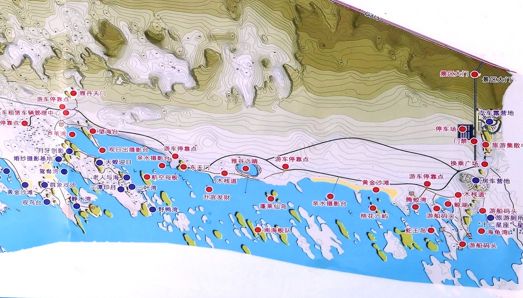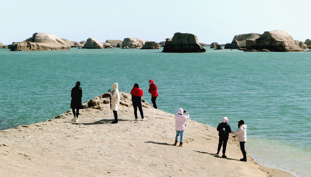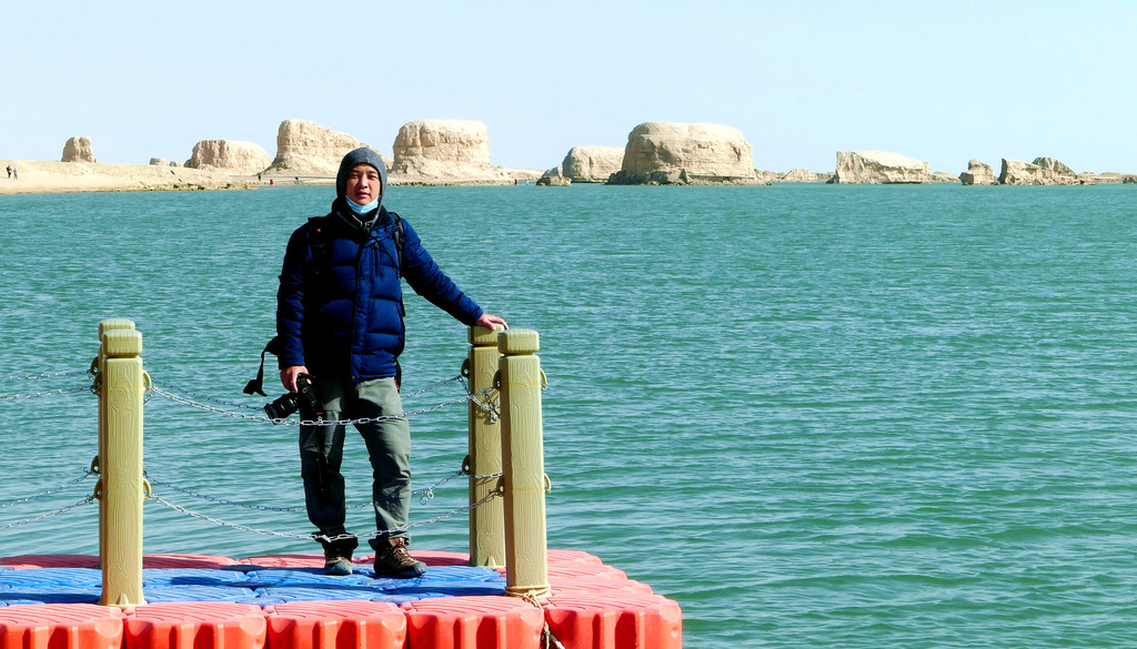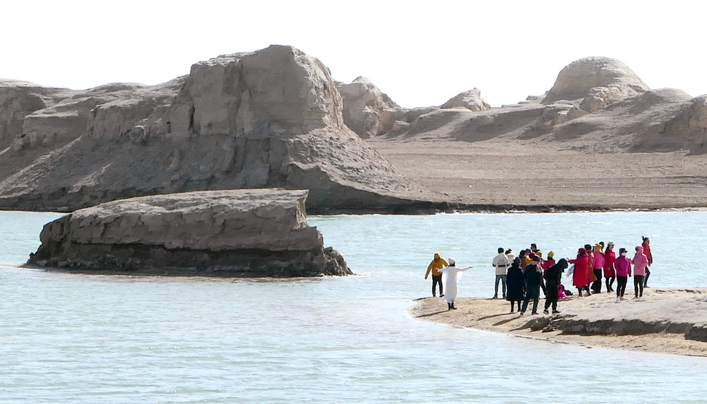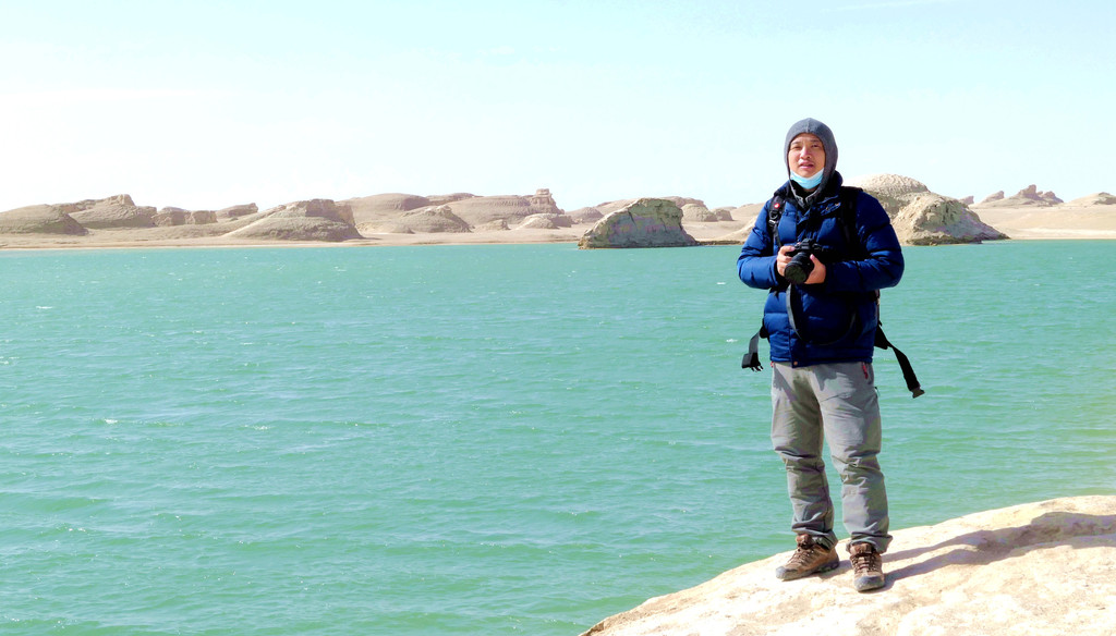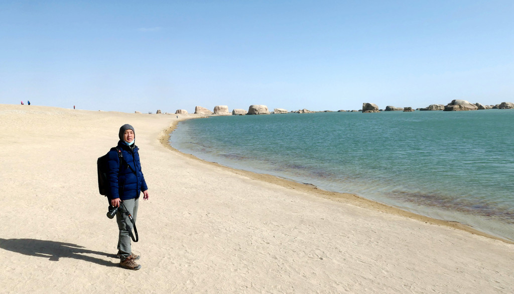 码头附近有一座细长半岛,深深插入湖中,景区地图称其“观日出摄影台”。不过,依我之见,真正的“摄影台”应该是位于半岛尖端,孤悬水中的一座小岛,它原本应该是与半岛相连,后来才变为孤岛。水中的雅丹不论是半岛,还是小岛,其实都是土丘,泥土泡水终难持久,眼前的景物应该是跟几年前不同,几年后之所见也会跟此刻不同。半岛深深插入湖中,它也是“水中雅丹”留影的绝好之处。