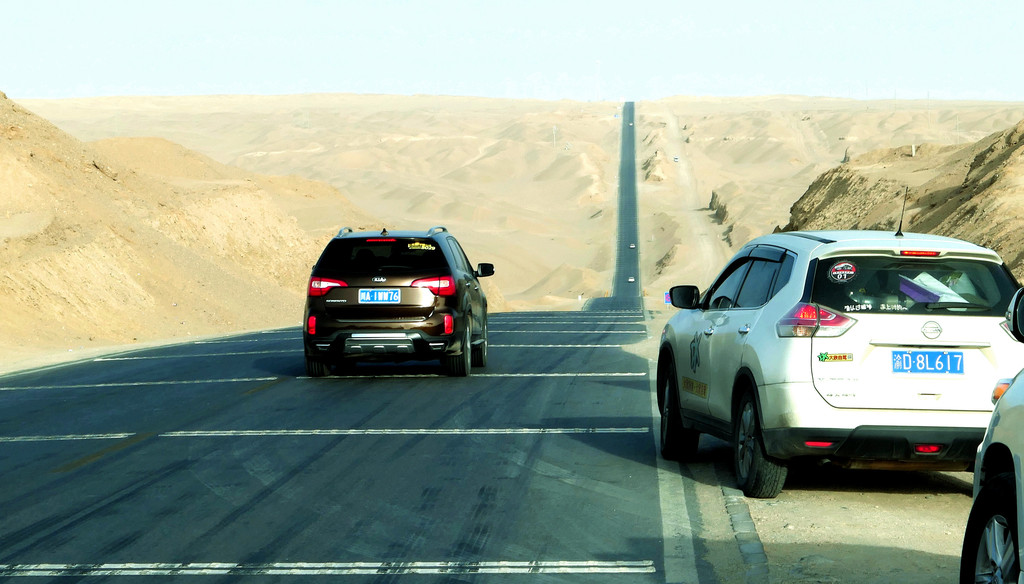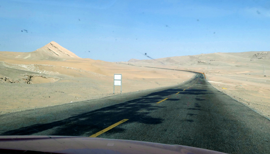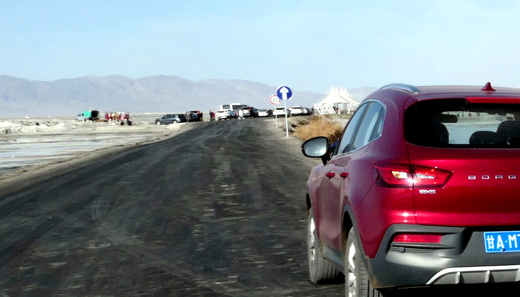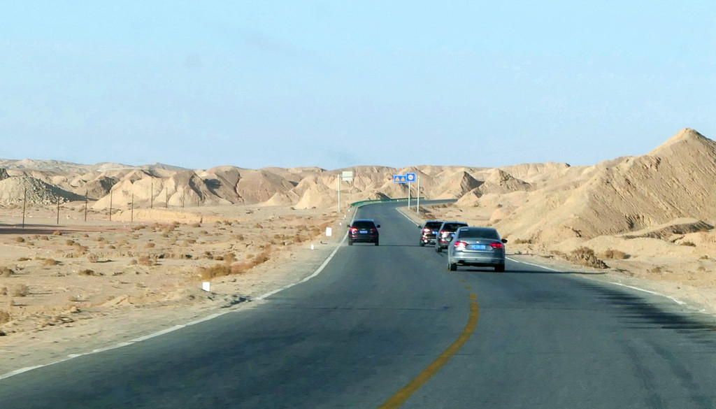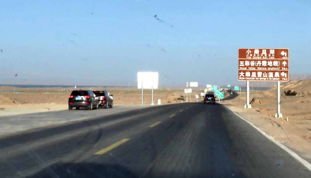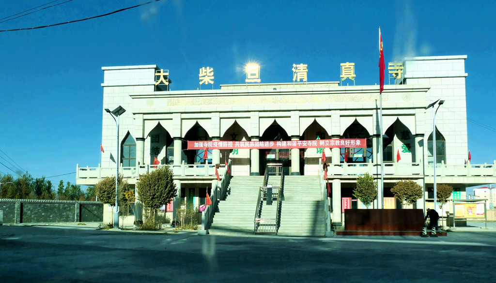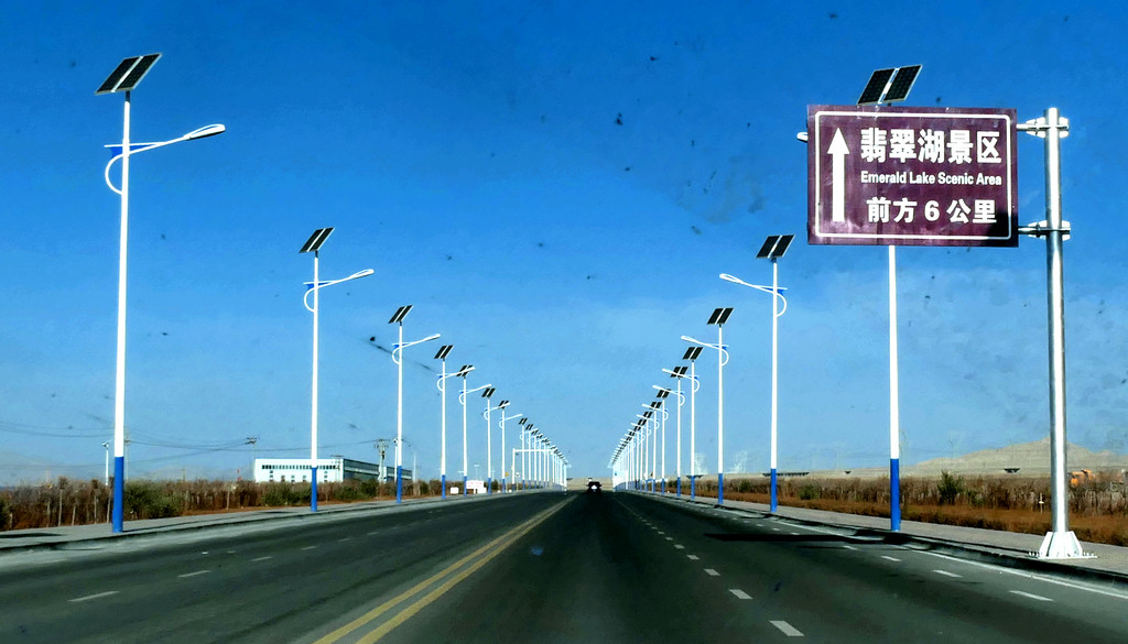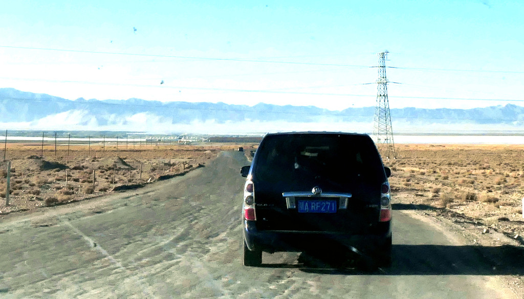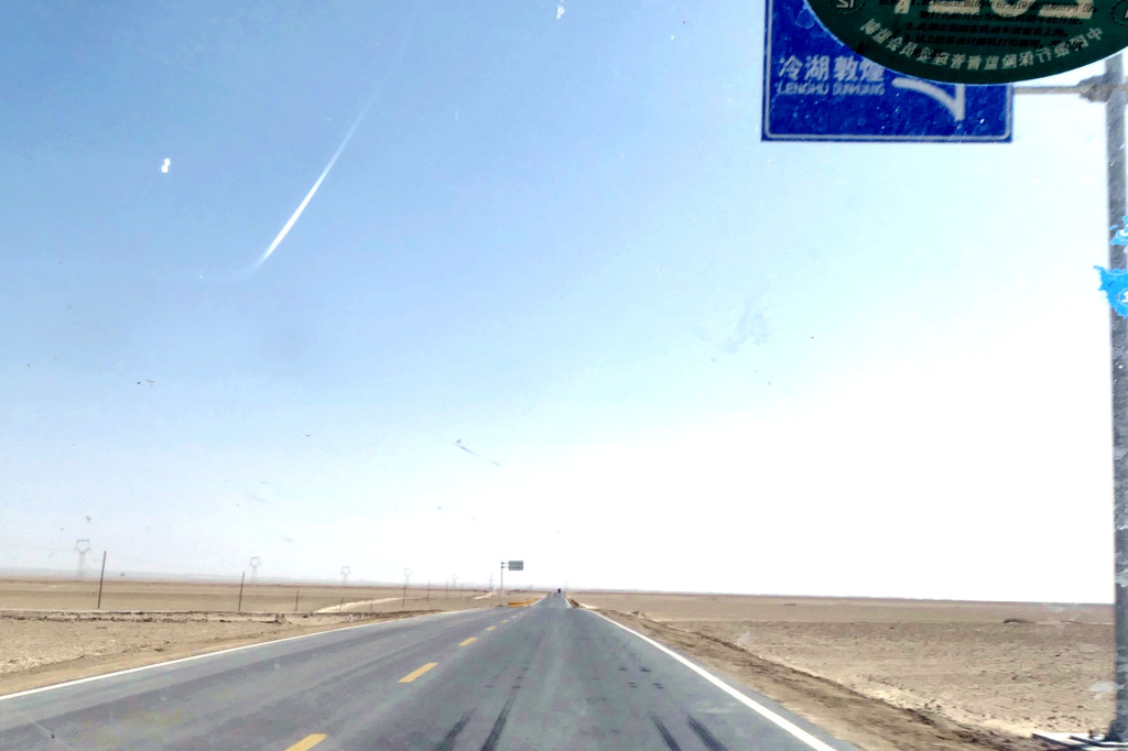 晒北酒店无早餐,今日晨起后在附近路边吃豆浆、油饼,饭后驱车前往翡翠湖。大柴旦地理偏西,天色较晚,此刻虽已9:30,但感觉仍像是厦门的7点多钟。走五彩街→人民东路→团结路,经过“大柴旦清真寺”后右拐,上国道G215驶向敦煌方向。9:36看到“距离翡翠湖景区6公里”的字样,9:40左拐下国道,驶入一条通往景区的岔路。