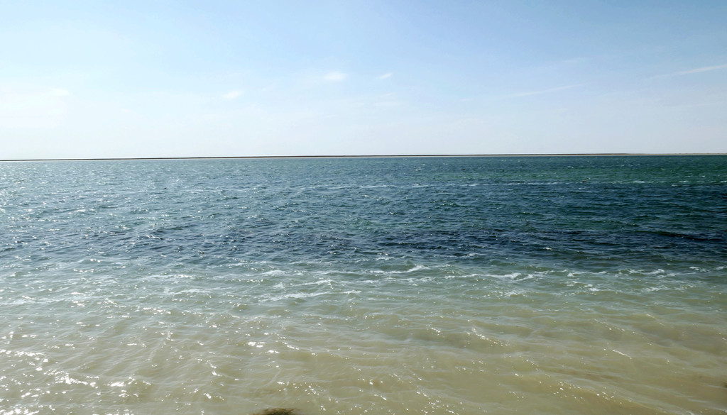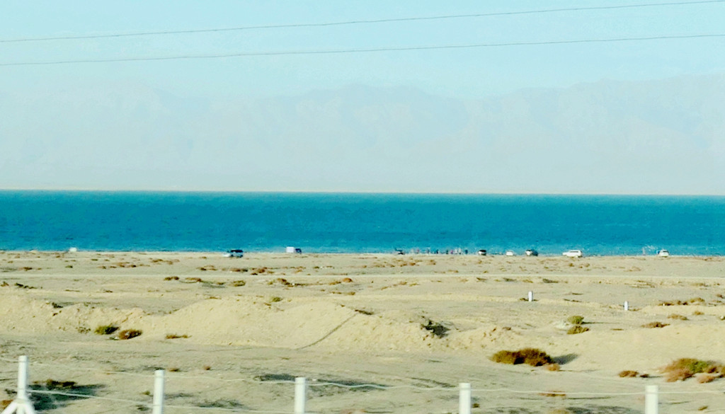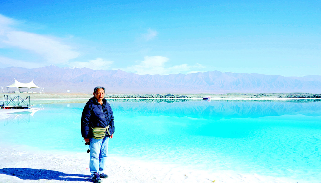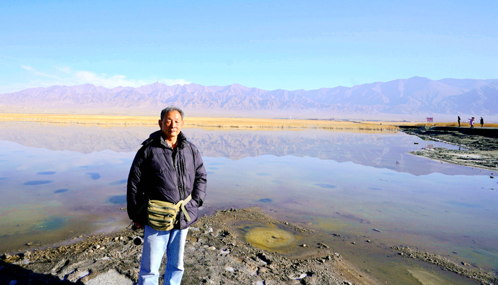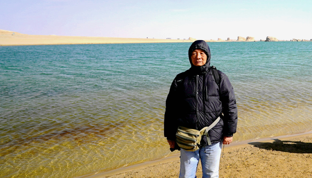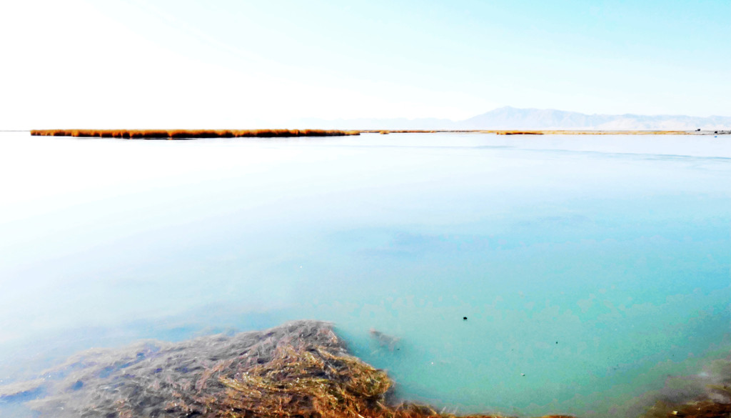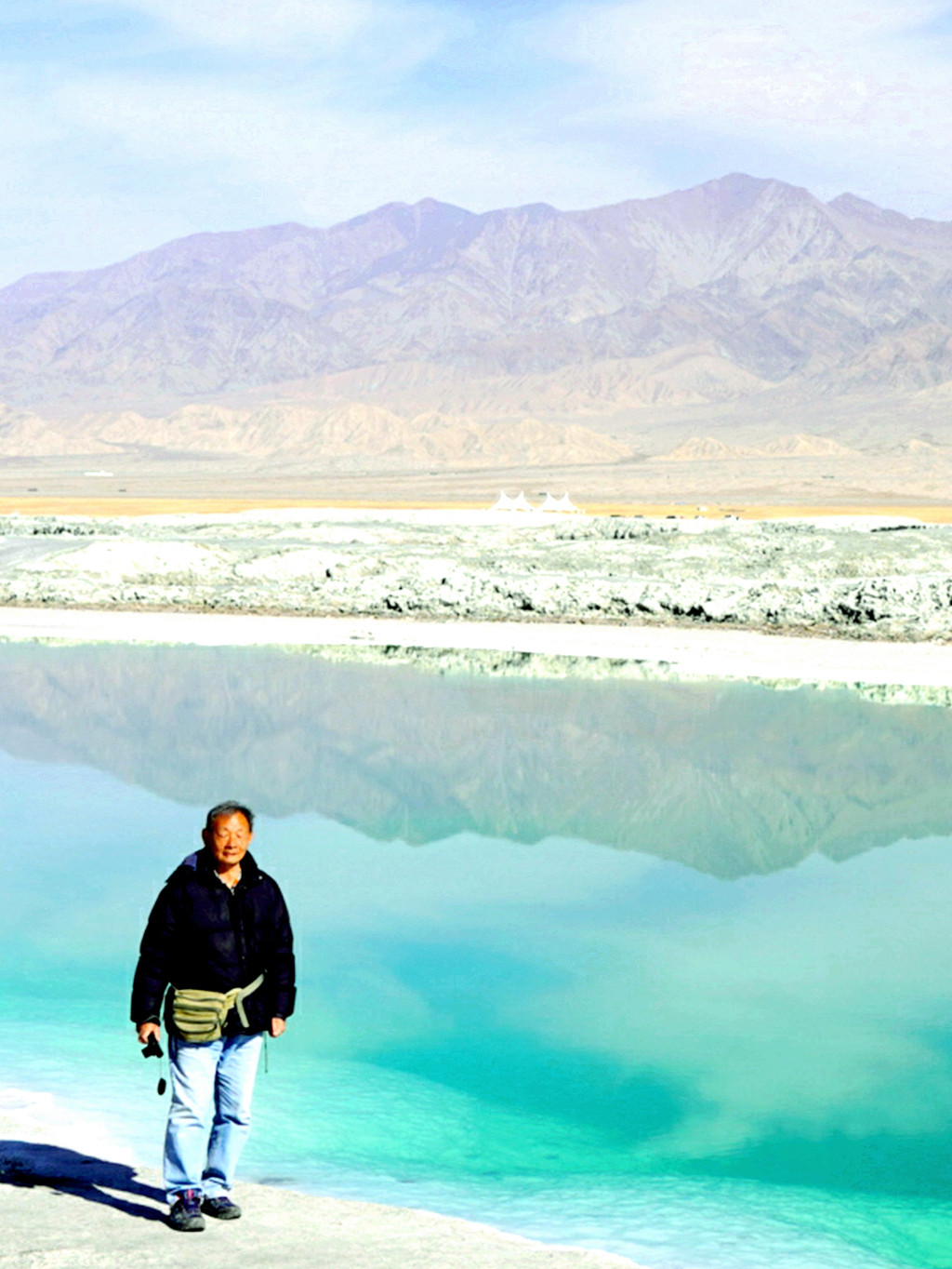 两人走到湖边,试尝了一下湖水,感觉其咸度与厦门的海水相近,然而,其水质却是远较厦门的海水清澈,色彩也更为丰富,更加漂亮。我们站在湖边观望,湖水的颜色随着光照角度、强弱以及湖水深浅的变化,神奇般地展现出深蓝、浅蓝、深绿、淡绿、鹅黄等明显不同之色调,再有湖面上的粼粼波光,水色之美令人惊叹,也难以言表。