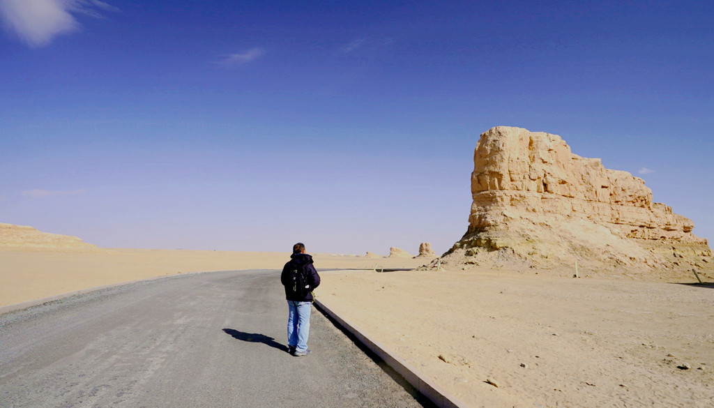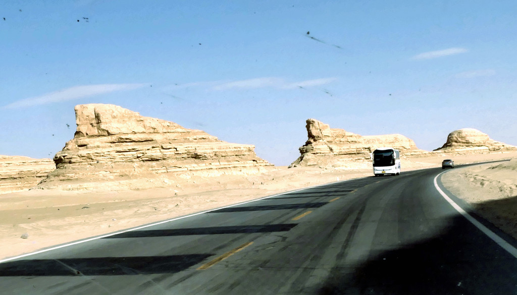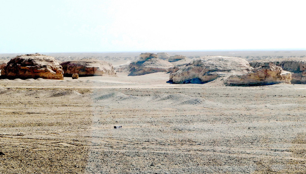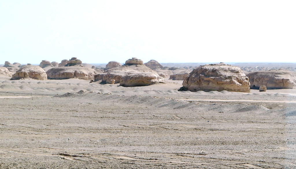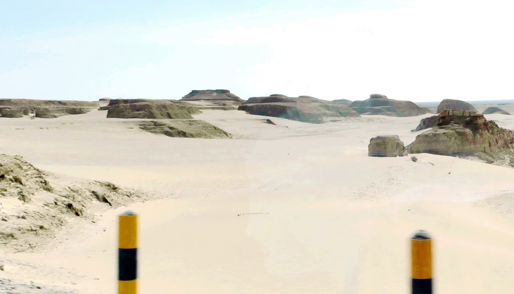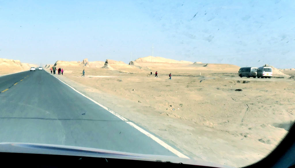 随后又开始穿越大面积的雅丹地貌区域,奇形怪状的土丘时不时地从窗外闪过,路边沙地上留有很多汽车轮迹,显然,已有不少游人都曾驱车进入雅丹区域,但我们今日时间吃紧,只是偶尔停车,拍拍照片。湖泊应该是距离公路较远,我们一路行车都是只见雅丹,未见湖水。