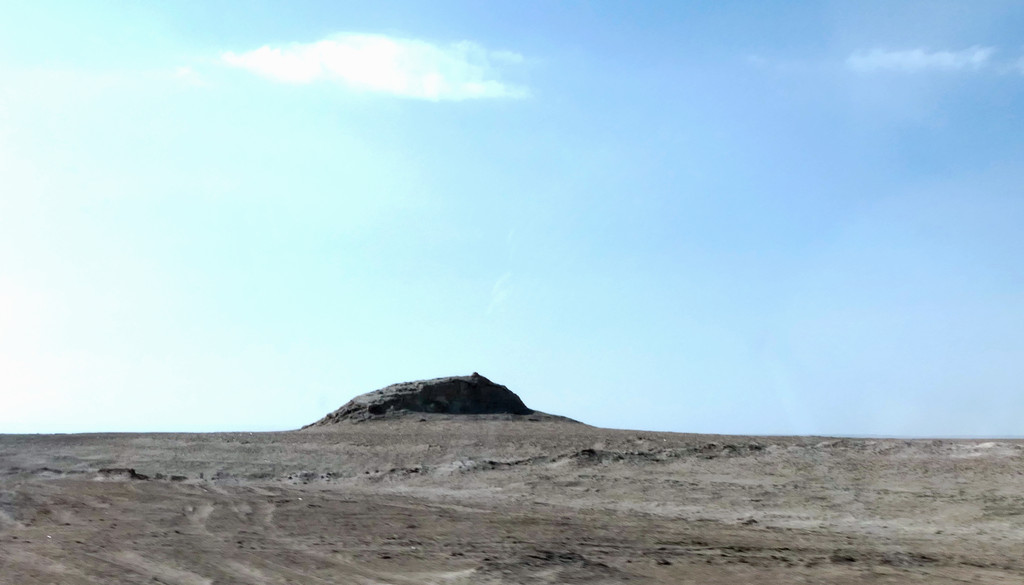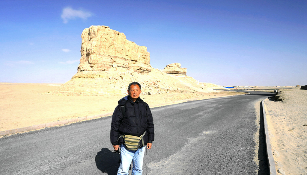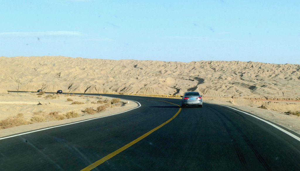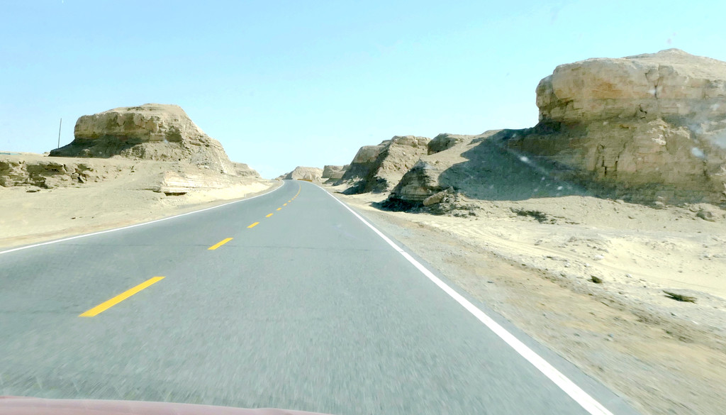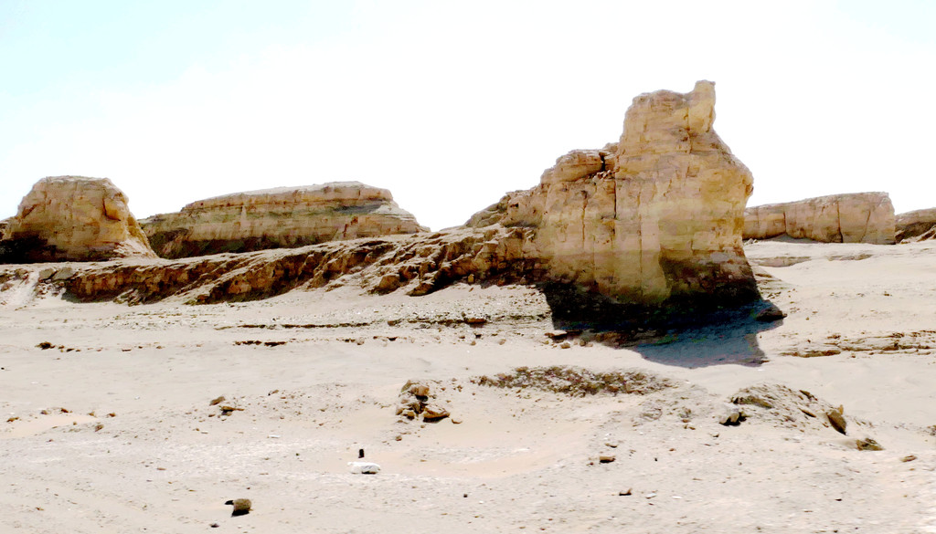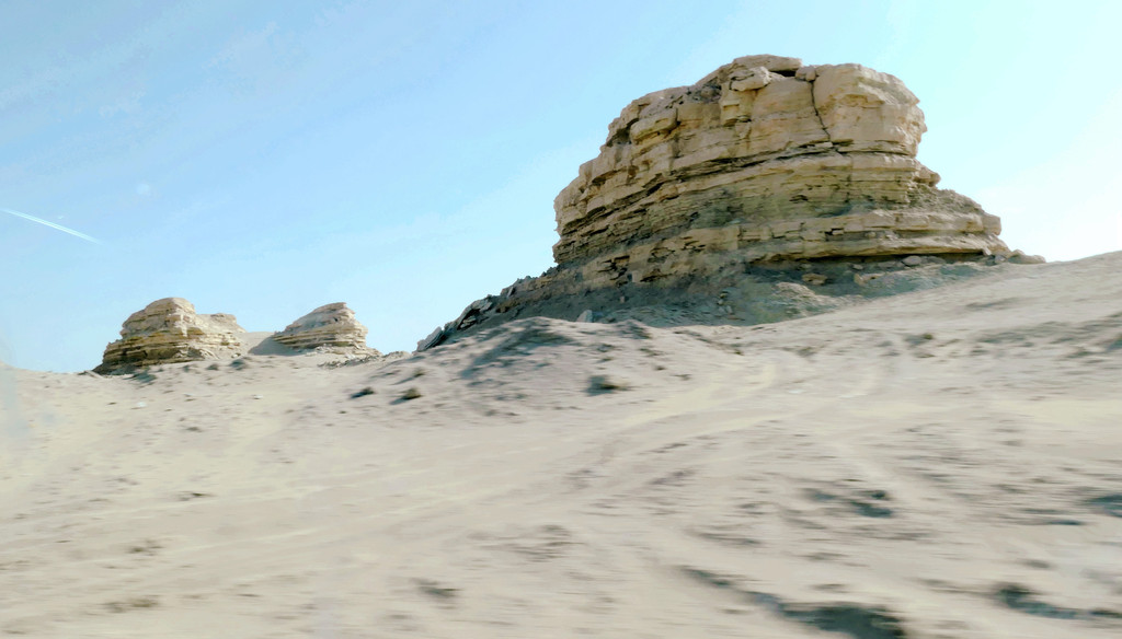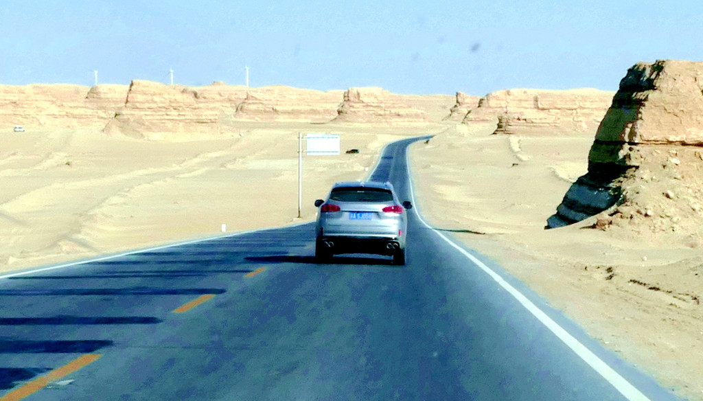 随后又开始穿越大面积的雅丹地貌区域,奇形怪状的土丘时不时地从窗外闪过,路边沙地上留有很多汽车轮迹,显然,已有不少游人都曾驱车进入雅丹区域,但我们今日时间吃紧,只是偶尔停车,拍拍照片。湖泊应该是距离公路较远,我们一路行车都是只见雅丹,未见湖水。