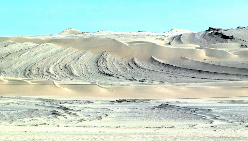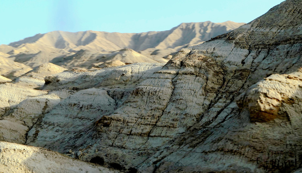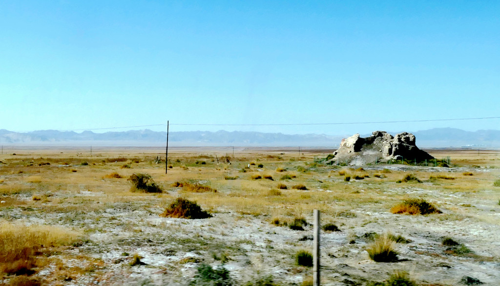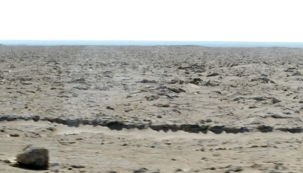 16:20离开“乌素特”,总计是逗留1小时40分钟。沿国道G315继续向东,前方又出现大片的雅丹,随后又再是一马平川。这个地方在远古时期应该是有大片的水面,雅丹土丘都明显地显露出水平沉淀的痕迹。下一个景点是“东台吉乃尔湖”,网上称其“青海版小马尔代夫”,位置就在乌素特水上雅丹景区的东侧,应该是就在前方不远处。然而,我们自打从“乌素特”出发后就一路留心观察,但却始终也没看到任何有关东台吉乃尔湖的路标,只是曾见右侧远处有一片水面,在阳光下闪闪发亮,然而,这一地段的国道却是并无任何岔道路口,只得继续保持前行。16:45驶经“青海锂业”路口,16:54又驶抵“东台服务区”,眼巴巴地看着那片水域落在我们身后越来越远。