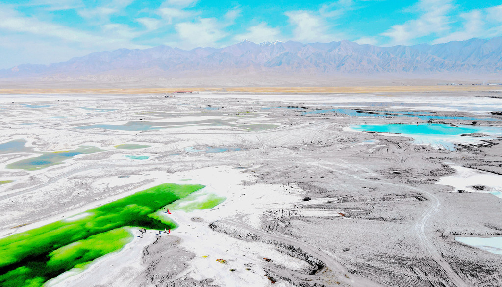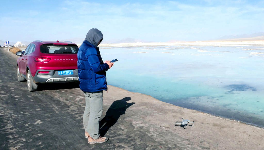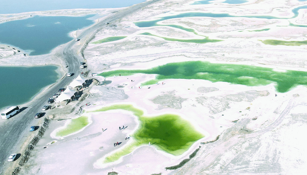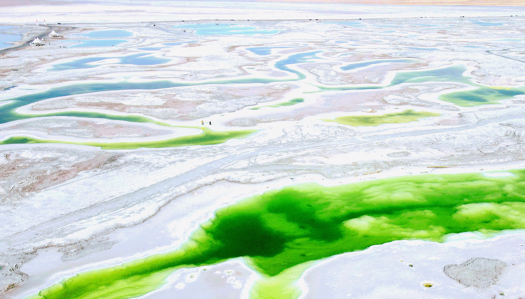 收回无人机后上路,10:13在湖畔看到非常漂亮的倒影,路边已有好几部汽车停放,我们也赶忙在此处稍停,拍拍照片。这里的右侧依旧是白色盐滩,左侧则是湖水碧绿,而且,可能是因为水中含盐浓度太高,湖面上已经不再有芦苇生长。X.J.再次放飞无人机,这个位置距离真正的翡翠群落已经不远,它们是一大群微小湖泊,色彩艳丽,好似一块块的翡翠、宝石,散落在白色盐滩之上。这一大片的彩湖群落是整个景区秀色之最,翡翠湖景区也正是因为它们而得名。