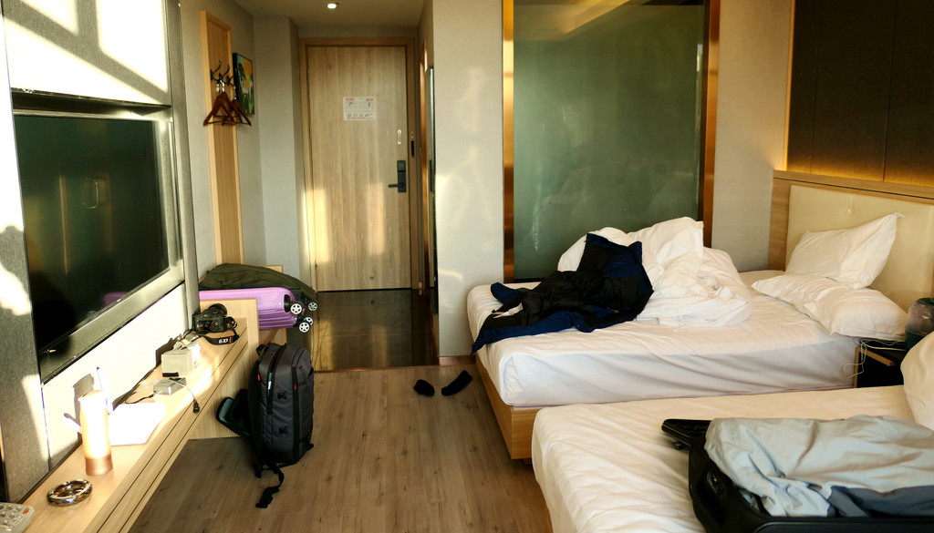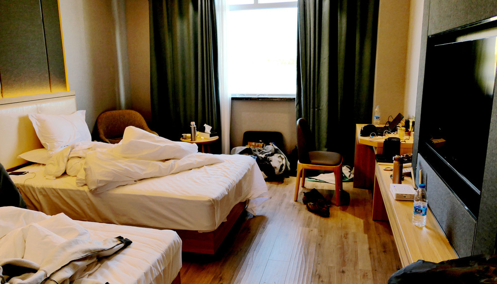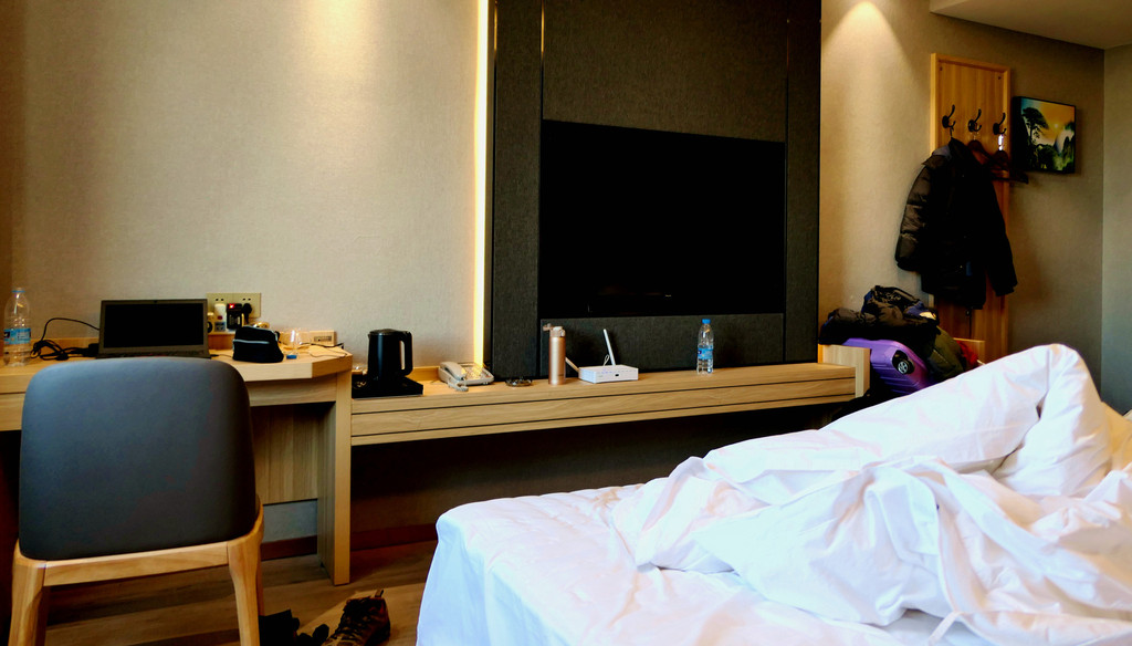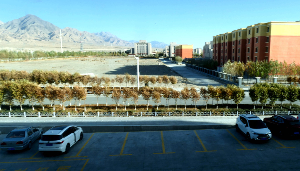 饭后直接返回晒北酒店,儿子要准备电话会议,我是先洗了个澡,然后再美美睡个午觉。年龄已过八旬,近十天的连续奔波也让我感觉有点儿疲惫,大柴旦的室外此刻已是颇冷,但宾馆房间供热给力,能够暖暖和和地躺在床上歇息半日,其实也是难得之享受。睡起后拍下几张屋里、窗外的照片,酒店应该是刚刚开业不久,感觉设施颇新,窗外的小镇风貌也是整齐、干净。