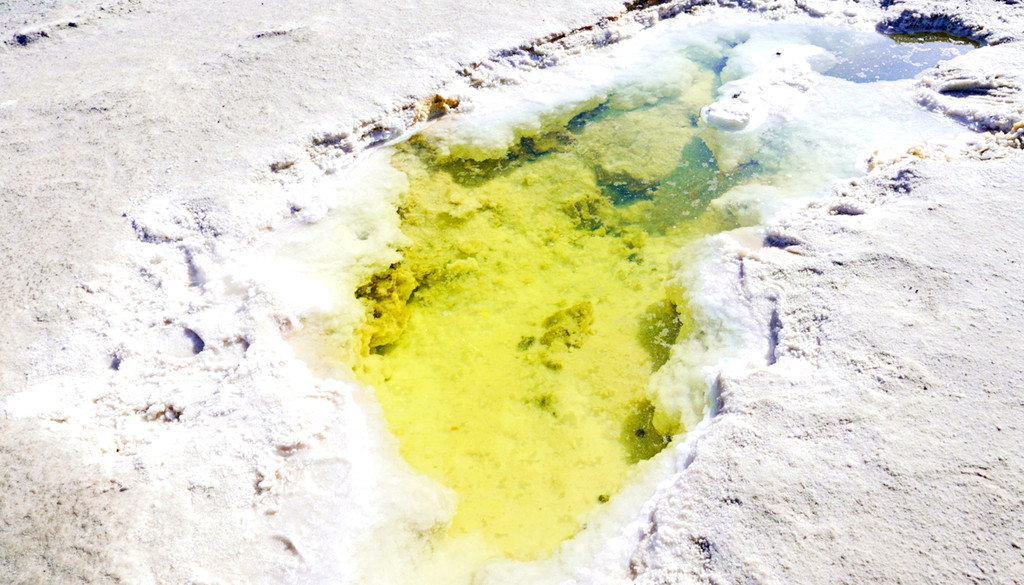 更为神奇是仅一路之隔的另外几片水面,它们与蓝色小湖近在咫尺,但色彩却是截然不同,一片片的水体清澈无比,深绿中透着淡蓝,淡绿中又泛着鹅黄,冰清玉润,美不胜收。若说刚才的那汪碧蓝的湖水好似一块巨大的蓝色宝石,那么,眼前的这几片水体就好黄色的琥珀、碧绿的翡翠,镶嵌在洁白无暇的大地之上。而且,即便是在同一块水域,其展示出来的色调也是有着魔幻般的变化,由近及远,由浅入深,水面上次第展现出鹅黄、淡青、黄绿、翠绿、碧绿、蓝绿等不同层次的色调,光怪陆离,美轮美奂。