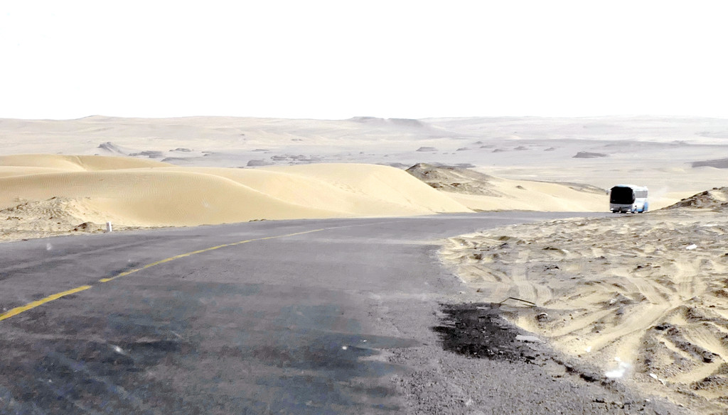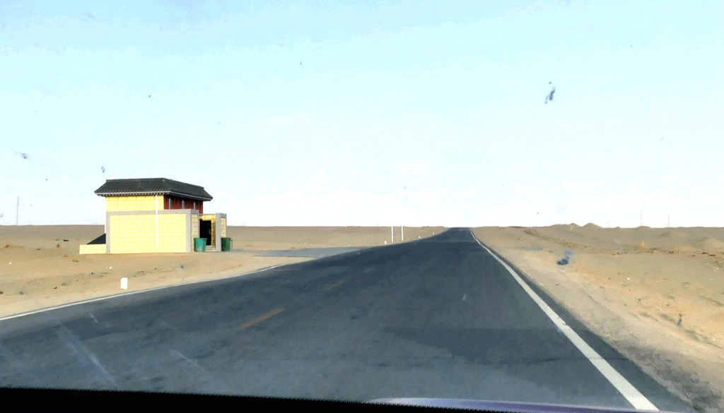 10:47驶经“老茫崖”停车区,这里原为茫崖老镇之所在,后来茫崖镇西迁,这里就只剩下一个道班,还有一间公厕。从“老茫崖”再往前就全都是沙漠、戈壁,荒无人烟,公路随着地势起伏、蜿蜒,放眼所及唯见雅丹、沙丘。