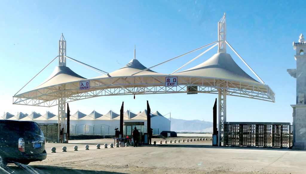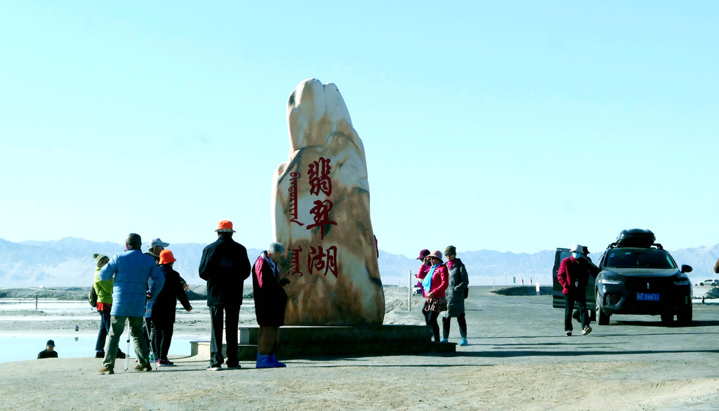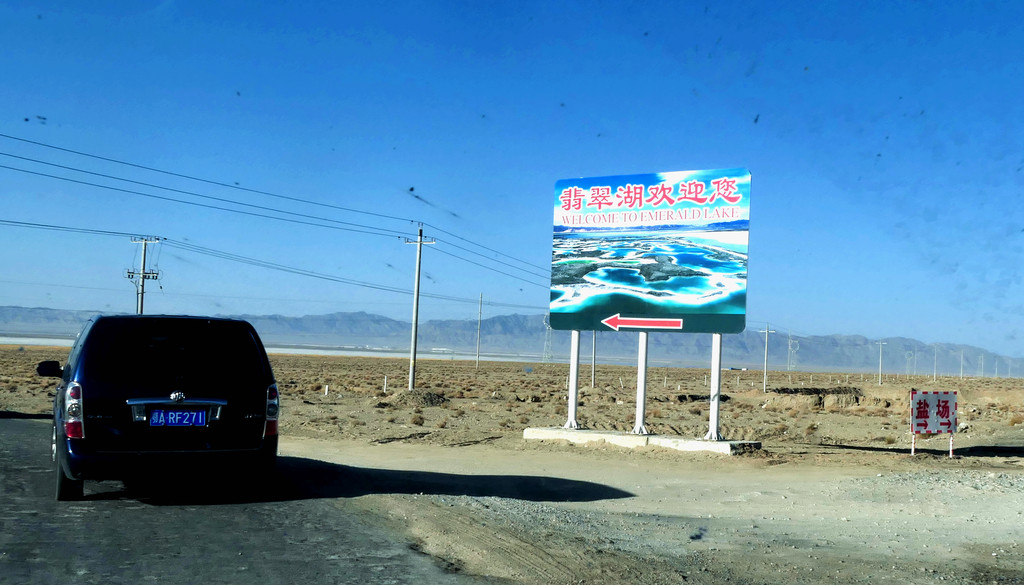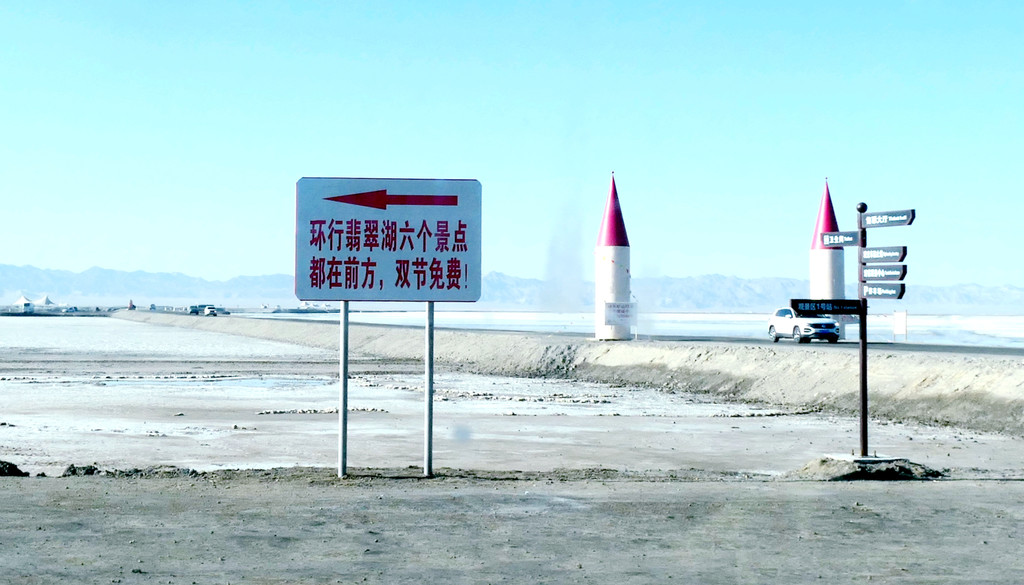 9:44抵达翡翠湖景区大门,这里原为当地化工厂之盐湖采矿区,途中也曾看到地面上有厚厚的盐层,然而,相对于茫崖的翡翠湖,大柴旦翡翠湖作为旅游景区算是相对比较成熟,大门颇显气派,内部也有明显的服务设施。自驾车可以直接进入景区,大门口张贴“双节(国庆、中秋)期间景区免费”,然而,此刻虽然假日已过,但景区依旧免费,我们没买票,也没受到任何阻拦,就直接驶入景区。