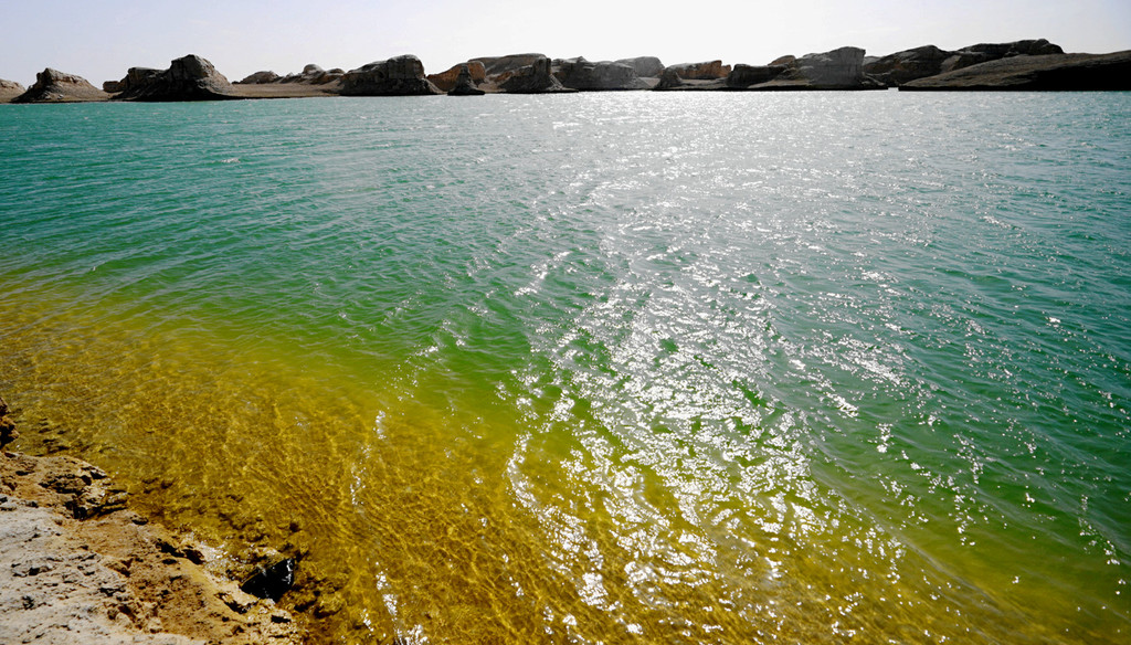 驶过西台,又是穿越一大片的雅丹,14:37驶抵“乌素特(水上)雅丹”景区,此处又称“乌素特雅丹地质公园”,其最大看点是原本应该出现在干旱地域的雅丹,在这里却是出现在一大片的湖水之中。这片湖水称“鸦湖”,位于东、西台吉乃尔湖之间,湖面上耸立着大大小小的的土丘(雅丹),高度一般在10~25米左右,最高可达50米,是举世罕见水上雅丹景观。据说,此处原本也是旱地雅丹,后来是因为台吉乃尔河改道,引来了昆仑山脉北坡爆发的山洪水,将这一大片地域淹没成为泽国,于是便造就了这片“水上雅丹”奇景。