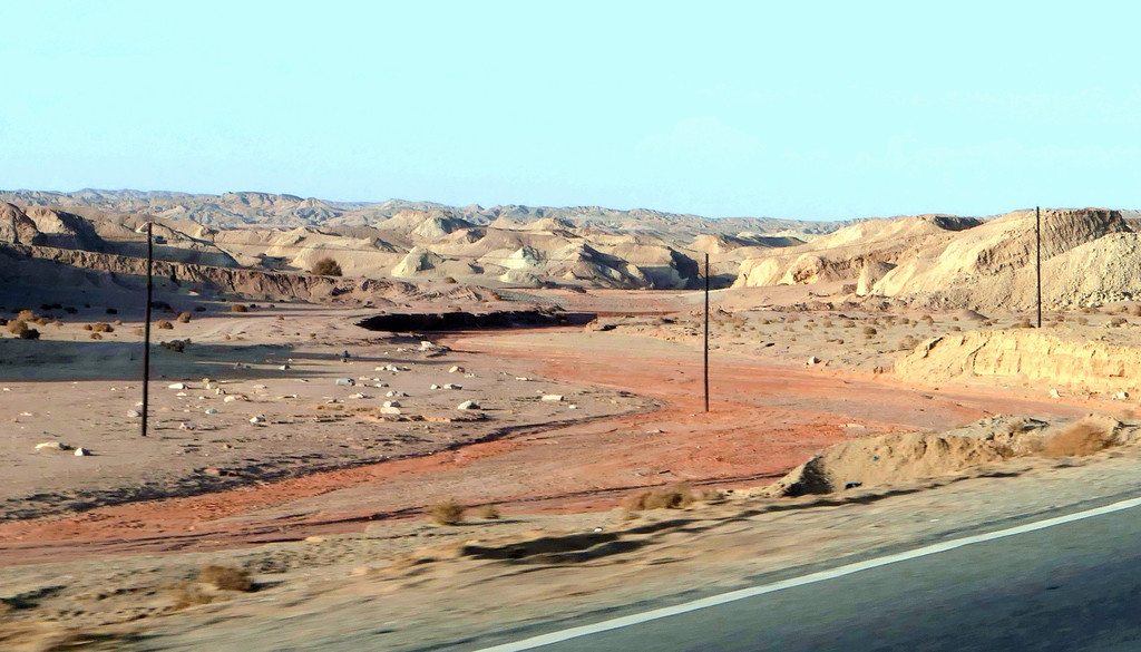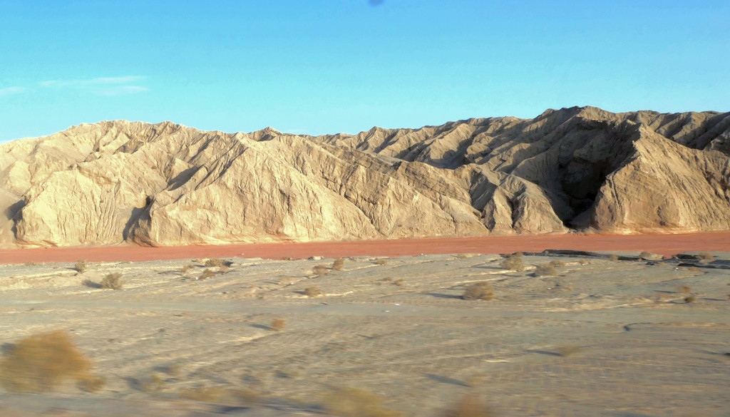 继续在戈壁滩上行驶,17:55看到右侧远处有一长列的发电风机,然而,与其他地方都是大片的风机阵列不同,这里的风车只有一个长列,估计是尚在建设之中。17:56开始进入山区,国道也就不再笔直,而是沿着一条干涸的河道,蜿蜒翻越山梁。这条干涸河床的底部全为红色,但周边的山岭却是均显黄褐,色彩差异泾渭分明,显然,这条河的上游应该是曾穿越红土地带。