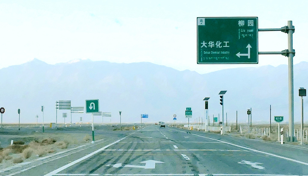 18:36距离“大柴旦”还有32公里,前方出现一道山梁,伴随戈壁、黄沙,几乎寸草不生。驱车经由“铁石观隧道”穿越山梁,山外又是一片平川。18:48通过“大华化工”路口,此处距离大柴旦还有12公里。青海的化工企业多数是跟盐湖有关,这家企业的主营业务也是开发大柴旦湖的钾肥、锂、硼资源。