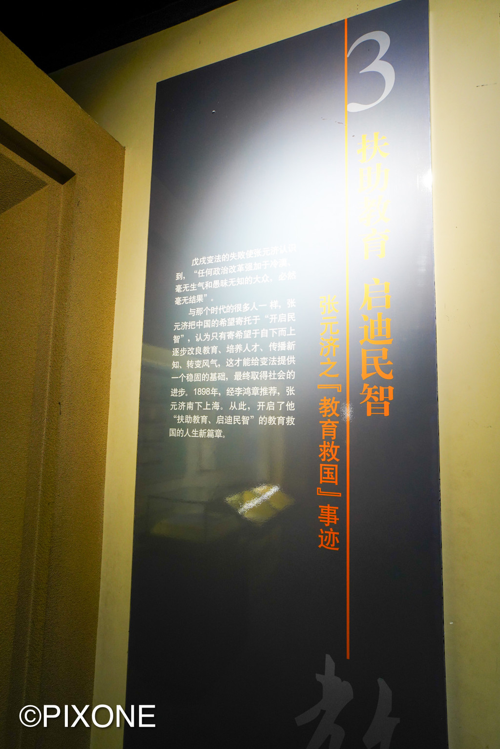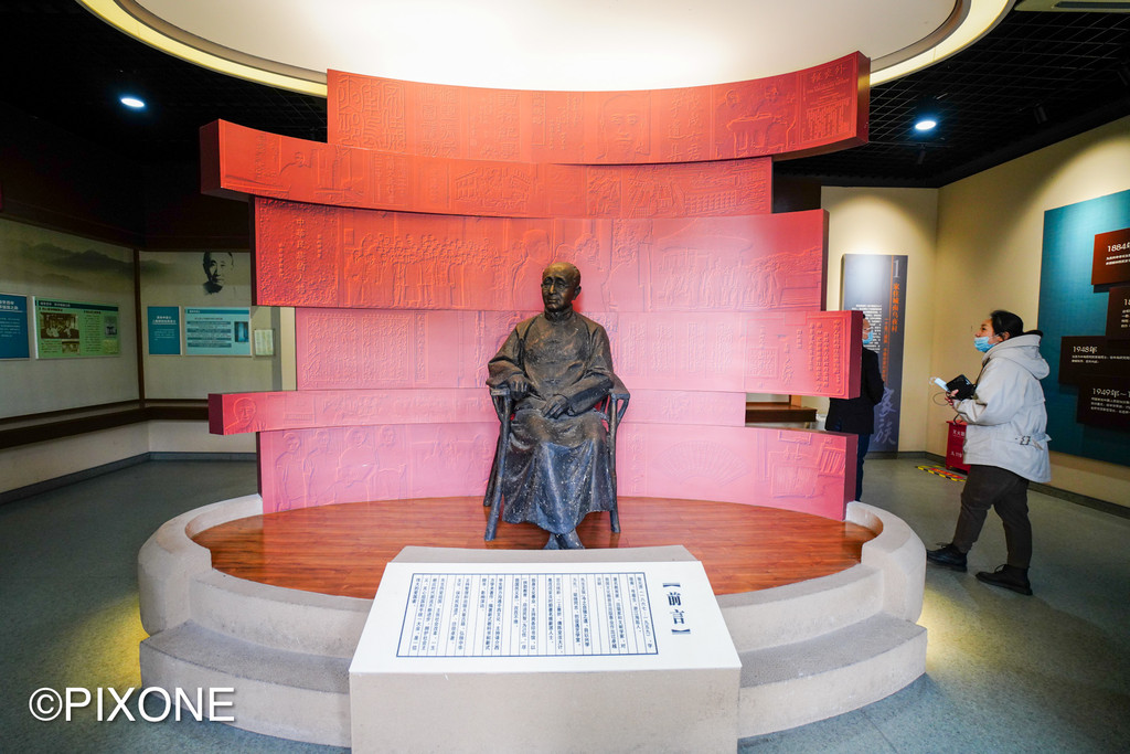 纪念室内有张元济半身汉白玉雕像,陈列着张元济的著作、手稿和生平事迹资料。