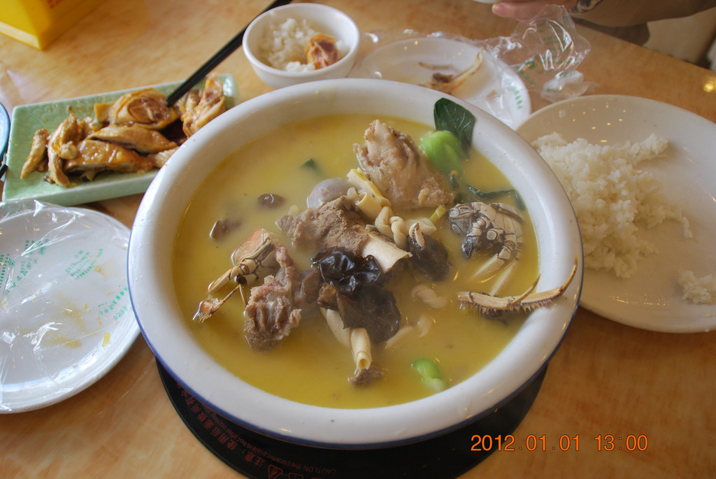 中午的饭很简单,一个汤,再加上一盆油炸鱼及鸡。汤很鲜,里面是肉骨头与大闸蟹,价格34元。