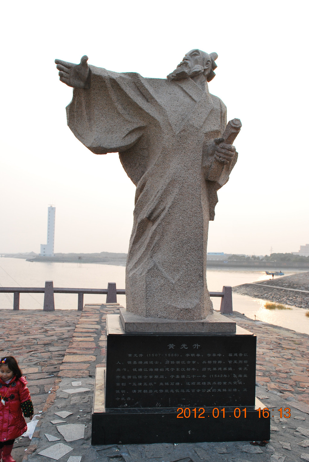 一尊人物雕塑,纪念明朝黄光升。黄光升不是浙江人,是福建晋江人,他在浙江任官期间,在海盐首创“五横五纵”的鱼鳞石塘,至今仍被保存。