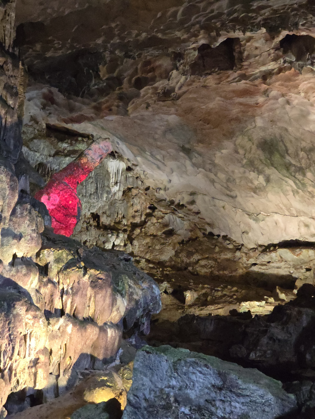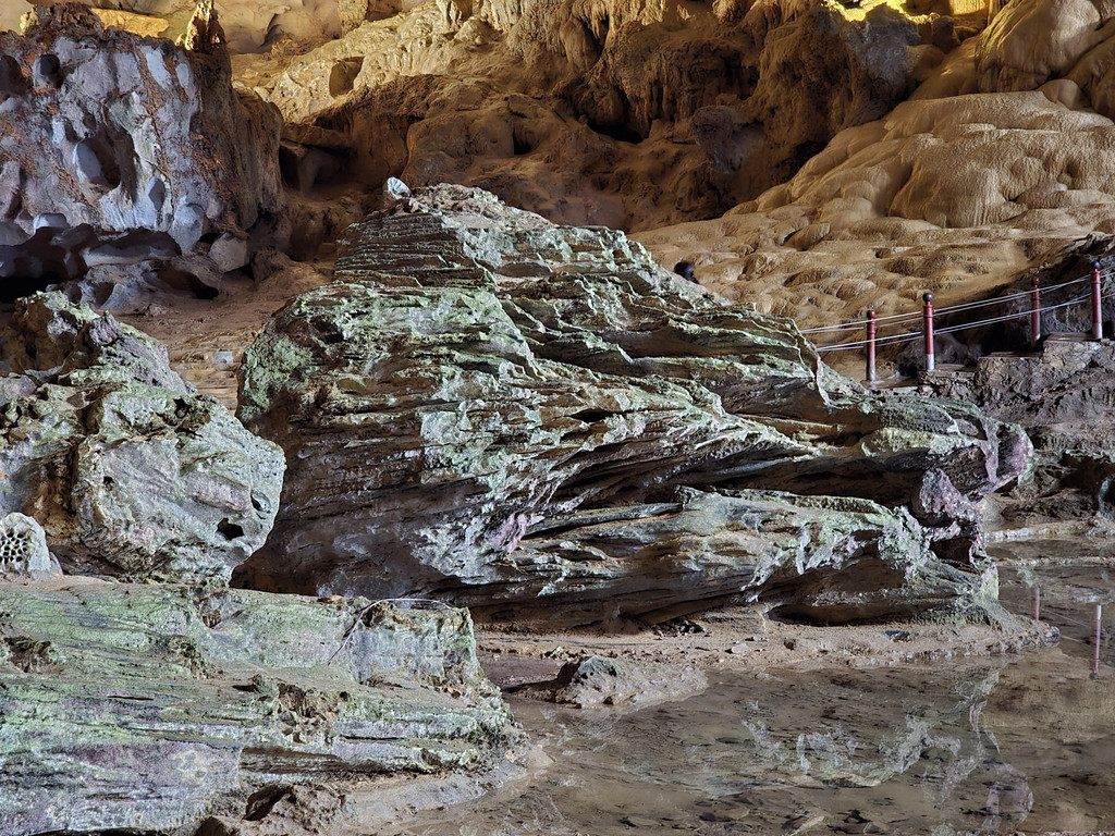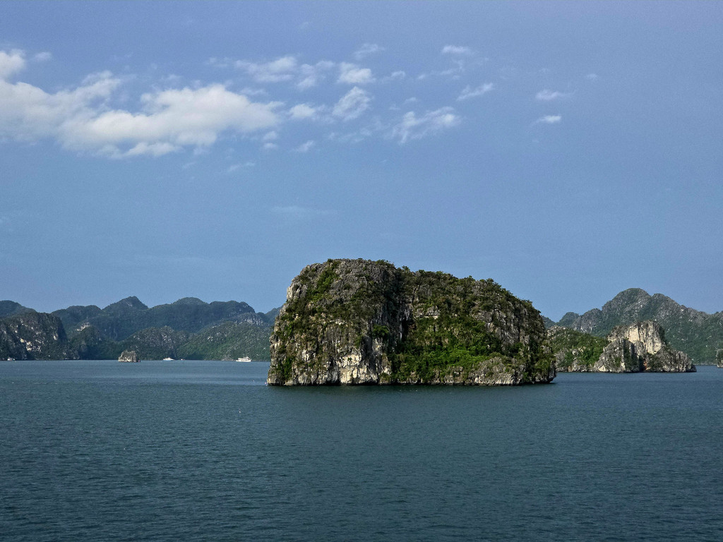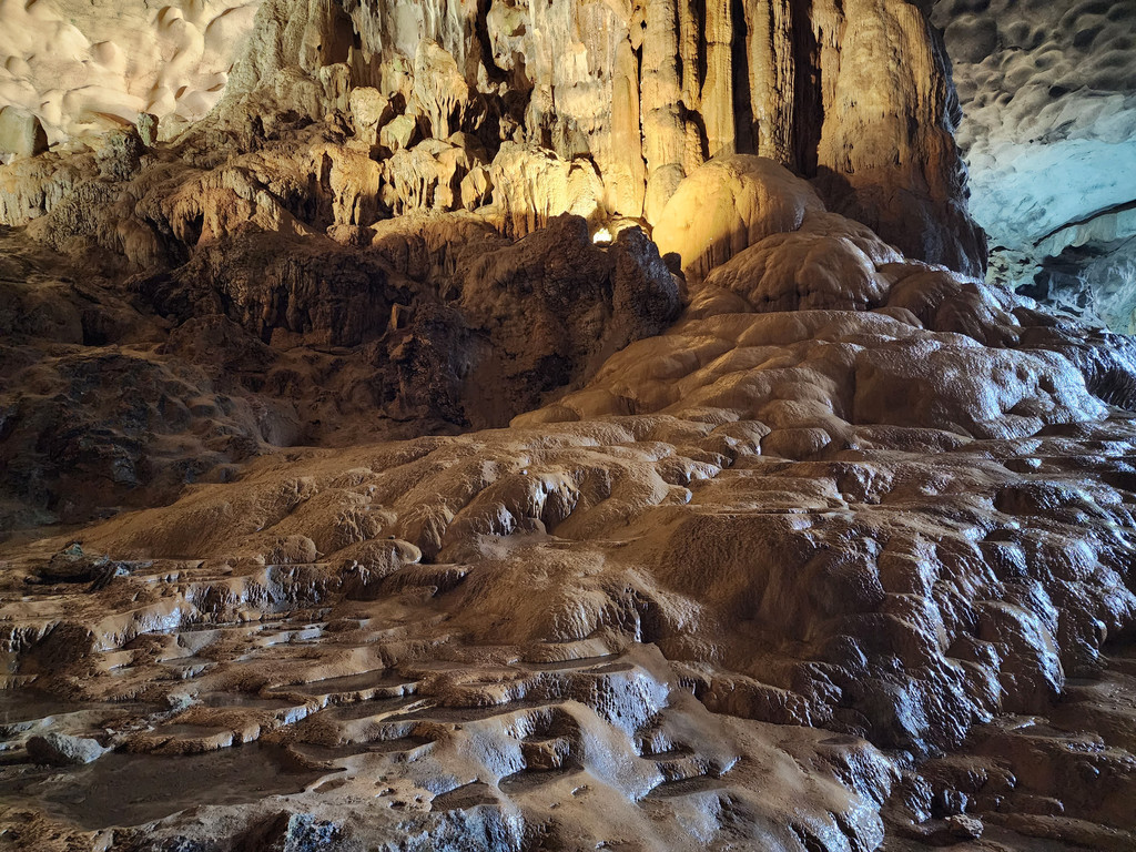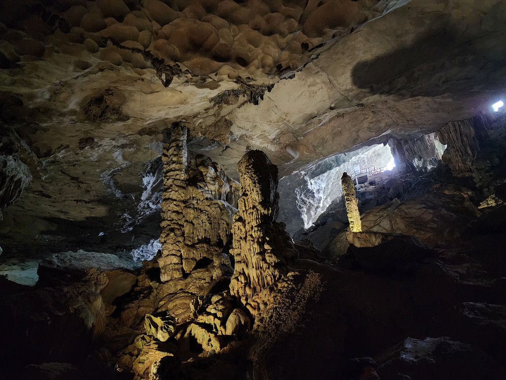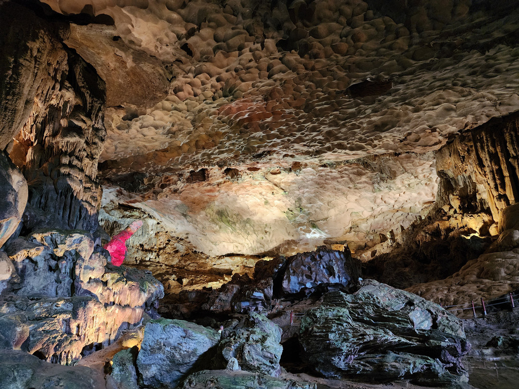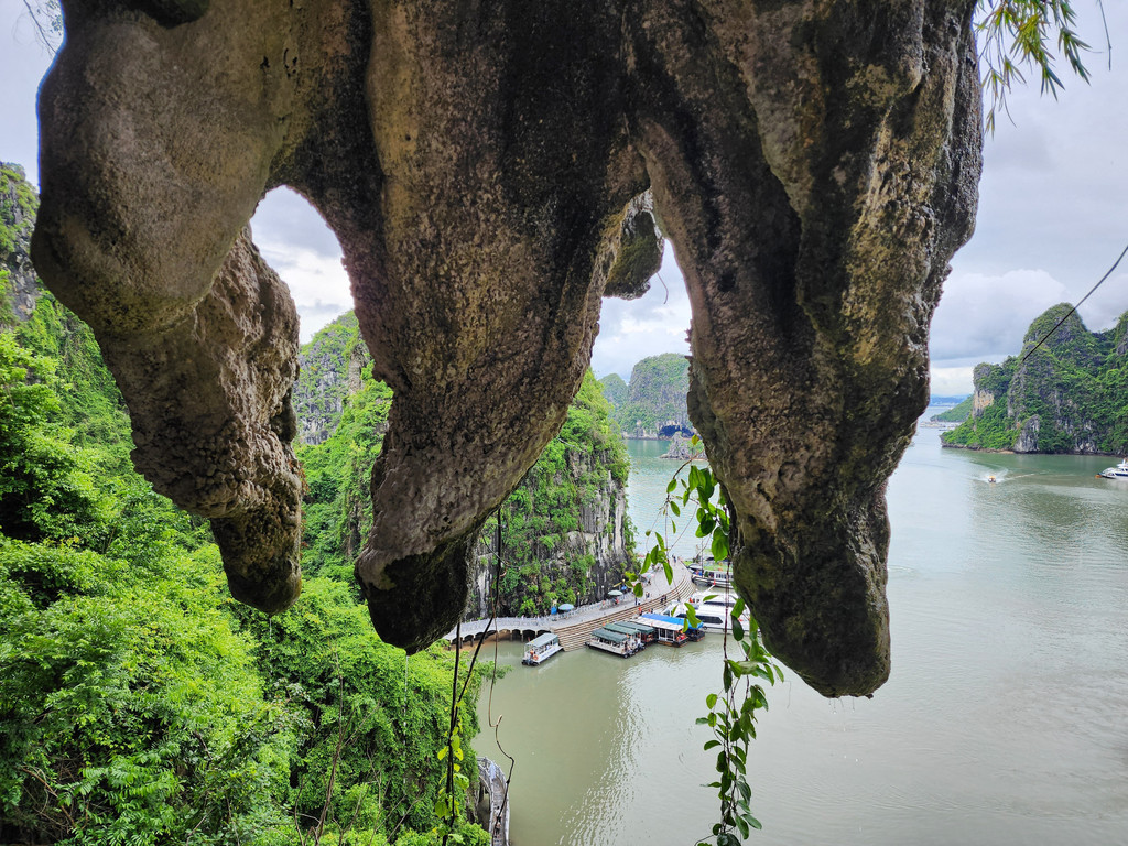 饱餐之后,稍微歇息,就出发下午的行程,由于船体比较大,所以前往其他地方都需要登上快艇。我们先前往Sung Sot Cave,这个钟乳石溶洞藏在了半山腰,需要稍微走几百级楼梯上山,不过由于游人众多,我们都在等人流行进,并没有感觉到任何疲累,反倒是略微拥挤,终于可以进入溶洞,里面的面积不小,充满了整个山体,也设计好了可以游览大部分地方的步道,造型各异的石笋,石柱随处可见,有一处石头的造型比较像一只大龟,有少数的石柱上还有水流淌,形成了小小的钙华,洞内有各色灯光照射,至少不会让游人摸黑行走。而这里的山洞顶部,除了吊着的钟乳石,还有很多圆形的小洞。离开洞穴,走下山期间有一片平台,可以眺望下龙湾,不过这里被山峰包围着,景致不算开阔。