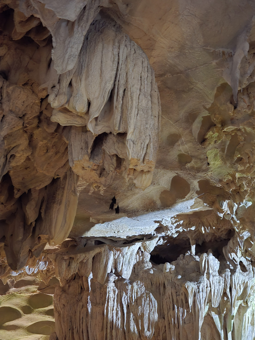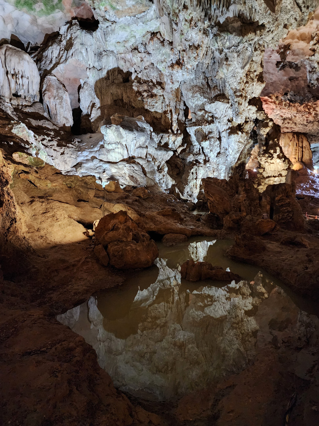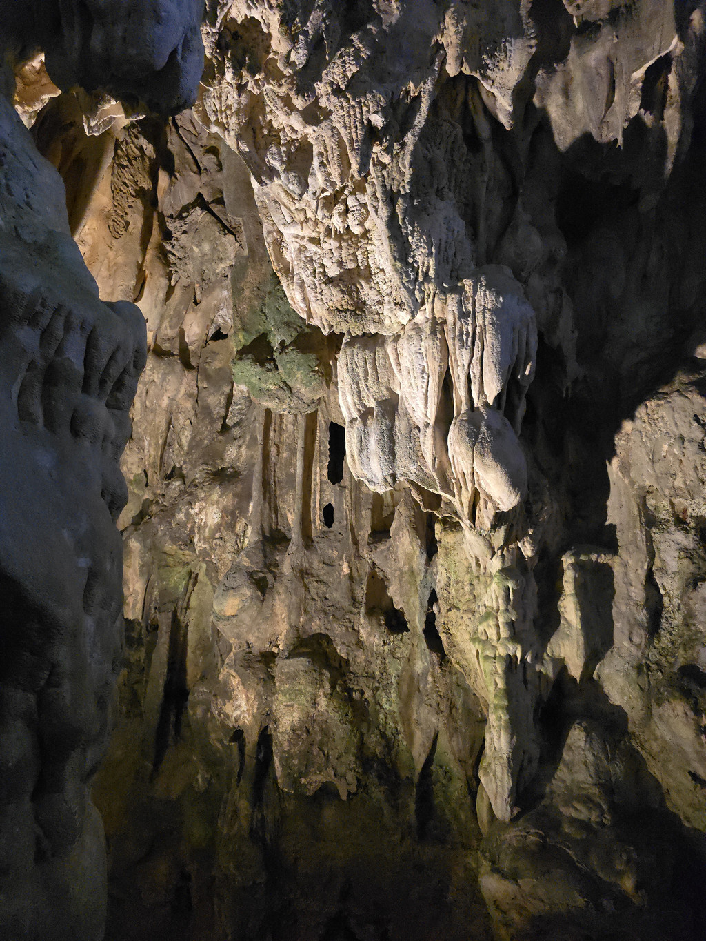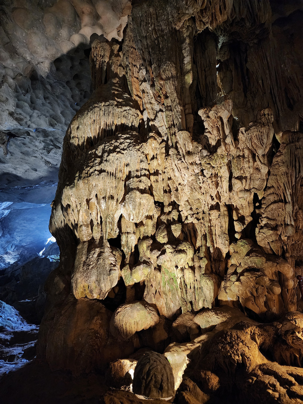 饱餐之后,稍微歇息,就出发下午的行程,由于船体比较大,所以前往其他地方都需要登上快艇。我们先前往Sung Sot Cave,这个钟乳石溶洞藏在了半山腰,需要稍微走几百级楼梯上山,不过由于游人众多,我们都在等人流行进,并没有感觉到任何疲累,反倒是略微拥挤,终于可以进入溶洞,里面的面积不小,充满了整个山体,也设计好了可以游览大部分地方的步道,造型各异的石笋,石柱随处可见,有一处石头的造型比较像一只大龟,有少数的石柱上还有水流淌,形成了小小的钙华,洞内有各色灯光照射,至少不会让游人摸黑行走。而这里的山洞顶部,除了吊着的钟乳石,还有很多圆形的小洞。离开洞穴,走下山期间有一片平台,可以眺望下龙湾,不过这里被山峰包围着,景致不算开阔。