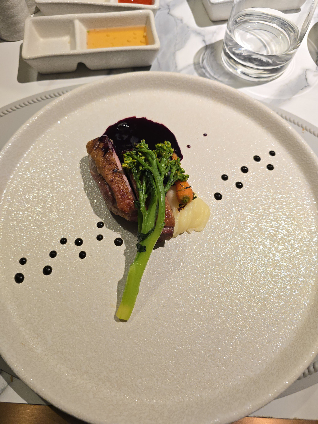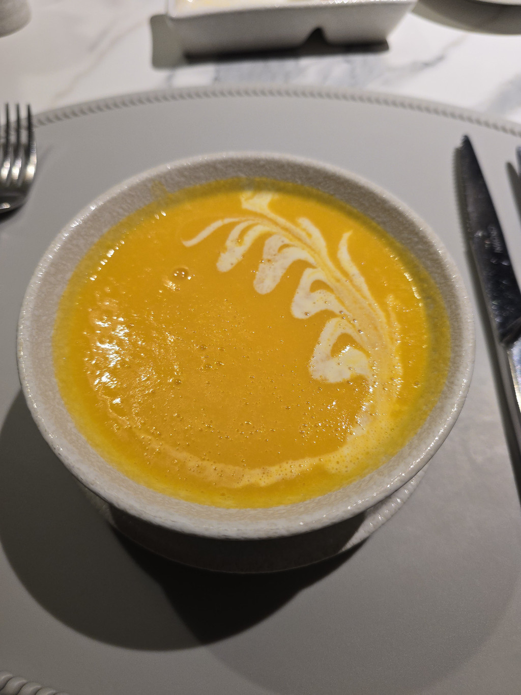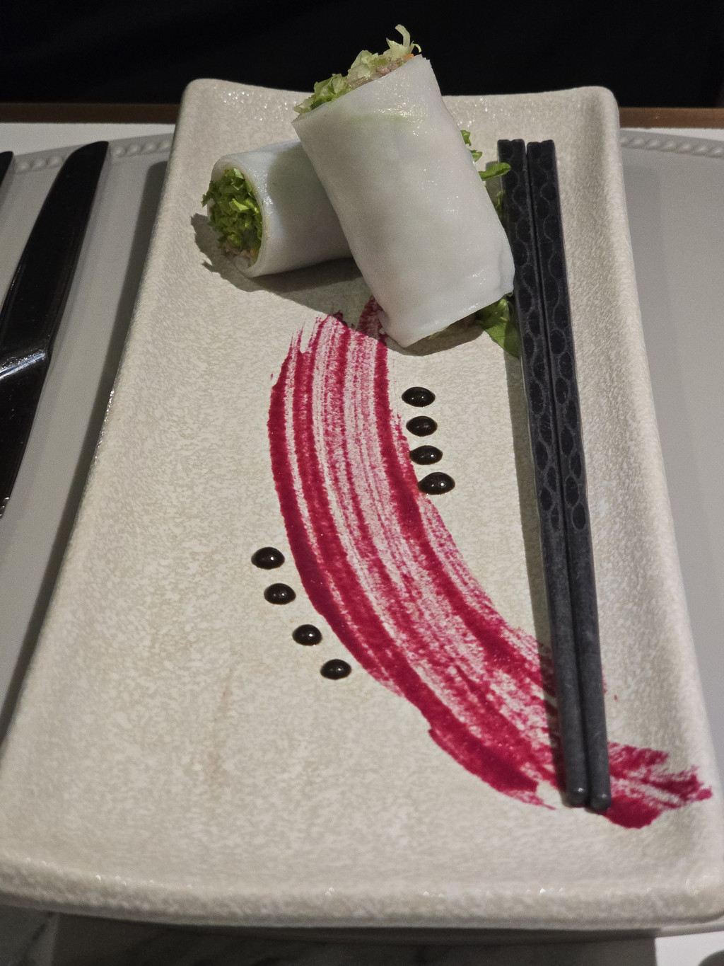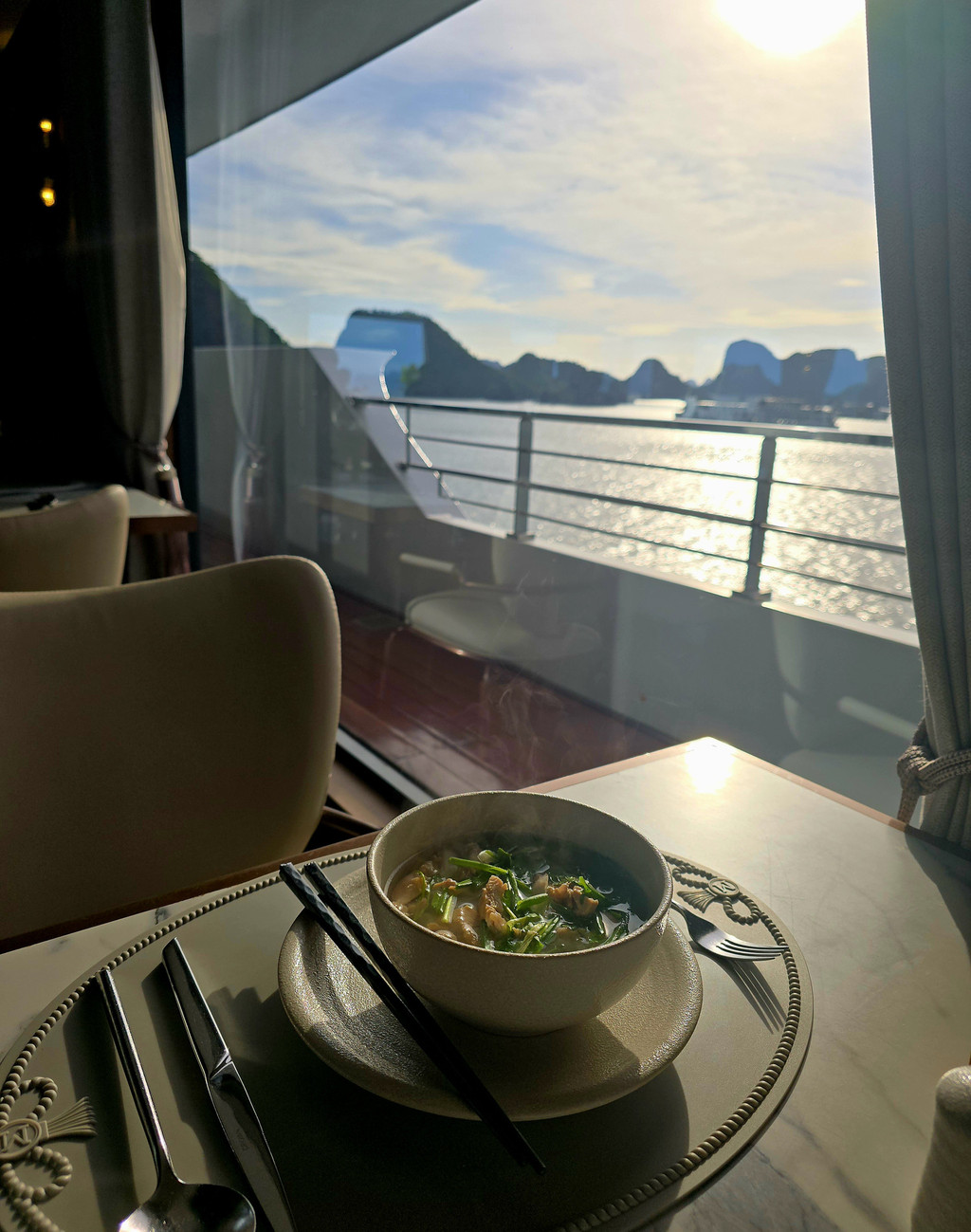 邮轮上的时光总是安逸舒适,停泊水面的周围也被群山环抱,估计也不会面对海上狂风巨浪。不知道是不是因为周末,海面上停泊的邮轮和船上的客人都比前一天明显增多。晚餐时,我们的座位就移到了窗边,今天的晚餐是六道菜,不过今天的菜式就更有越南特色,例如前菜就是越南春卷。南瓜汤,浓稠香滑。鸭胸,皮的部分香脆可口。不过海鲈就过熟了。