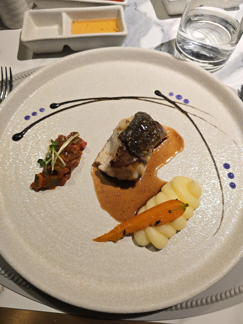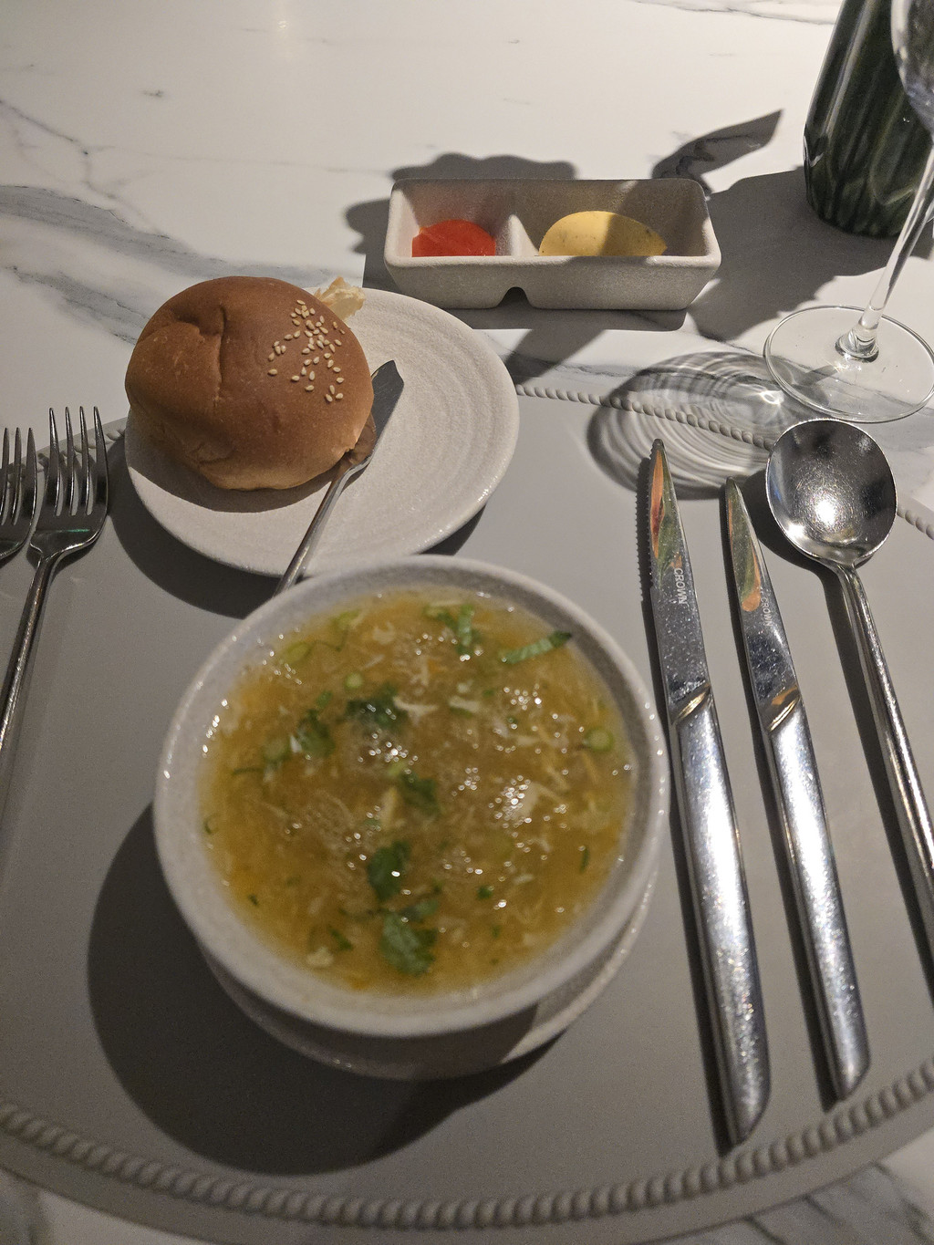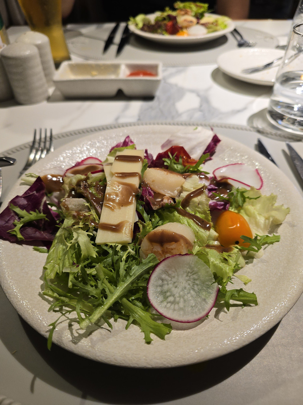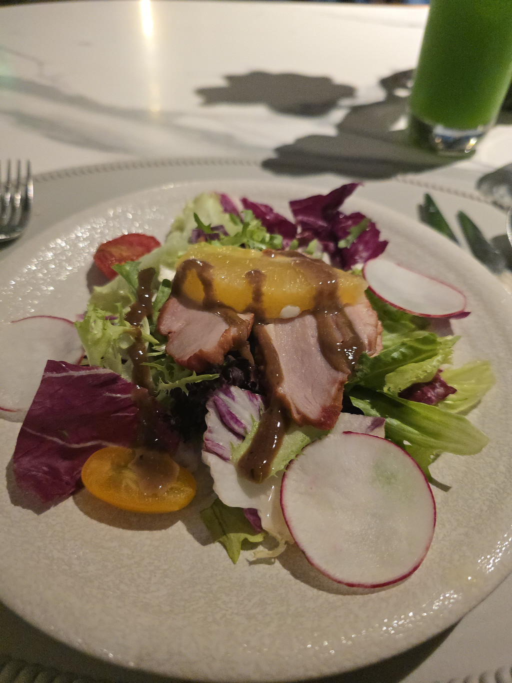 邮轮上的时光总是安逸舒适,停泊水面的周围也被群山环抱,估计也不会面对海上狂风巨浪。不知道是不是因为周末,海面上停泊的邮轮和船上的客人都比前一天明显增多。晚餐时,我们的座位就移到了窗边,今天的晚餐是六道菜,不过今天的菜式就更有越南特色,例如前菜就是越南春卷。南瓜汤,浓稠香滑。鸭胸,皮的部分香脆可口。不过海鲈就过熟了。