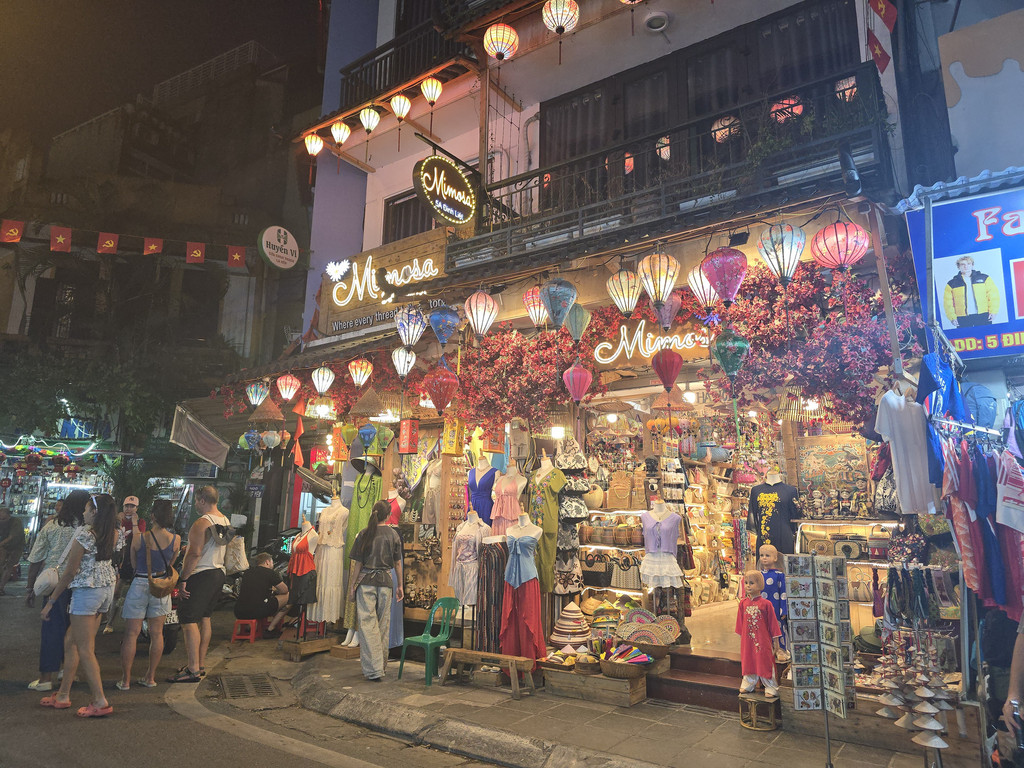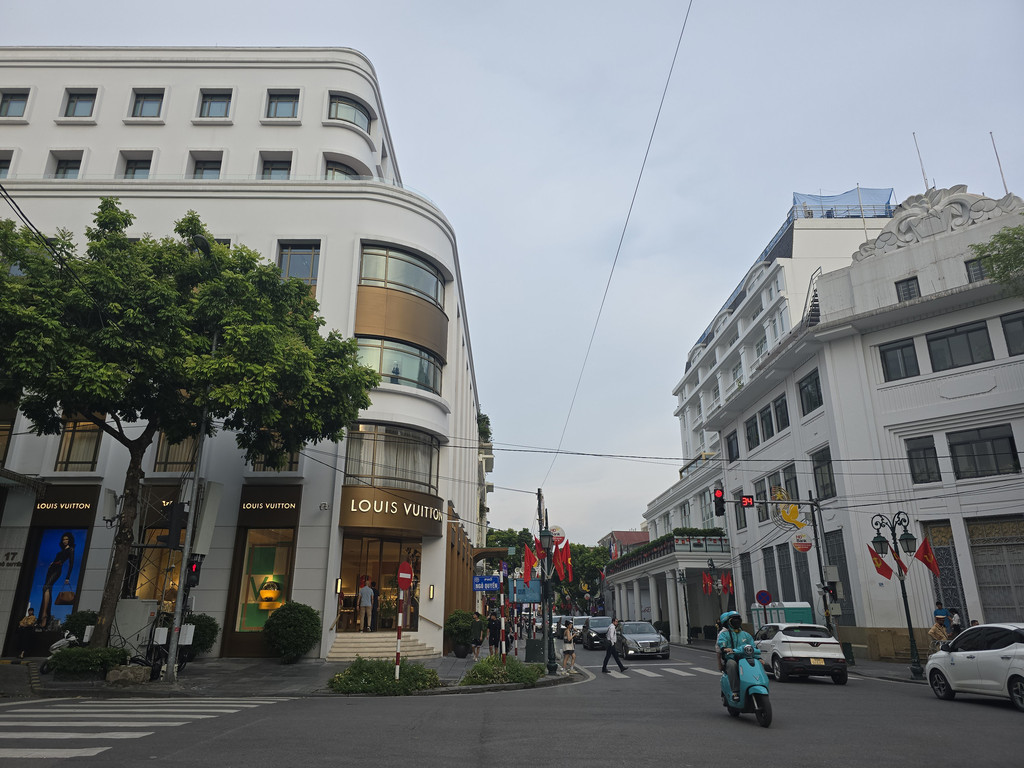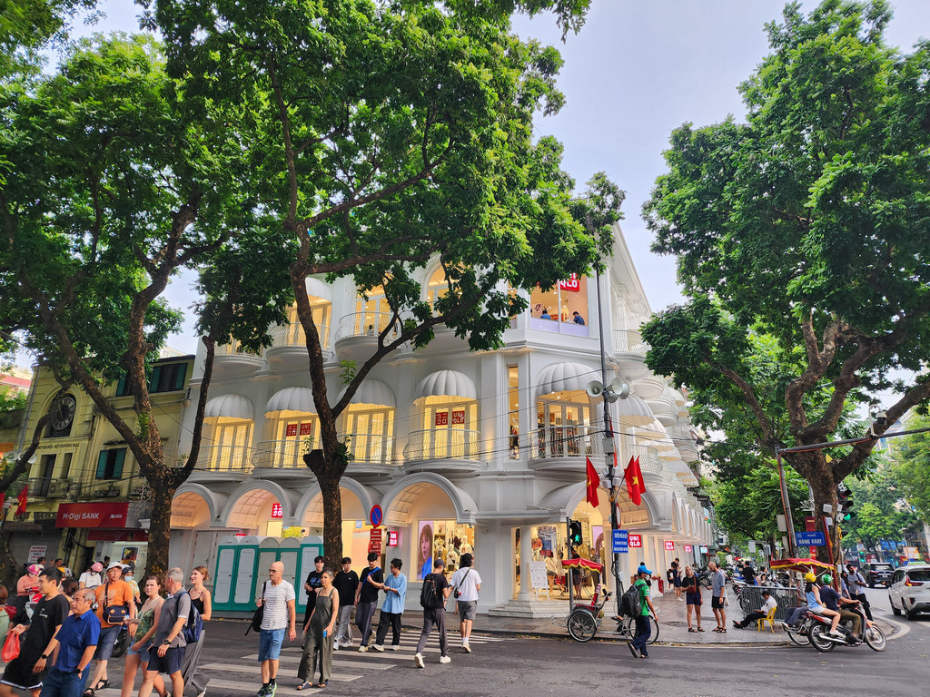 餐后,我们先去走走Hang Trong还剑湖,是河内老城区中心区域的一个小湖,湖边除了行走而过的游人也是很多的本地人休闲之处。湖的旁边有很多欧陆风格建筑,其中一座被用作UNIQLO的位于十字路口的白色建筑很吸引眼球,另外这里很多Cafe也是类似我们曾经在巴黎所见的,座椅在店门外,而且是面向街道的,不过这里有比较多的摩托车,空气质量一般。之后沿着P. Hang Khay,向东走,就会在一路上看到Sofitel Legend Metropole Hanoi,河内大剧院等有特色的法式建筑,甚至连一个路边的食街,建筑都犹如欧洲的旧式市场。行走在这段路之中,有种时空错乱的感觉,因为一路上除了有色彩不同的十九世纪法式建筑,还有各种二十世纪中才建成的方块型的三四层楼高的民居,似乎是欧洲乱入了河内。