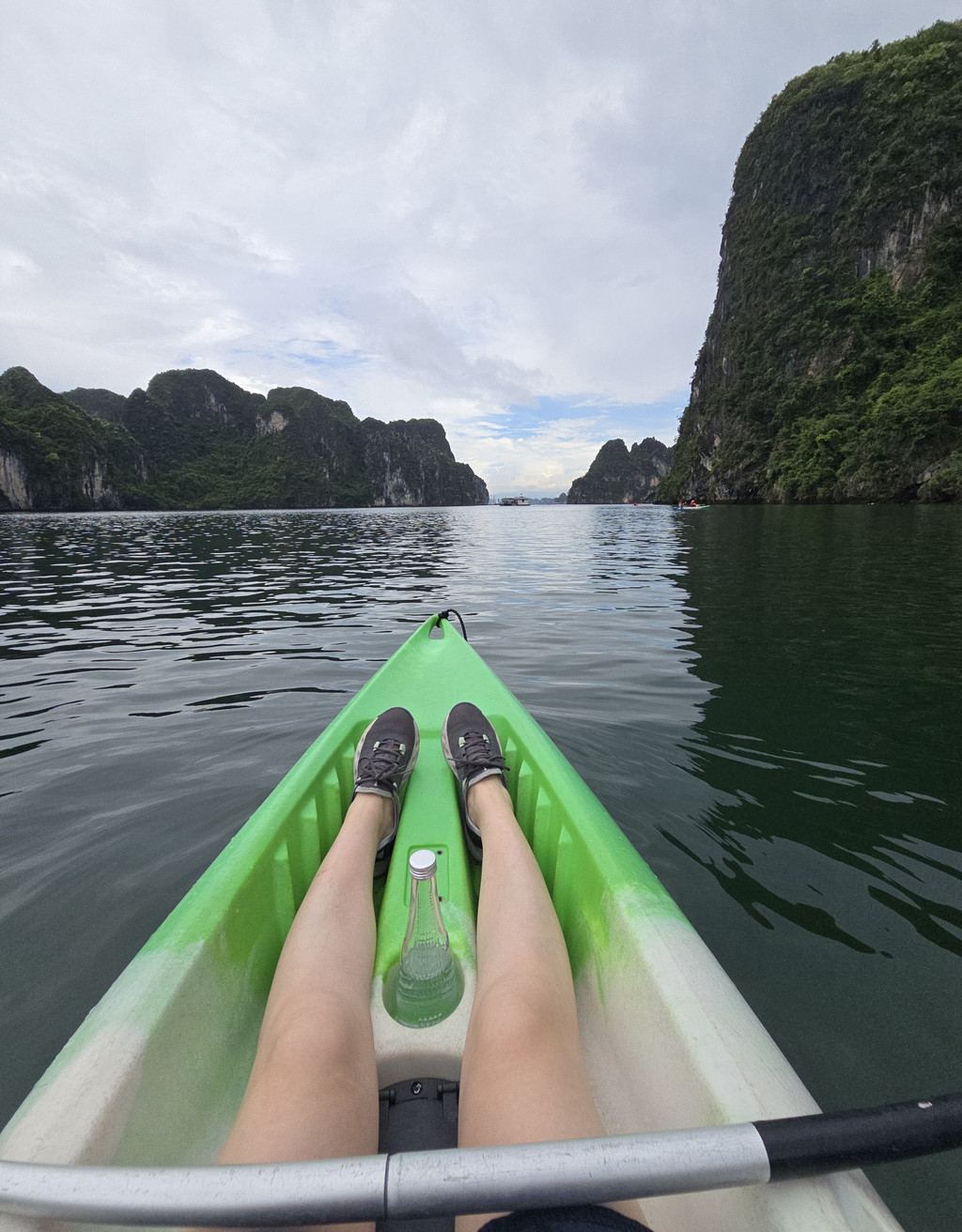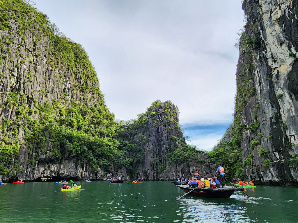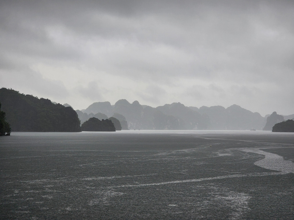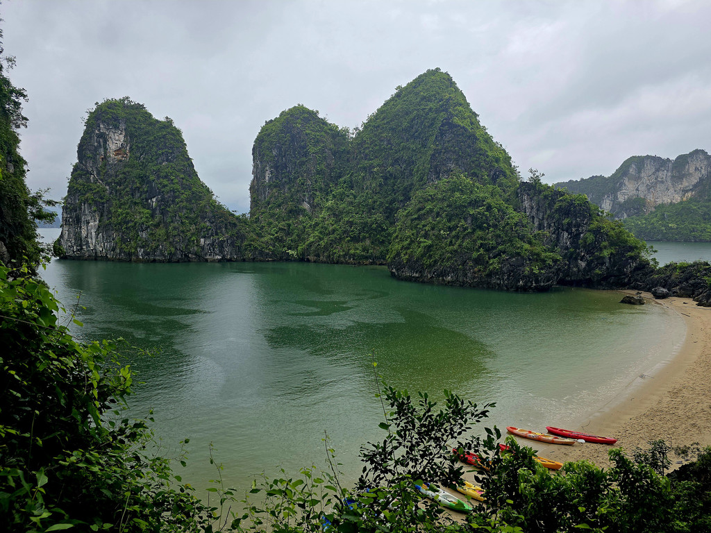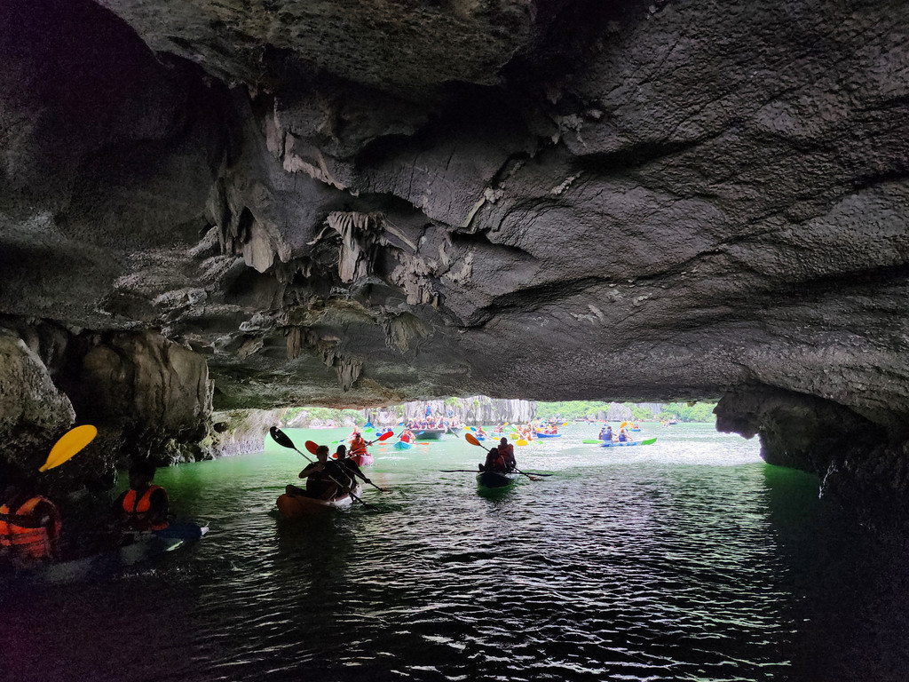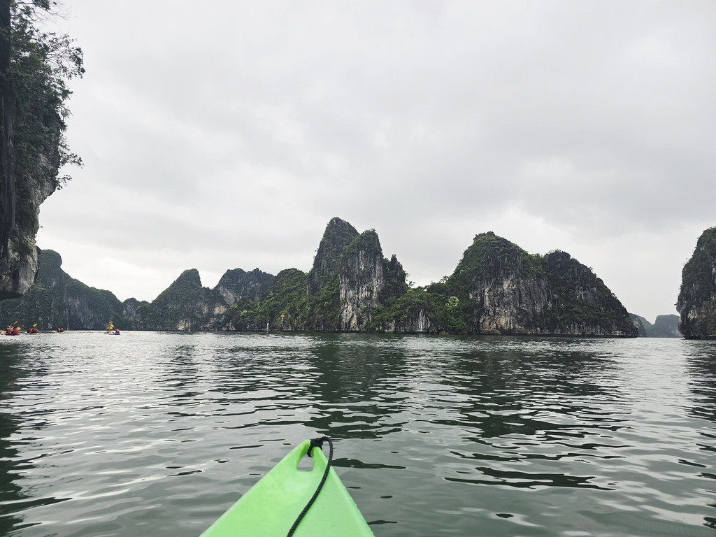 当我们到达Trinh Nu Cave附近时,雨暂时停了,趁着此时风平浪静,我们在这里需要划上约半小时的Kayak,前往洞穴所在的山体,这个钟乳石洞的面积就很小,两边的洞口几乎能够相互对望,不过洞里的角落有两块接近人型的石头,而导致这里藏着一个当地的浪漫传说,洞中间还有一块被流水洗刷得闪闪发光的光滑石头,在黑暗的洞穴中,的确有如天上的点点星光,而且这里洞顶还栖息着不少的蝙蝠。洞穴外的沙滩和海水还算干净,即便是阴雨天气,还是可看到水的清澈,应该是得益于这里的游人相对较少。当我们准备离开时,或许上天也感动于这里的传说,雨又重新开始下起来,初时还是轻柔的,当我们离开沙滩一段距离时,雨点明显变大了,不多时便是大雨倾盆,这时我们在路途的中间,一旁是石灰岩山体,另一旁是水面,回头虽然略近,但是不知道风雨是否会更加飘摇,所以我们只能拼力划向码头,不一会便是全身湿透,被雨水和汗水一同浇灌,所幸风不算太大,引起的浪只是微小,我们一人负责提供前进动力,一人调整方向,真正的风雨同舟,虽然途中几乎脱力,但是方向正确,终究还是可以抵达目的地。虽然人面对大自然是渺小的,但是同心协力还是可以增加面对风浪的勇气的。上游船时,船员为每个人都准备了干浴巾,并关闭了船舱里的冷气,浴巾虽然不能完全擦干身体,至少可以避免着凉。