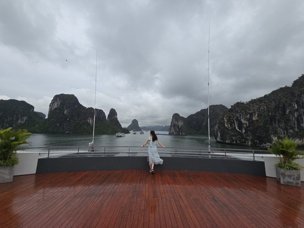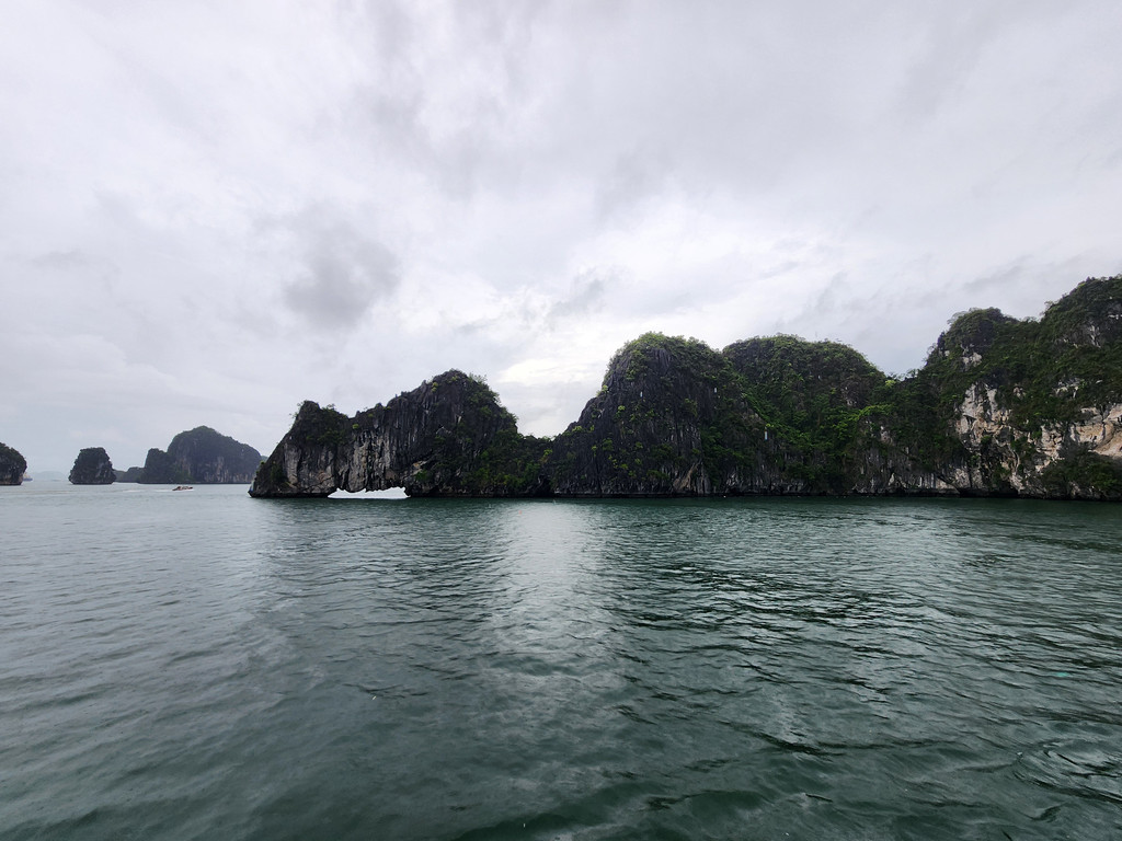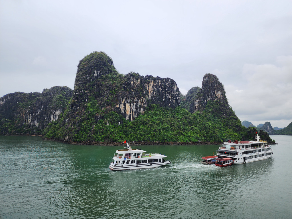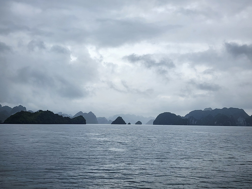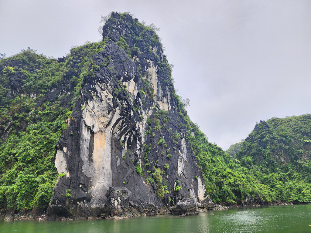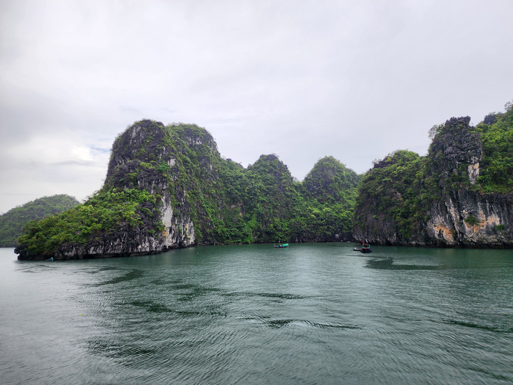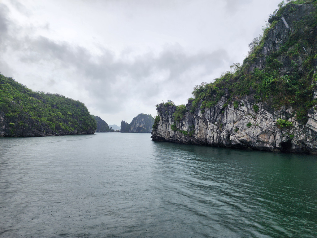 我们今天白天的行程需要换乘到另一艘一日游的游船,以方便深入位于下龙湾南部的Lan Ha Bay区域,同时也因为我们乘坐的邮轮要回到了下龙湾邮轮码头附近去接送游客。游船有三层,一层大半部分都是玻璃窗密封的船舱,因为一直开启着空调,靠近船尾有卫生间和厨房;二层则大多是半开放的空间,可以享受自然的风,也可以不受限制的观看景致;可惜一直阴雨,三层的露天甲板基本无法到达。脱离了大部分邮轮的聚集地,只有两三艘船行走在相对狭窄的水道,并不会显得拥挤。一直的阴雨时大时小,虽然没有蓝天白云下的山清水秀,但是烟雨蒙蒙令整个景色成了水墨画卷,同样是美丽的。可惜整个下龙湾的海水中总是不时会漂着各种垃圾,对于水体和环境的保护,在这里还有很大的距离。