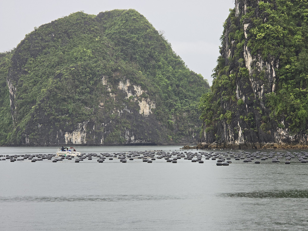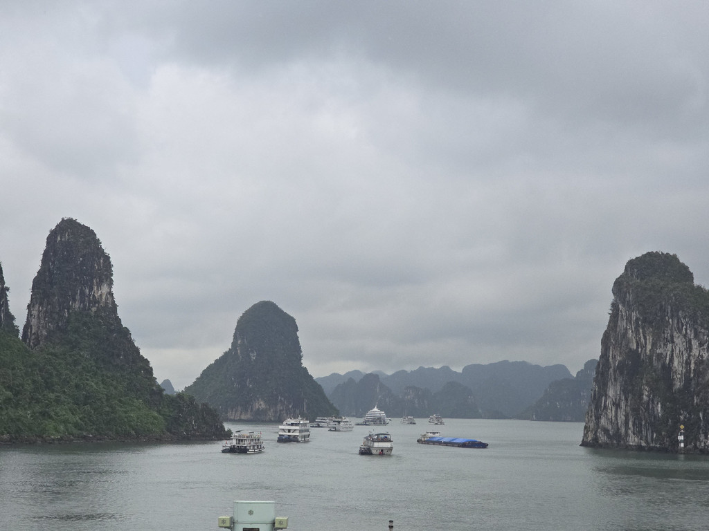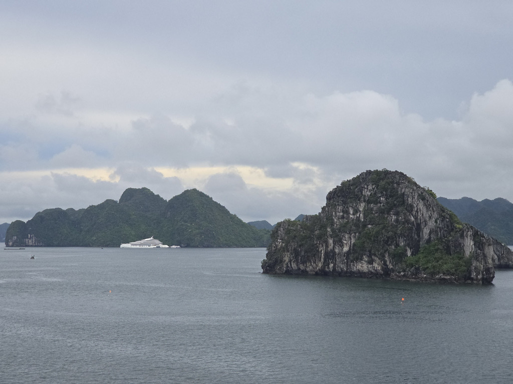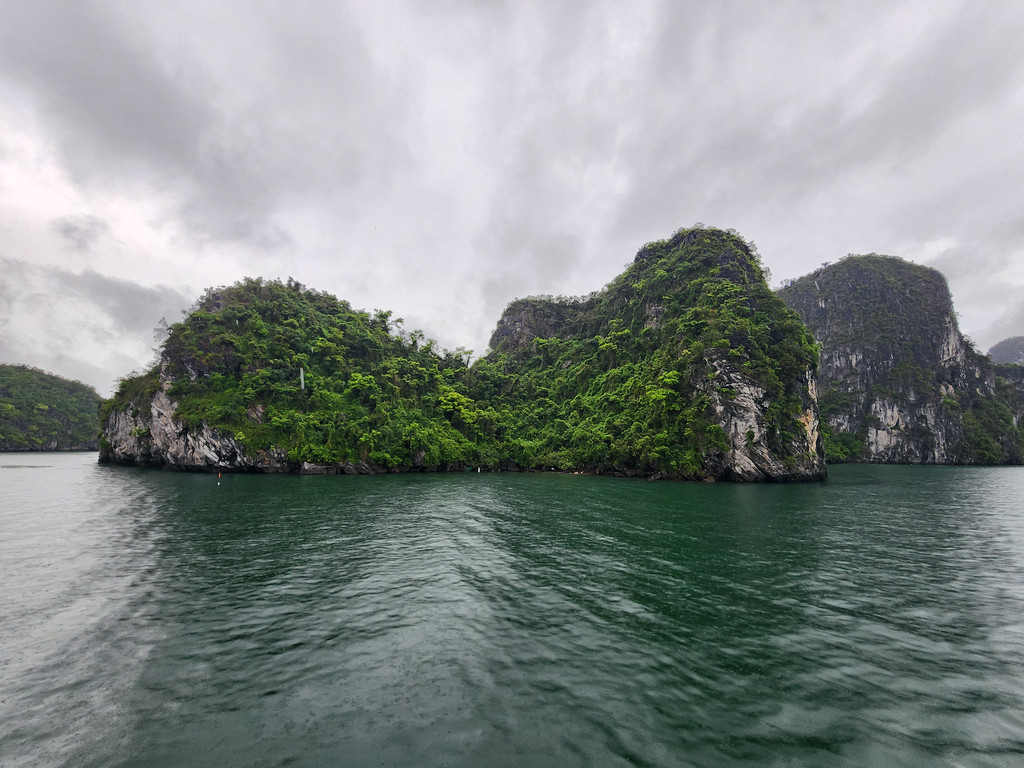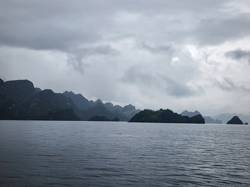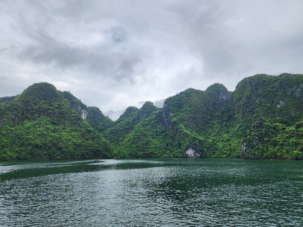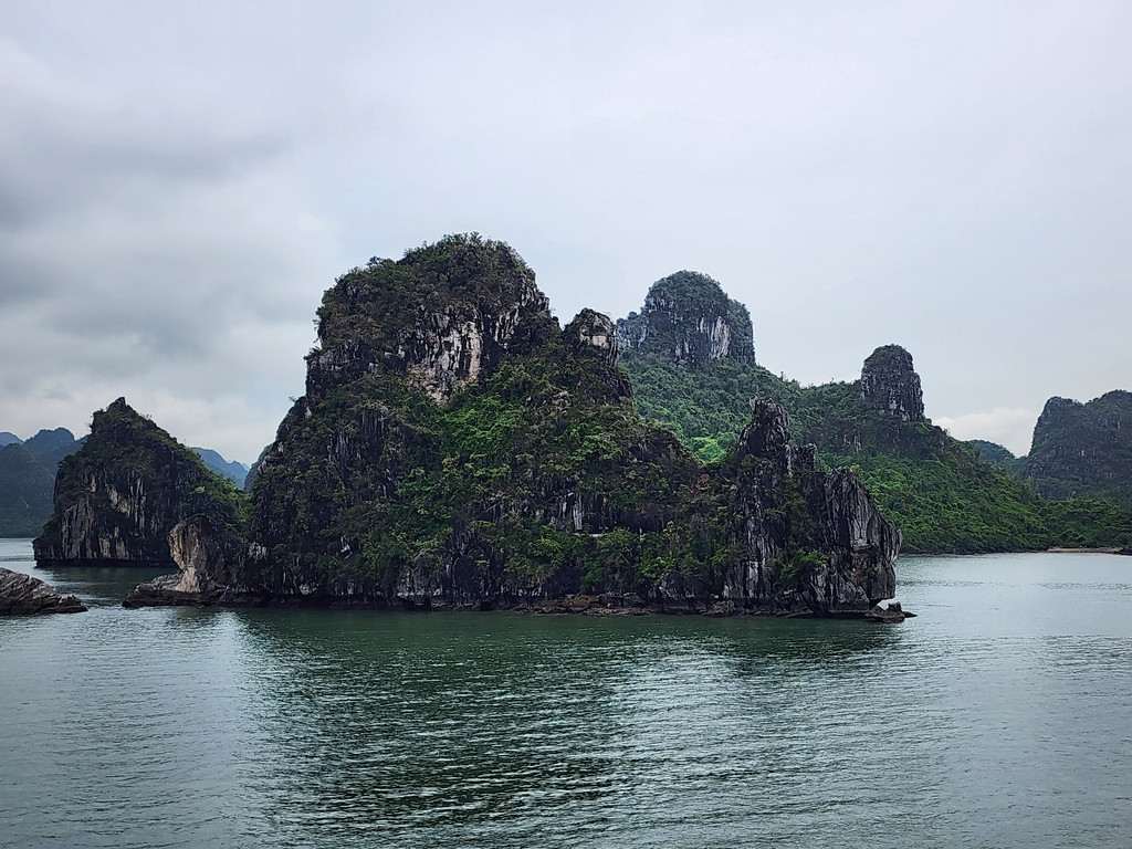 我们今天白天的行程需要换乘到另一艘一日游的游船,以方便深入位于下龙湾南部的Lan Ha Bay区域,同时也因为我们乘坐的邮轮要回到了下龙湾邮轮码头附近去接送游客。游船有三层,一层大半部分都是玻璃窗密封的船舱,因为一直开启着空调,靠近船尾有卫生间和厨房;二层则大多是半开放的空间,可以享受自然的风,也可以不受限制的观看景致;可惜一直阴雨,三层的露天甲板基本无法到达。脱离了大部分邮轮的聚集地,只有两三艘船行走在相对狭窄的水道,并不会显得拥挤。一直的阴雨时大时小,虽然没有蓝天白云下的山清水秀,但是烟雨蒙蒙令整个景色成了水墨画卷,同样是美丽的。可惜整个下龙湾的海水中总是不时会漂着各种垃圾,对于水体和环境的保护,在这里还有很大的距离。