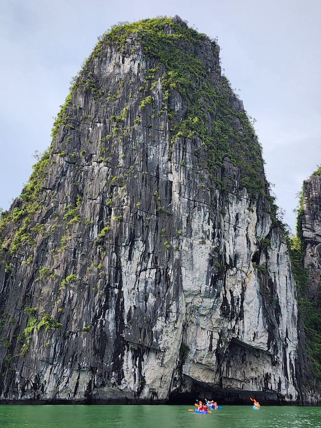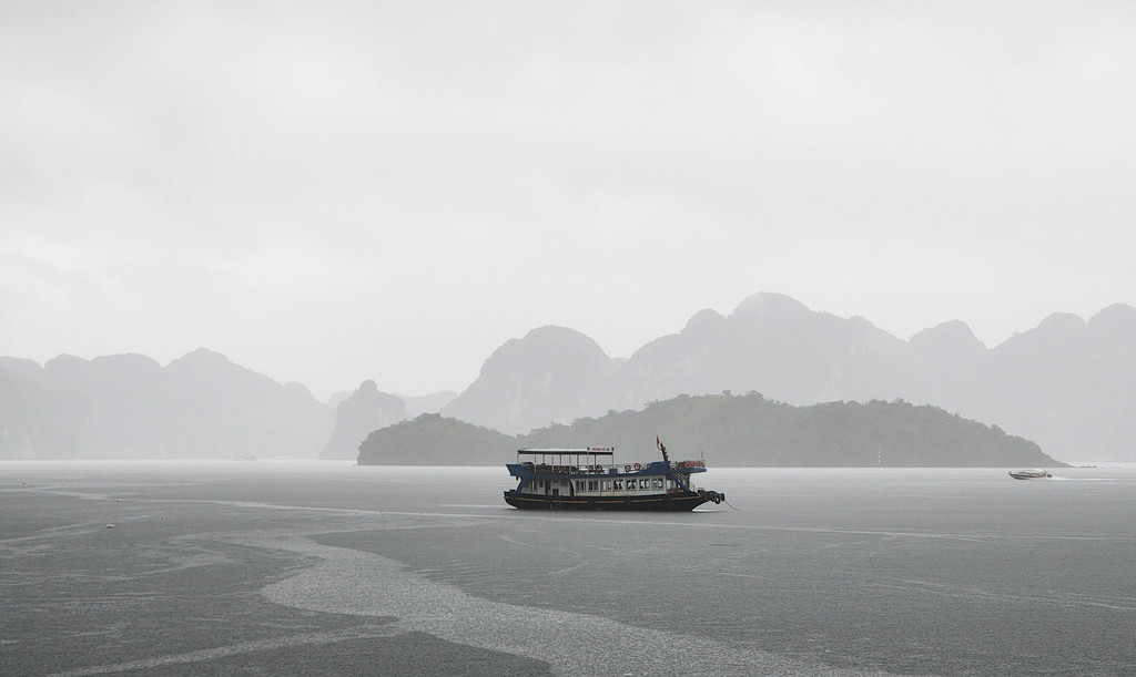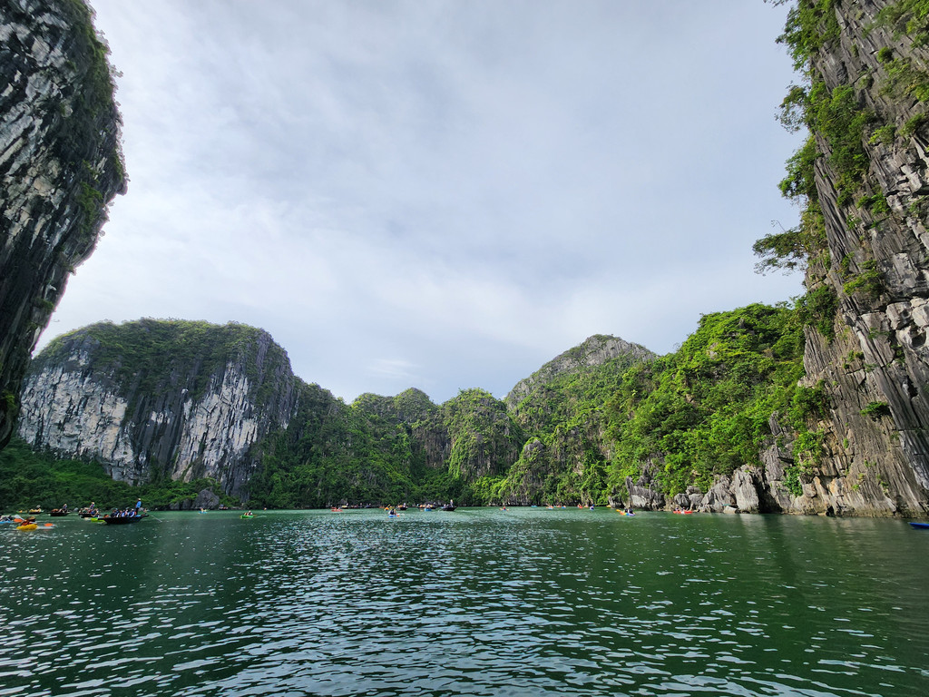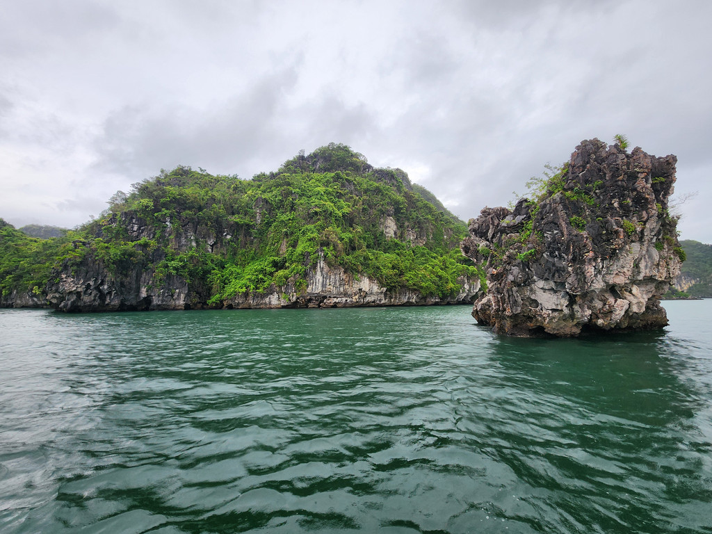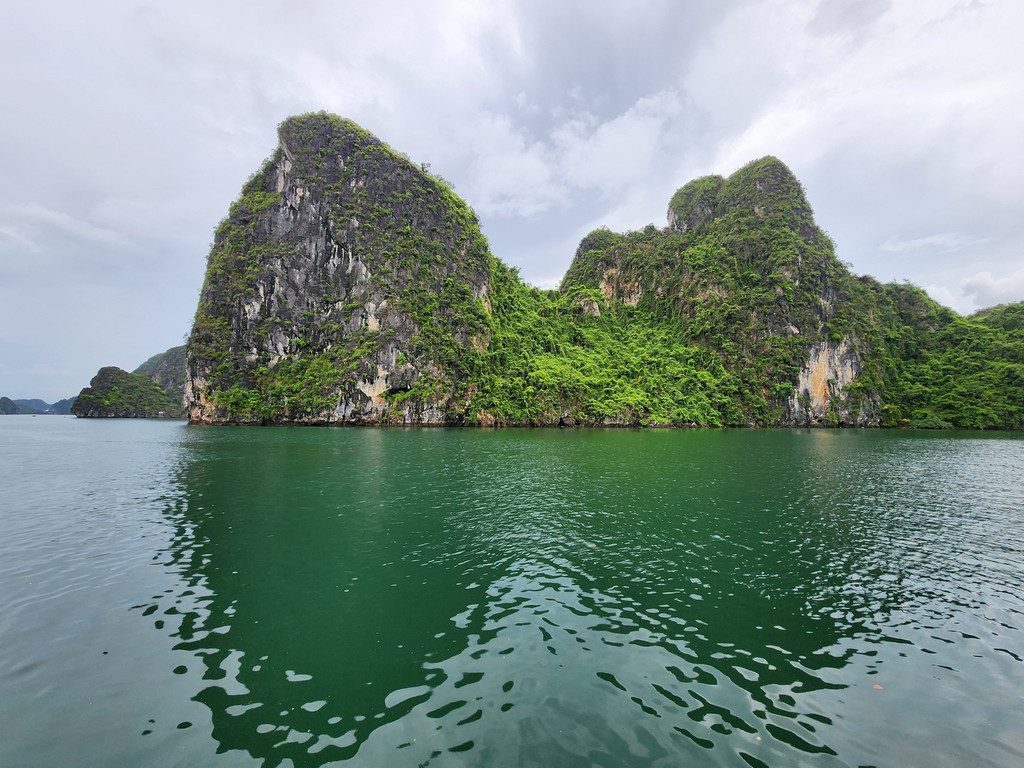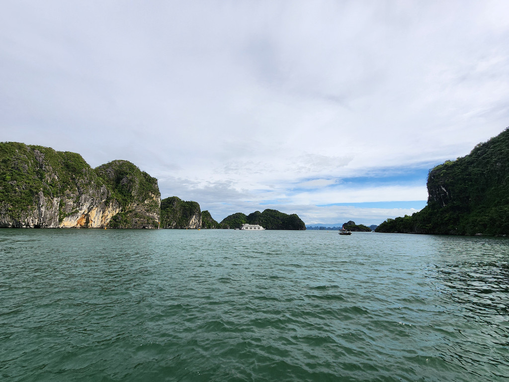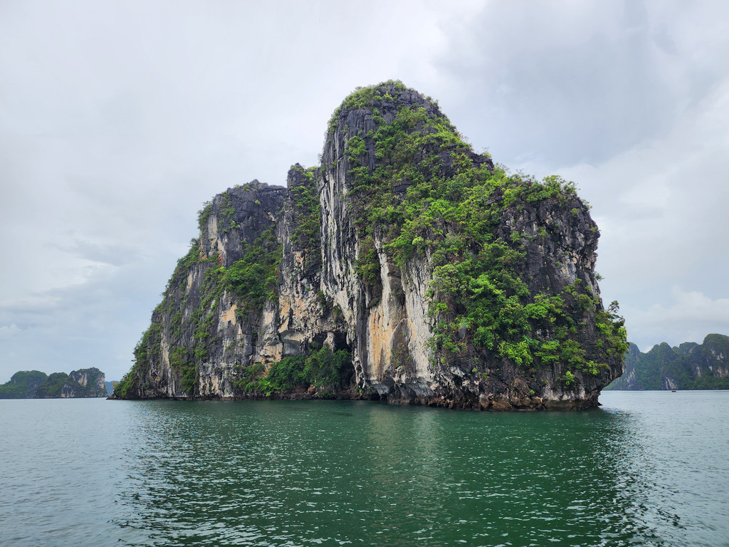 我们今天白天的行程需要换乘到另一艘一日游的游船,以方便深入位于下龙湾南部的Lan Ha Bay区域,同时也因为我们乘坐的邮轮要回到了下龙湾邮轮码头附近去接送游客。游船有三层,一层大半部分都是玻璃窗密封的船舱,因为一直开启着空调,靠近船尾有卫生间和厨房;二层则大多是半开放的空间,可以享受自然的风,也可以不受限制的观看景致;可惜一直阴雨,三层的露天甲板基本无法到达。脱离了大部分邮轮的聚集地,只有两三艘船行走在相对狭窄的水道,并不会显得拥挤。一直的阴雨时大时小,虽然没有蓝天白云下的山清水秀,但是烟雨蒙蒙令整个景色成了水墨画卷,同样是美丽的。可惜整个下龙湾的海水中总是不时会漂着各种垃圾,对于水体和环境的保护,在这里还有很大的距离。