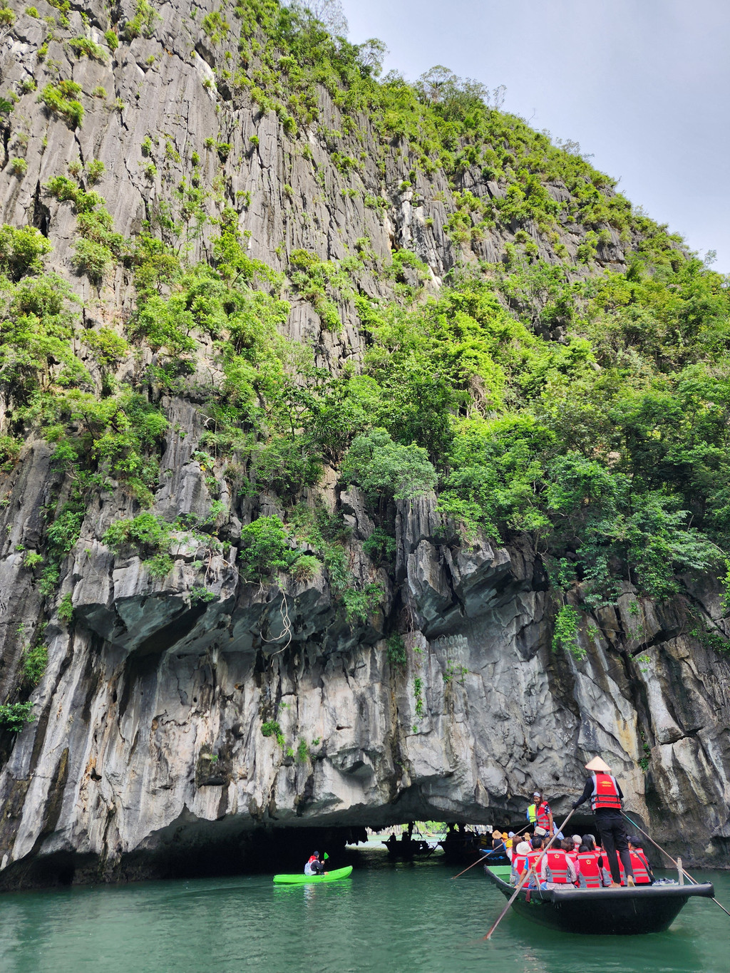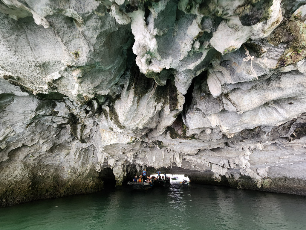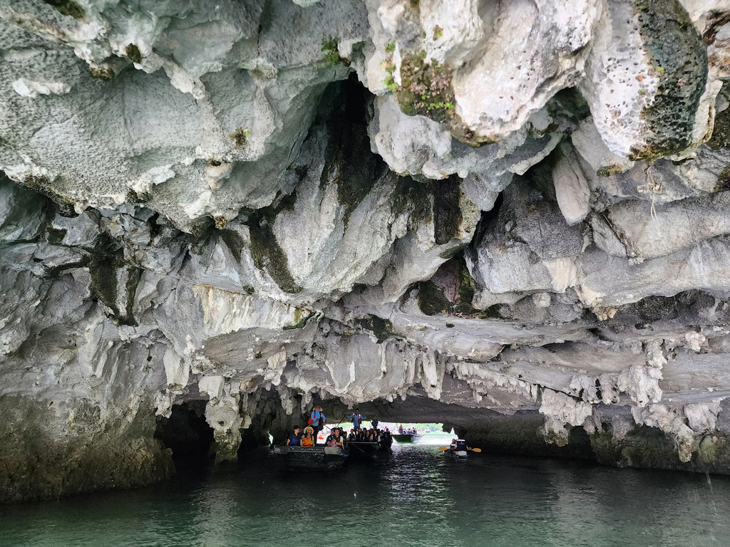 这个时间出门是为了赶在涨潮前去看看Luon Cave。这是一片被群山包裹着的海中湖,只有在退潮时可以穿过低矮的拱形溶洞通行。由于溶洞距离水面不过一两米,进入的方式主要有两种,十几个人共乘的小木船,由这里工作的船夫摇橹行进;或者自己划Kayak进出。这里的水面因为被陡峭的石灰岩山峰包围,水面平静,水质清澈,都是适合划船的,而且可以自由控制行进的方向。所以当我们准备穿过溶洞时就后悔了坐上小木船。据说周边的山上有着几百只猴子,邮轮的船员一直提醒游客不要喂食,避免猴子来抢东西,不过我们今天并未看到猴子,但是周围的悬崖峭壁上的确都是满山青翠的树林,是适合猴群活动的地方。刚刚穿过溶洞之时的豁然开朗,会让人有一种发现了别有洞天的惊喜。青山环抱着绿水,曾经大自然将这里隐藏得很静谧,不过被人偶然发现后,每天早上都会被络绎不绝的游人穿行而过。我们的船夫比较偷懒,进入海中湖后只到了中心位置左右就开始返回了,有一些船夫会去到比较靠近山脚的地方。我们又只能再次羡慕划Kayak的游人,自由自在地游荡。的确有些东西,只能依靠自己努力,需要自己把控,才有机会获得的,期望不劳而获时,就只能依赖他人之手了。