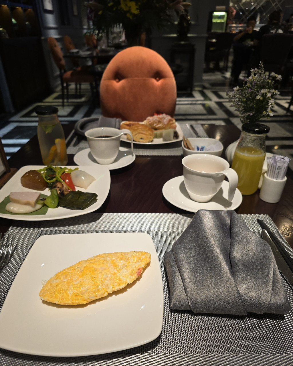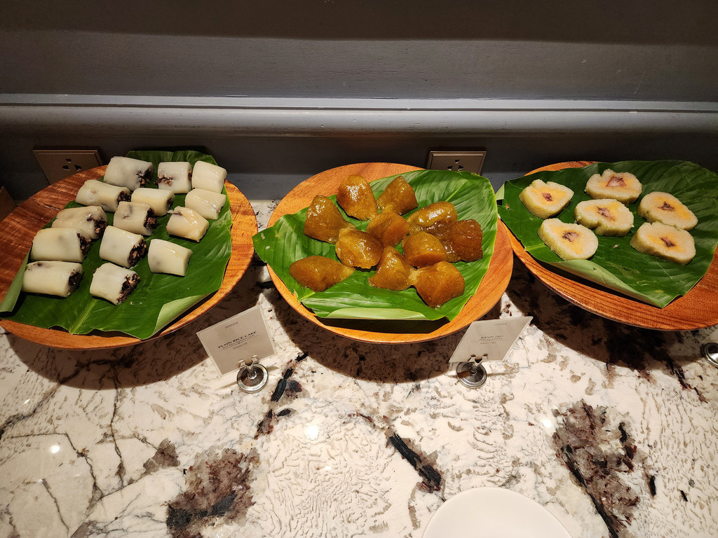第二天,早早去享用酒店的自助早餐,差不多就是刚刚开始而已,我们还以为不会有客人,但意料之外的有半个餐厅的食客。整体质量还算不错,特别尝试了Pho,这里的服务生说个人喜欢鸡肉的,果然美味,河粉丝滑,鸡丝紧实,不会像一般的鸡胸肉丝那样吃起来软绵绵的。反而这里的几种越南特色点心,我们都觉得一般,因为基本都是糯米做的,但是大多是冷的,外表有点变硬,而且多吃两口就会觉得胀了。试的两款面包还算不差,松软的口感,外表稍微酥。