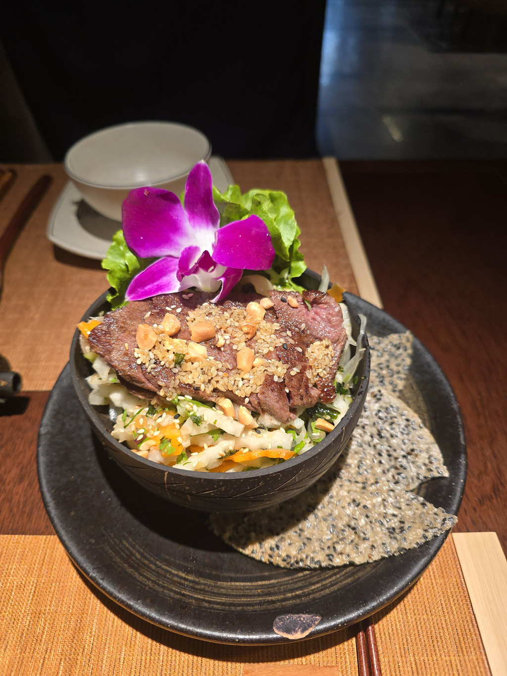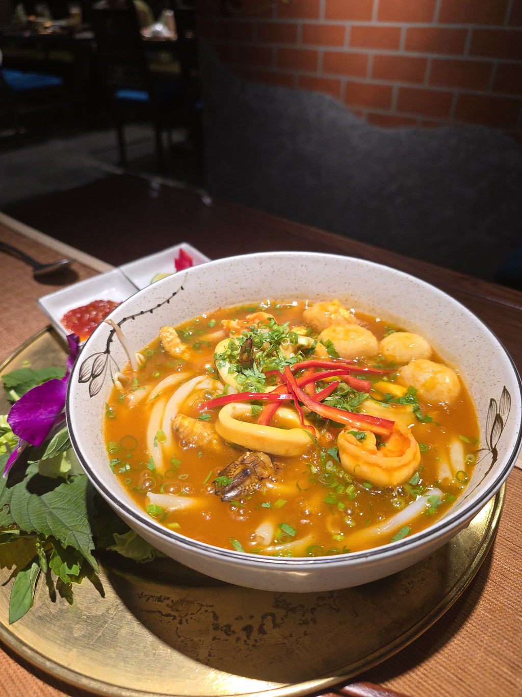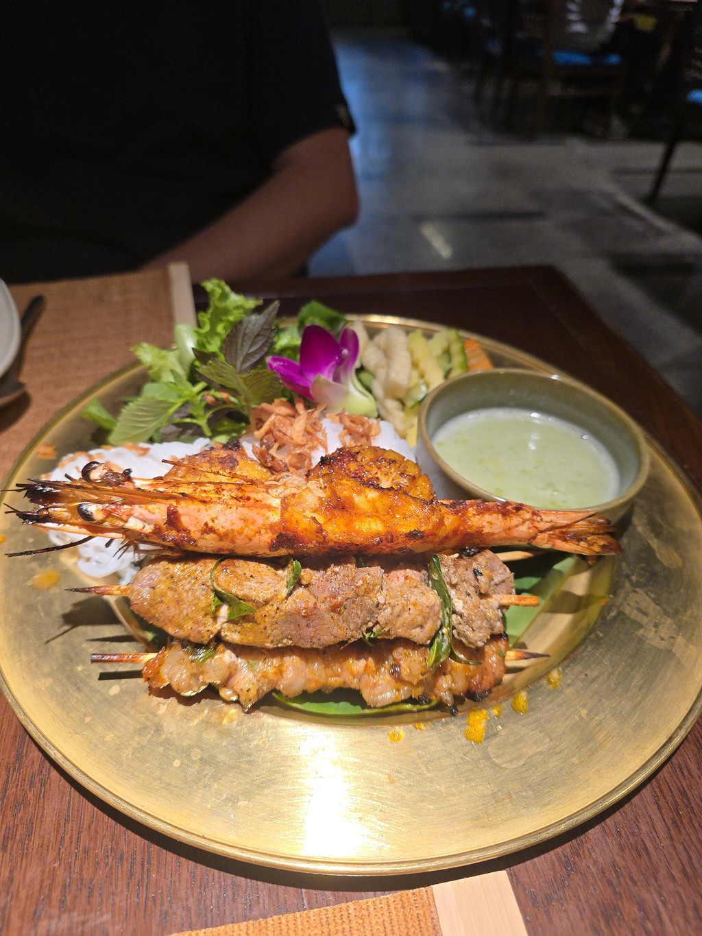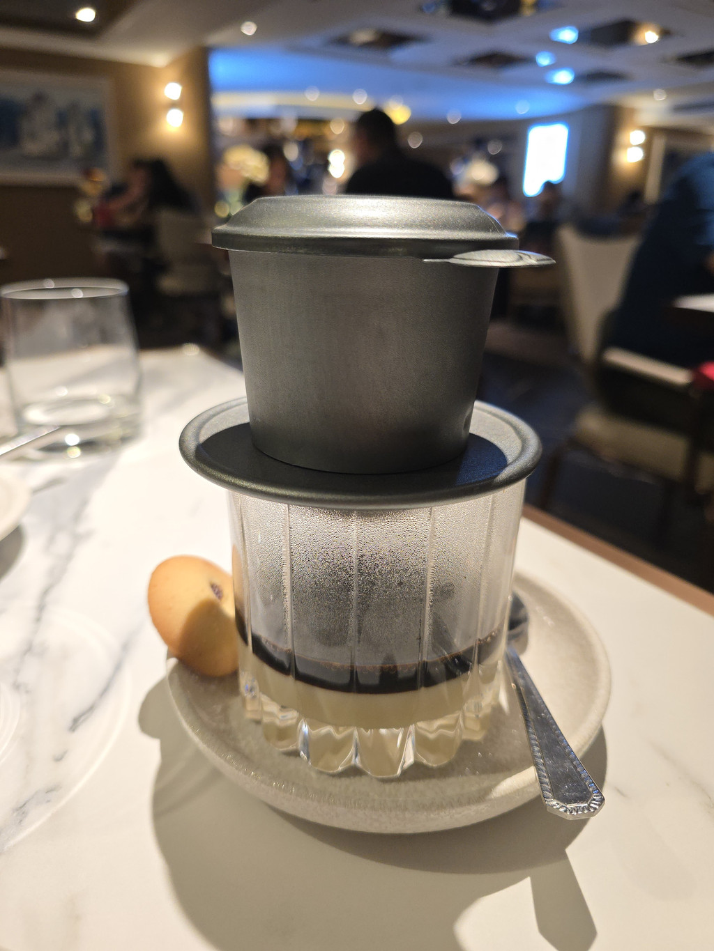 MIAs Restaurant,继续感受到这里良好的服务态度,我们四点多到达,并不是晚餐的繁忙时间,还是有几桌客人的,而且应该都是游客,看来是名声在外的。Chef's Grilled Tray,店员会帮我们将烧烤串的肉切开,并将虾去壳,让我们感受了一下高级餐厅的体验,不过牛肉稍微老了,但是带油脂的部分,在口中就会滋润到肉块。Hai Phong Crab Spring Roll,不同于一般的越南春卷,这款轻薄的表皮炸的酥脆,有点像豆皮,里面有满满的馅料,吃一两个还是不错的。Seafood Tapioca Noodle,配料占据了不少的位置,所以整个汤底很鲜甜,特别是上菜时才从茶壶中倒出浓郁的海鲜汤,整体感觉就又提升了一个等级,米粉是中空的,增加了吸收汤汁的空间,即便只是吃粉也会觉得鲜甜。Vietnamese eggplant and beefs,比较一般,整体不太出彩,牛肉略老,反而添加的脆饼比较特别。传统的越南咖啡,咖啡从杯子上方装满咖啡粉的铁器中慢慢滴漏到杯底装满了炼乳的玻璃杯中,形成了棕色的液体,可以闻到比较浓郁的咖啡香味,但是喝起来太甜了。