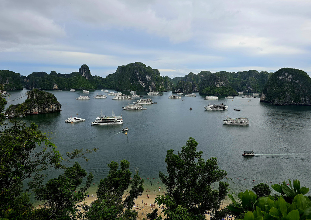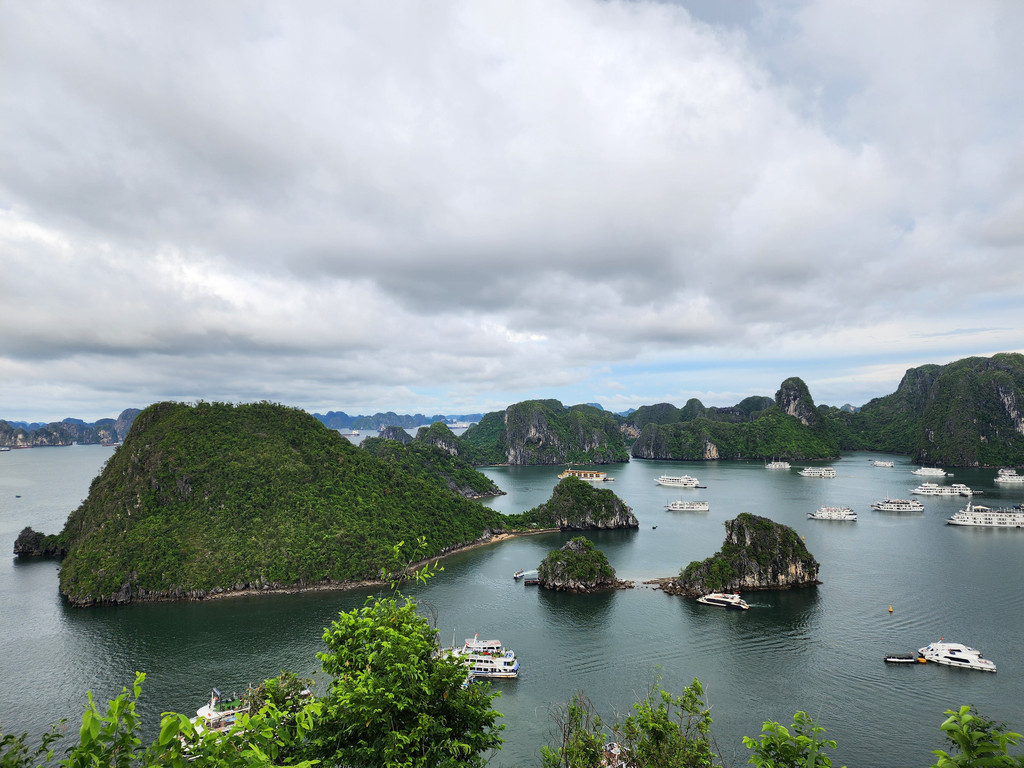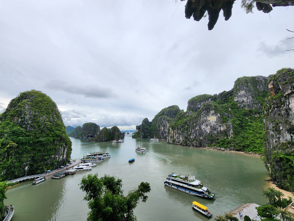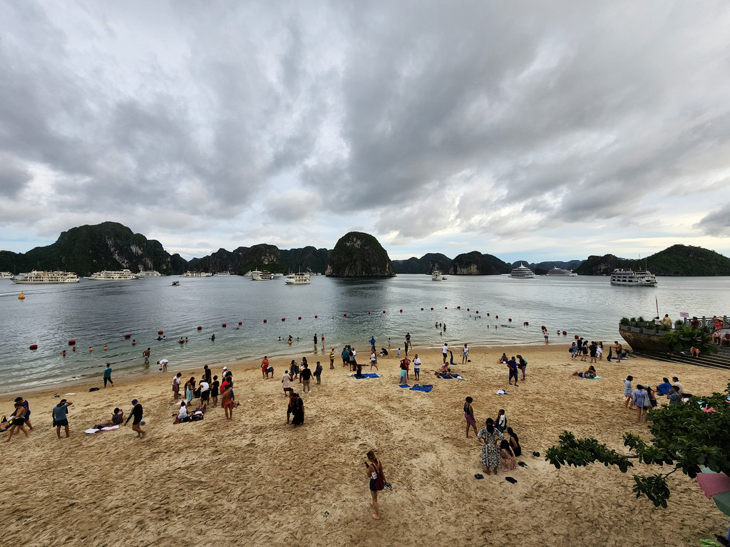 之后去TiTop Island,岛的命名是纪念苏联宇航员当年游览下龙湾时曾经登上这座小岛,同时也是下龙湾中心比较开阔的位置,所以是俯瞰景色的好地方,由于沙滩上挤满了游人,我们选择了先登山远眺,几百级的楼梯有高有低,也稍微有点转折,如果同时有人上下,就会略微拥挤和崎岖,不过整体不算难走,十来二十分钟便可以登顶。如果实在体力不足,中间还有两个平台可以不用登顶也能看看下龙湾。从山顶望向下方,一座座山峰独立于水面之上,一艘艘大小不同的邮轮点缀期间的水面,形成一幅独特的画面,不过船略微多了,水面显得有点拥挤了。当我们从山上下来,游人开始散去,沙滩上的人少了一些,我们稍微走过,感觉沙滩和海水的洁净程度都比较一般。之后我们也随着人流离开,经过快艇回到了邮轮上。每次回到快艇时,船员都会递上冰凉的纯净水,岸上活动时候的闷热都会得到缓解。