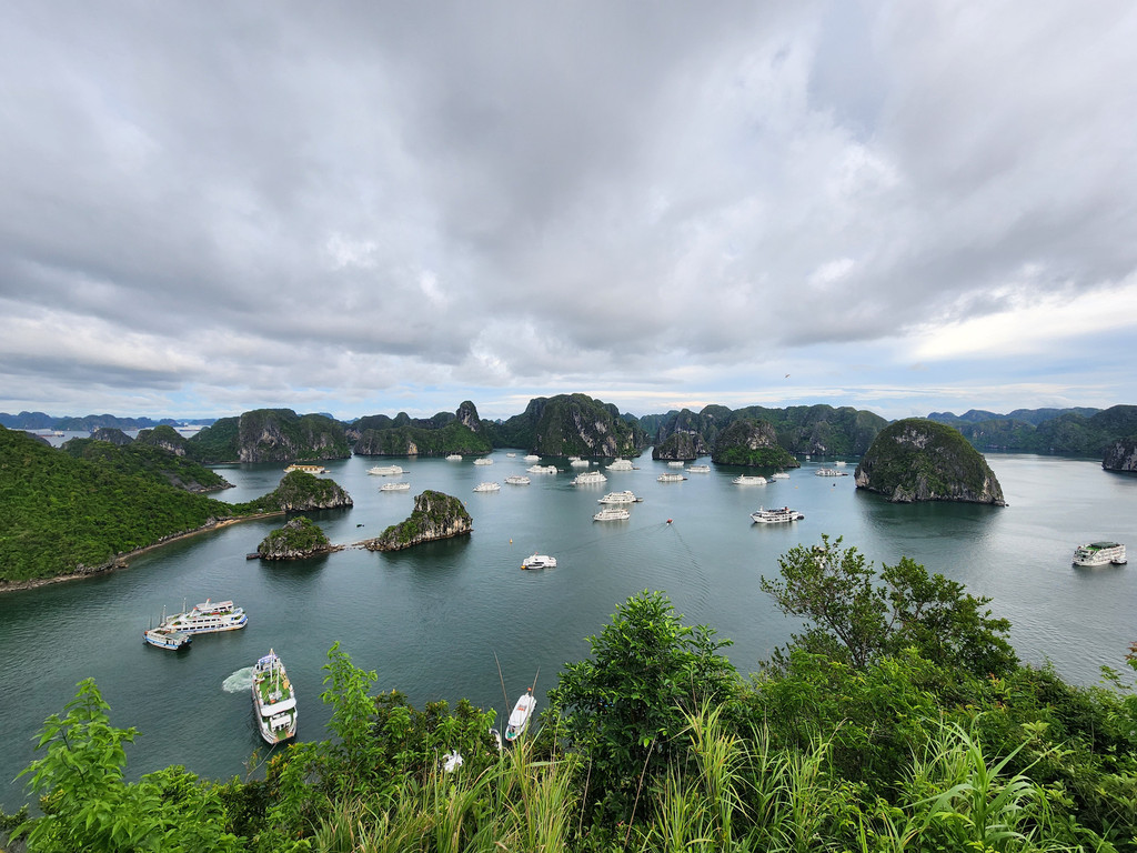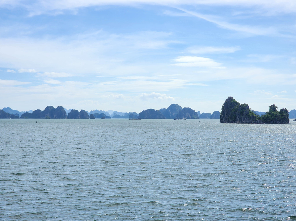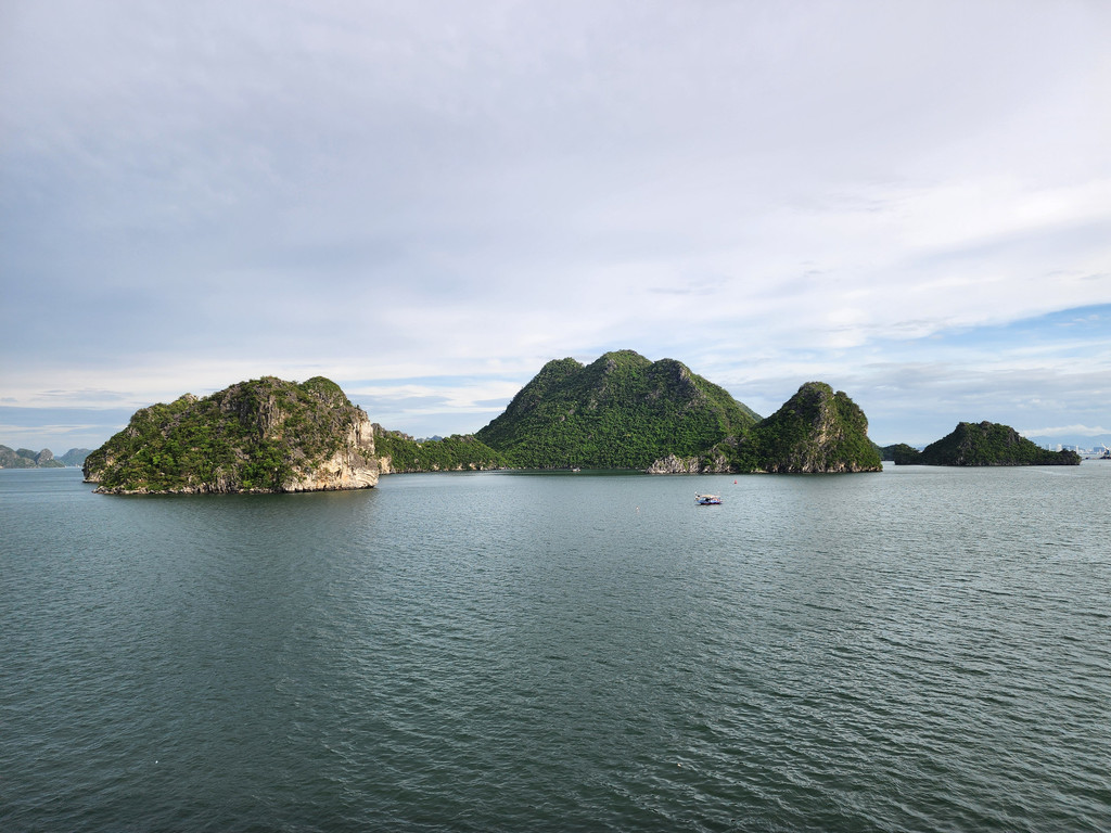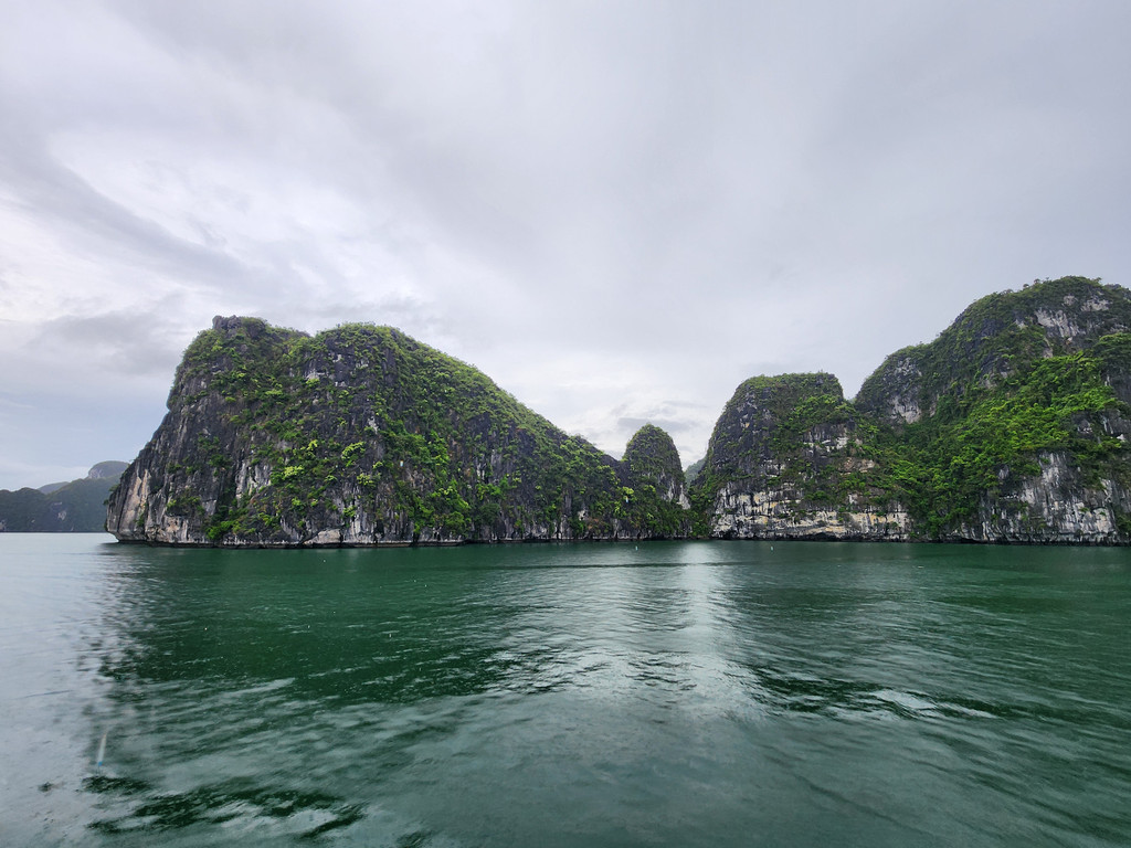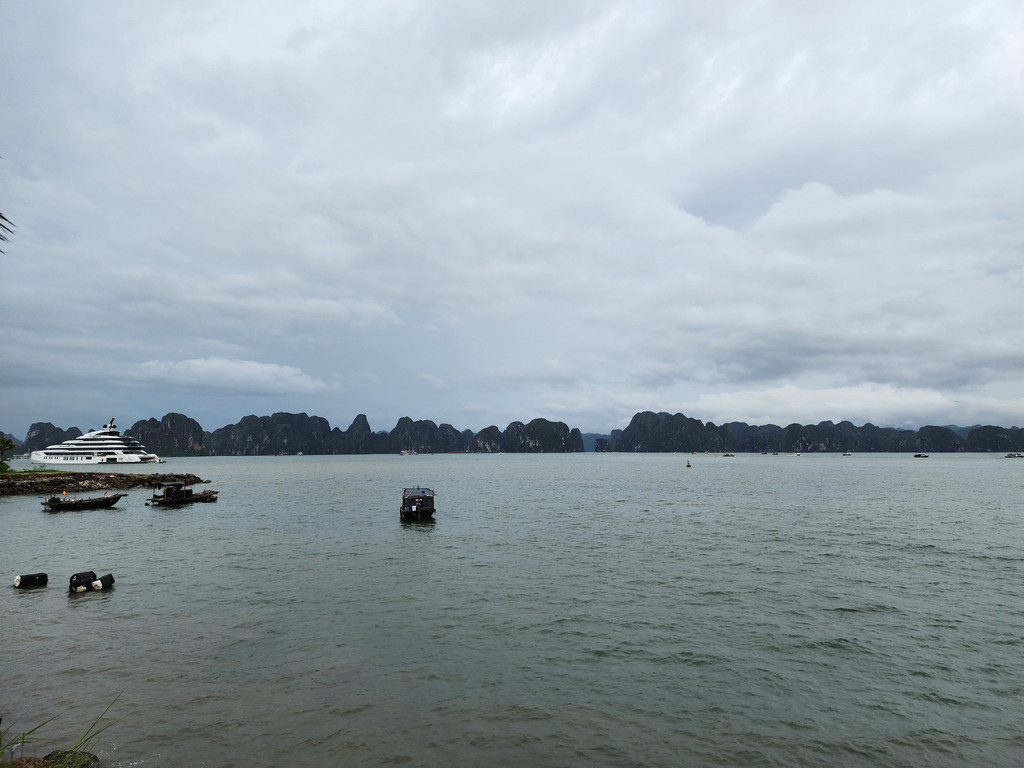 早餐过后,下起了小雨,我们登上了前往下龙湾的车。这里的旅游产业比较成熟,有专门的豪华巴士从河内来往于下龙湾邮轮码头,虽然是拼车,车内都是独立调节座位,车况也比较新而且整洁,每个乘客都拥有比较宽敞的空间。沿着高速公路CT04和CT06行进,河内的路两旁还有一些高楼,远处也能看到一些,离开河内之后,一路上两边基本都是绿油油的农田,而且都是比较平整的,偶尔有一些低矮的房子藏在田地之中,不过不多会我们就都在车上睡着了,醒来时,已经接近下龙湾,这时会看到一个个独立的低矮的石灰岩山体。途中司机会带到一个购物点,当作放松根骨的过程就行了。经过近三小时的车程,雨依旧淅淅沥沥,车到达了登船码头外,简单地核对之后,我们就在休息室内坐等登船了。之后三天,我们将在这片世界自然遗产的海域中感受一下这个独特的位于海中的哈斯特地貌。