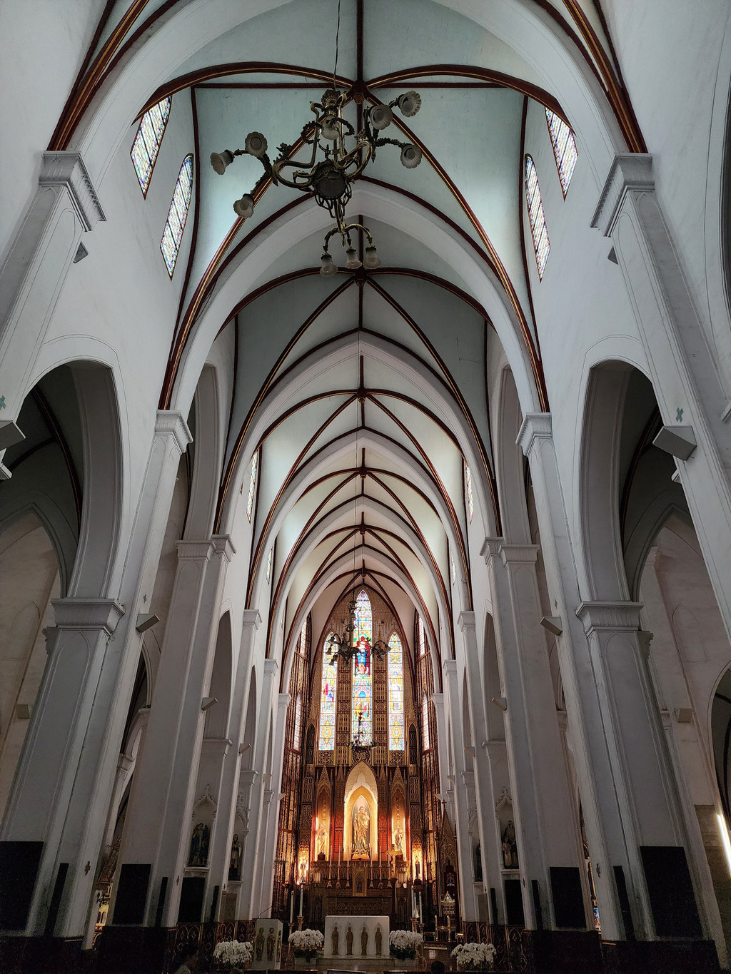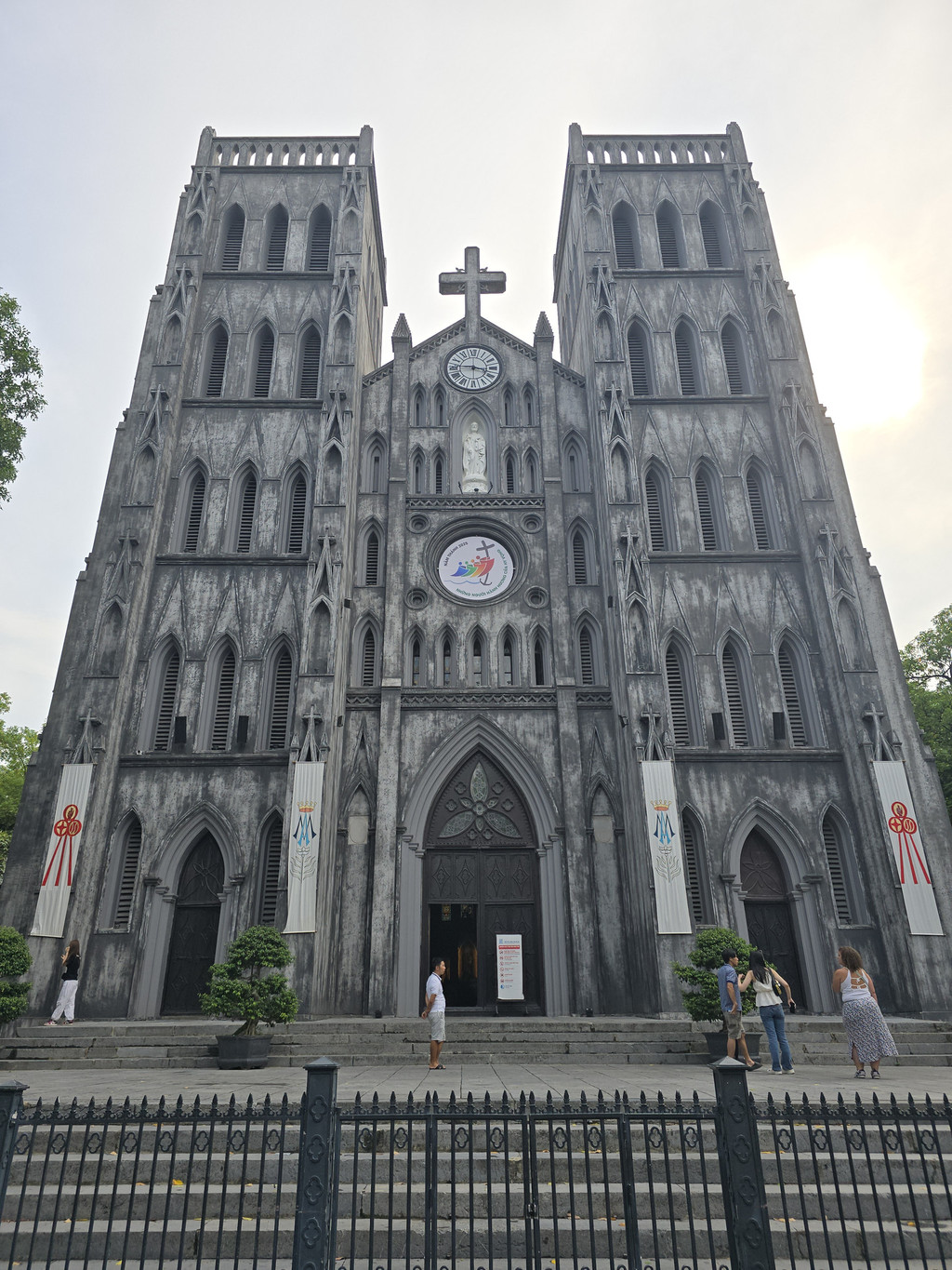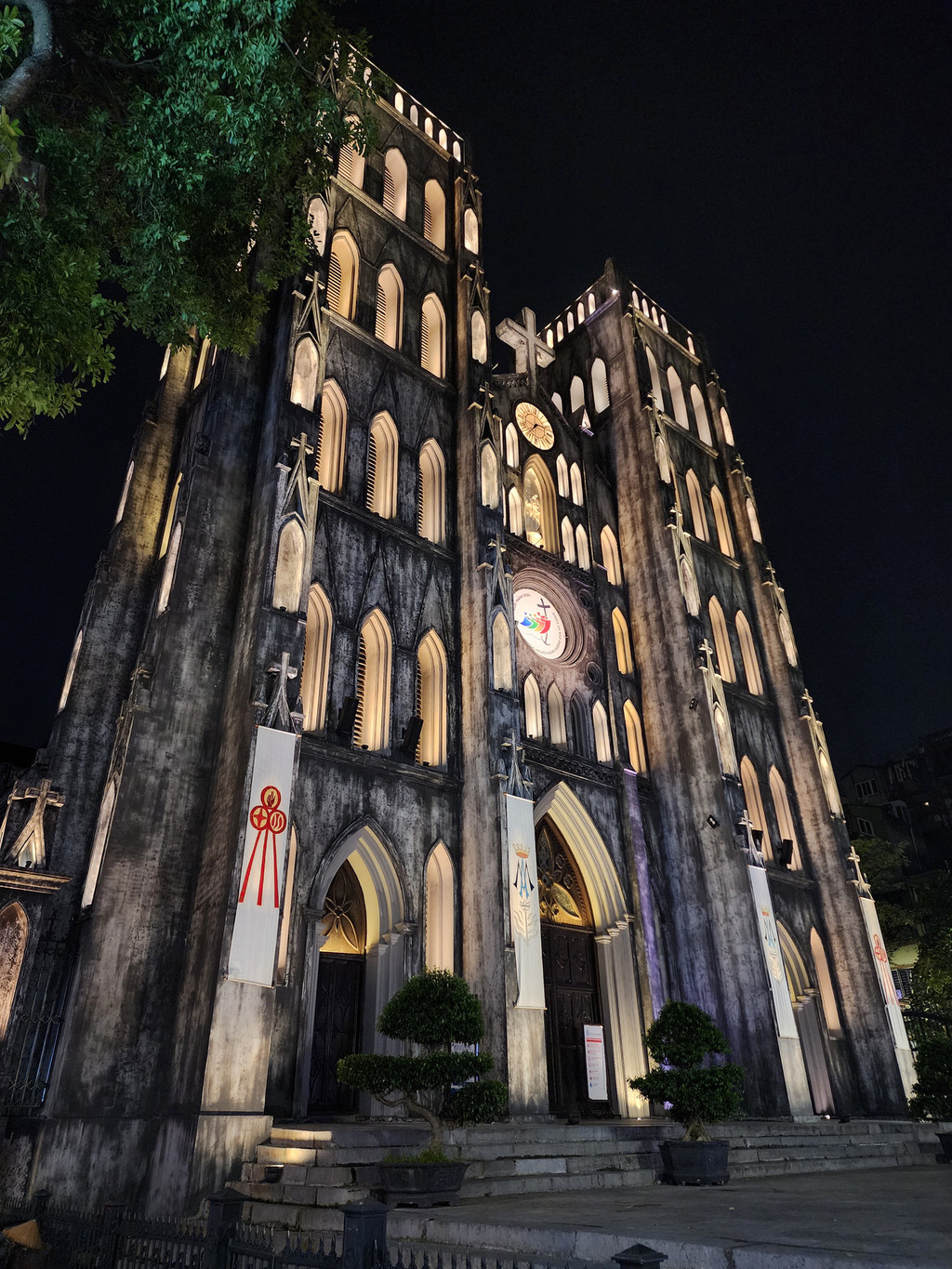 St. Joseph Cathedra,就在酒店旁边,这是河内老城区的特色建筑,日与夜是不同的景致。白天从外面看只是灰色的外墙,哥德式建筑带着双塔,可以感受到历史的面貌,当你入内参观,室内白色高耸的拱形又显得伟岸。晚上从室内透出的灯光照亮之后是温暖的黄色,而且灯光从每个彩色玻璃窗户透出,将建筑变得通透。