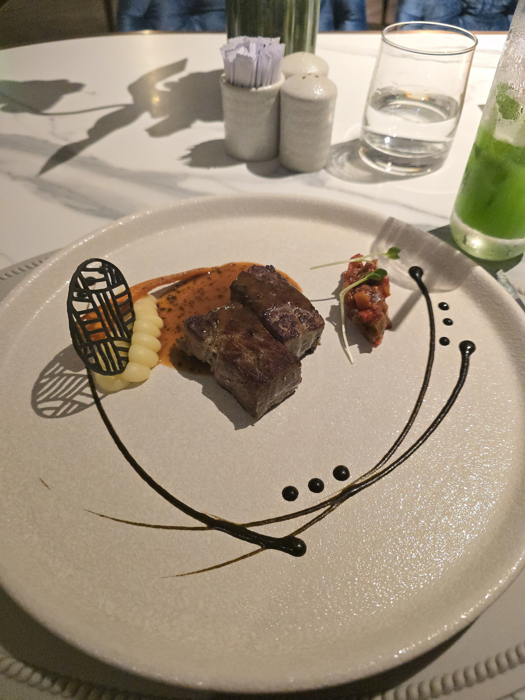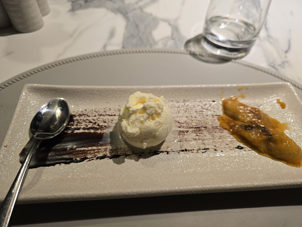 欣赏完美丽的晚霞,我们就前往餐厅享用晚餐了。每晚晚餐的早段时间都有当地歌手演唱本土风情浓郁的歌曲,虽然歌词不明白,但是音乐的旋律还是可以感染到客人们的。晚餐是五道菜的精致法餐。生蚝和龙虾,整体不错,不过调味较为一般。牛柳,稍微过熟,不过带脂肪的部分还是不错的,但是黑松露酱汁没有太多味道。