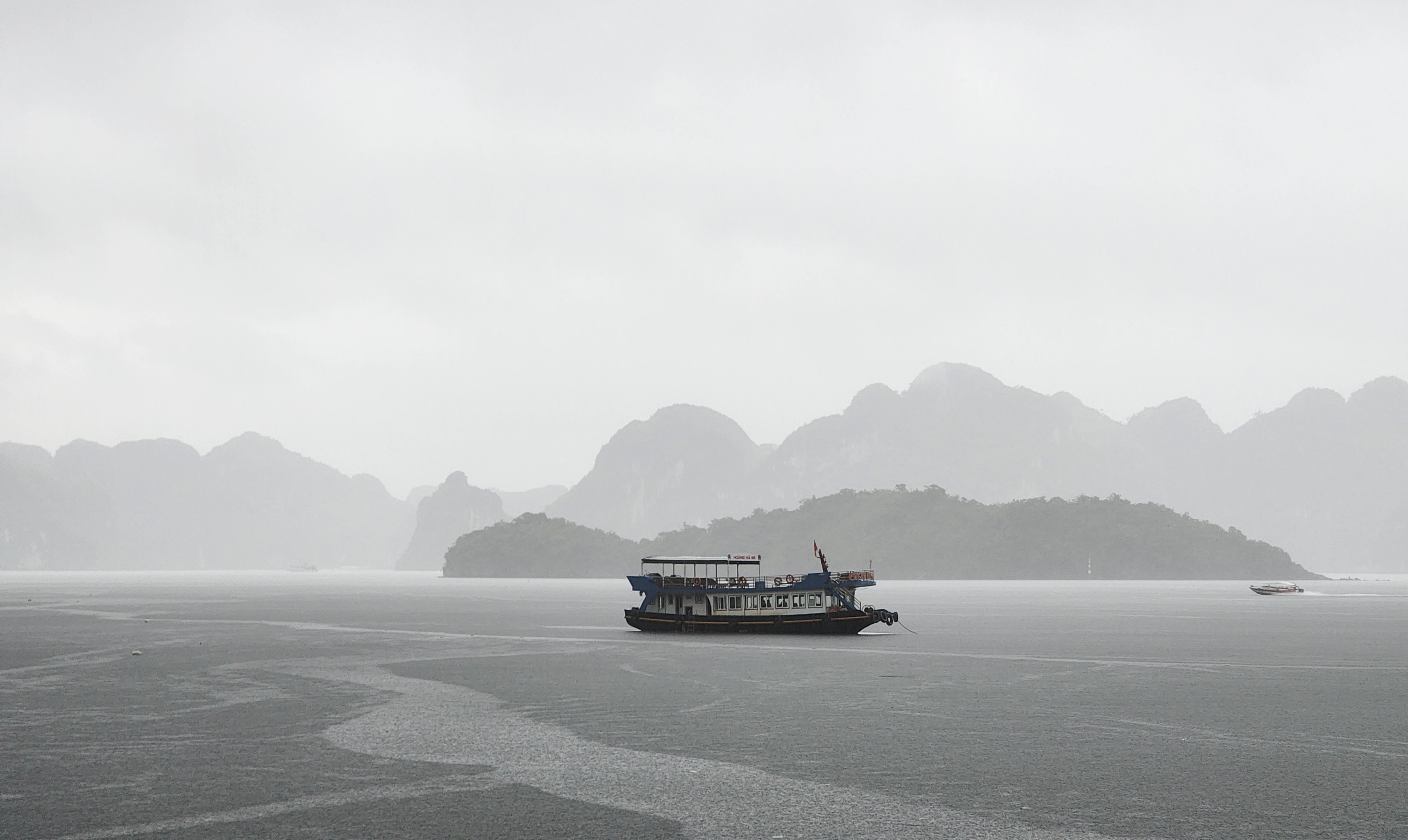 午后,雨又变大了,这时航行到一片较为开阔的区域,周围的山都有一定距离,在雨水的阻隔下,天地之间成了近乎只有黑白灰的颜色。水墨山水,在此处跃然纸上。