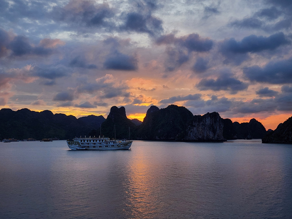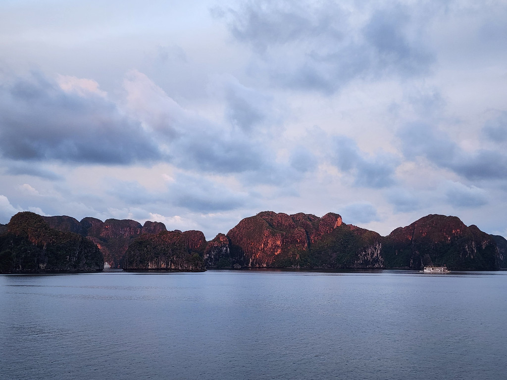 回到房间稍微歇息一会,偶尔发现,舷窗外的山体上映照出了夕阳微弱的橙红色,来到甲板上,顺利捕捉到了微弱晚霞下的下龙湾,从云层最薄弱处透出,映红了小小的一片海面,形成了一条红色的光带。