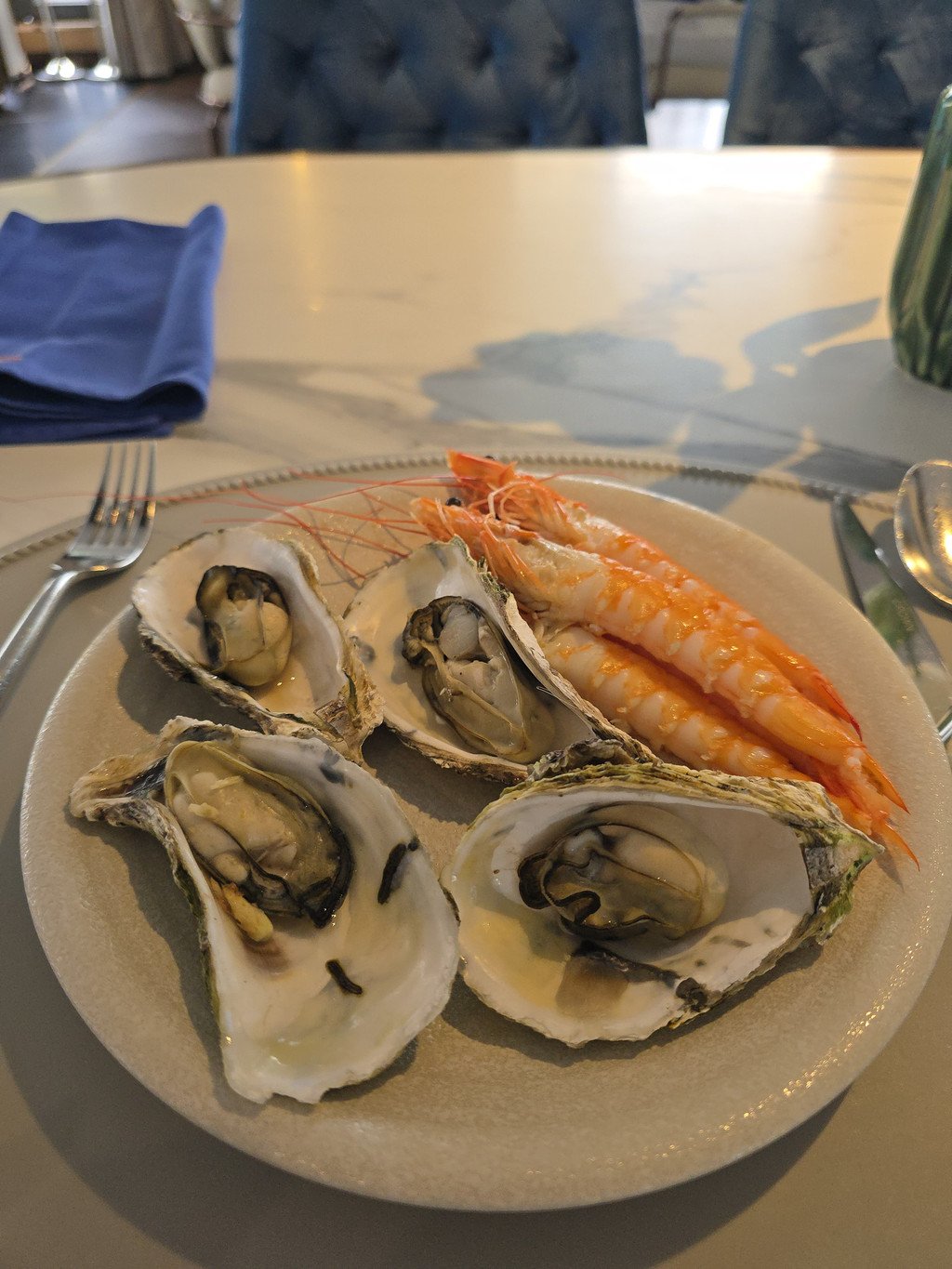 在房间稍微整理,就可以前往餐厅了,看完邮轮上的安全指引,开始享用自助午餐。每个房间的客人在餐厅里的座位每天都会安排不同的地方,我们第一天是在卡座,弧形的座椅,面对着舷窗,看着船行走在下龙湾水域之中,在石灰岩山体之间穿行。受限于是在船上,品类不算很多,海鲜,刺身,肉类,都只有两三款,但是每种菜品都是会得到补充的,质量也都不差,吃饱吃好都没问题。尤为当天的两款海鲜都不错,生蚝个头不大但是鲜甜饱满;海虾个头都不小,吃起来肉质紧实,而且这里的还提供剥虾壳的服务,每次我们拿上了,服务生就会带上手套帮我们处理,我们只需要大口吃肉就行了,似乎都因此增添了美味。另外芝士和Salami都很不错。
