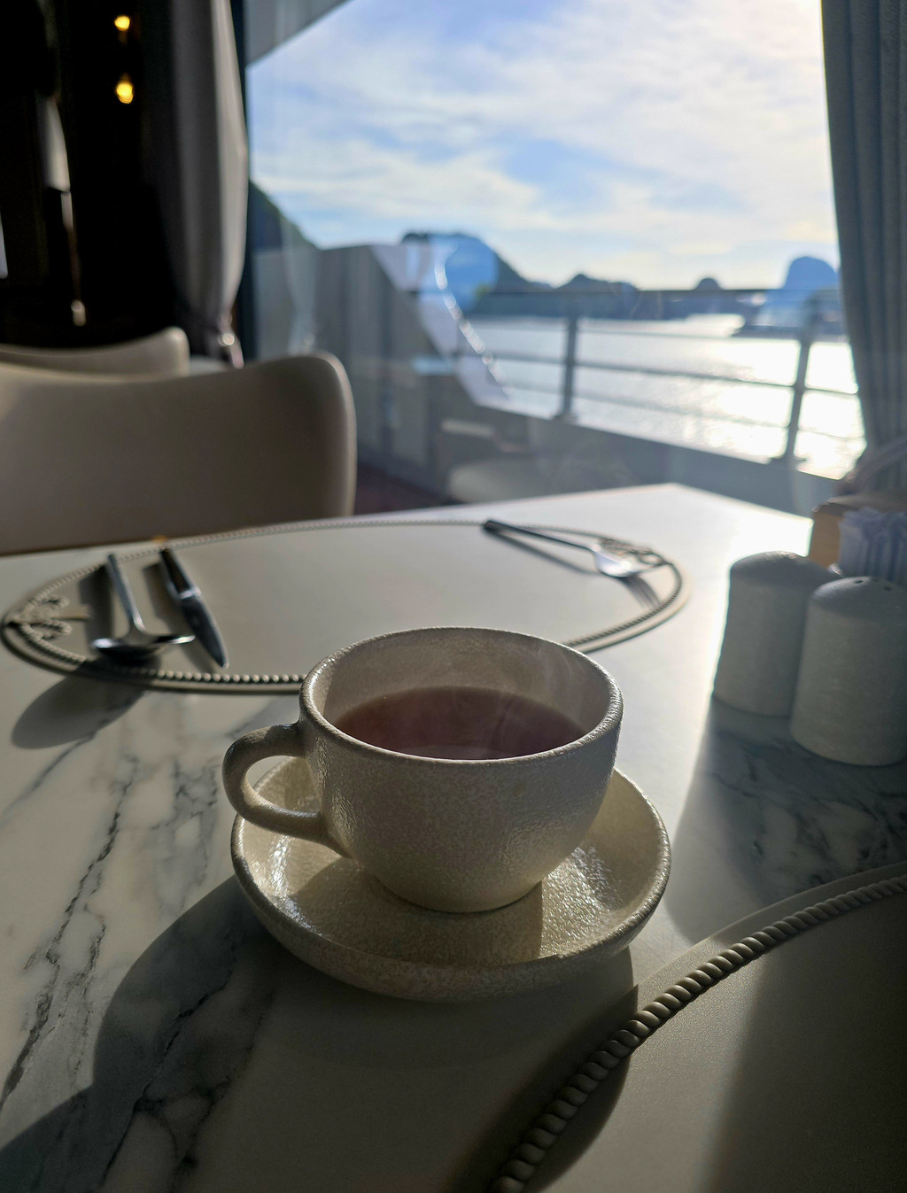 第四天的早上,天气明显改善了清晨甚至出现过阳光,空中也有了一些蓝天的位置。今早需要七点半就上快艇出行,所以我们只是匆匆吃过自助早餐便前往一层等待登船,自助早餐的品类和菜品每天几乎一样,可能只有水果和蔬菜,会基于当天情况稍微更改。
