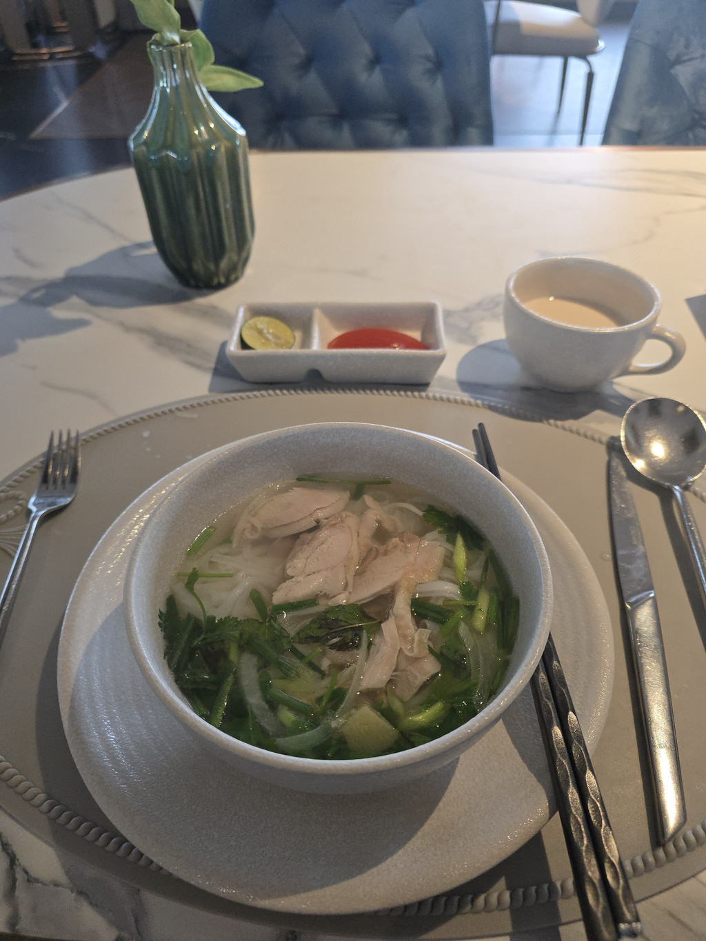 天气不能左右,但是我们的心情还是要放轻松的,虽然今天的行程需要八点左右就出发,我们还是先在餐厅舒适地享用自助早餐,品类不多,但是出品的质量不错,而且水果很丰富也很新鲜,不过甜度稍逊。我们尝试了鸡肉和牛肉的两种Pho,只是配的肉不一样,整个制作过程都是一样的。牛肉的会更好,带有肉香,而且是生牛肉和熟牛展肉的混合,口感更丰富。鸡肉不像我们之前吃到的是鸡肉丝,而是鸡肉块,反而失去了口感,略柴。粉非常顺滑,淡淡的米香,看着很简单加几勺高汤而已,却是不错的出品。