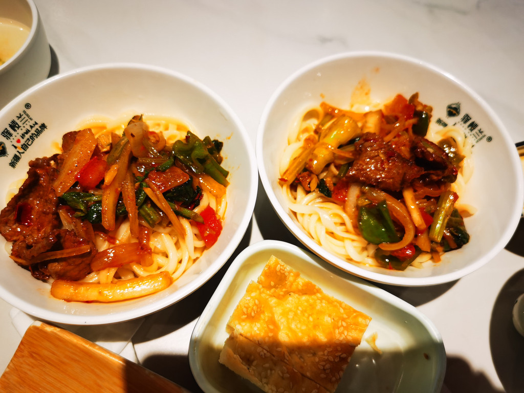 最后上的是两小碗牛肉拌面,也就是新疆的拉条子,其历史源远流长,最早可追溯到甘肃河西走廊一带。当地居民世世代代食用拉面,做工精细。后来,随着河西走廊居民逐渐向北疆移民,这种面食逐渐在新疆传播开来,并与当地肉食习惯相融合,形成了独具风味的新疆拉条子。拉条子的产地遍布新疆各地,但奇台县被誉为拌面的天下,这里的拉条子尤为著名。拉条子,搭配各种蔬菜和牛羊肉,色彩斑斓,令人垂涎欲滴。其制作方法看似简单,实则考究。选用优质的面粉和适量的盐来和面,经过充分的揉面和醒面后,拉制成细长的面条。这些面条在煮熟后,会搭配各种新鲜的蔬菜,如白菜、韭菜、辣椒、茄子等,以及牛羊肉进行炒制或拌制。制作过程中,厨师们需掌握适当的时间和火候,以确保面条的筋道和嚼劲,以及菜肴的色香味俱佳。品尝时,每一口都能感受到面条的爽滑与菜肴的鲜美相互交融,香而不腻,开胃爽口。拉条子的口味多样,有过油肉拌面、芹菜炒肉拌面、韭菜炒肉拌面等多种选择,每一种都独具风味,令人回味无穷。前面的肉都是我吃的,所以我的拌面让给了不吃肉的胖子解决,又是吃撑了的一顿。