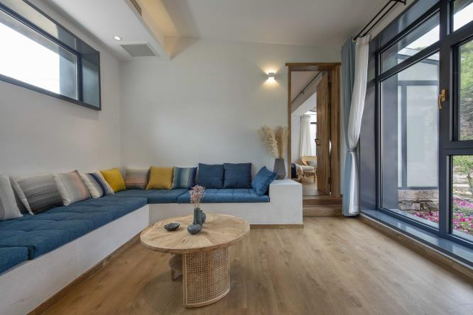 房间以白色和原木色为主色调,打造舒适惬意又不失温馨感的空间,附以亮黄、灰蓝等跳跃色搭配。房间的设计注重室内外互映,利用露台、地台等设置,将室外的景色与房间进行融合,打造出虽无院落仍能与自然对话的效果。