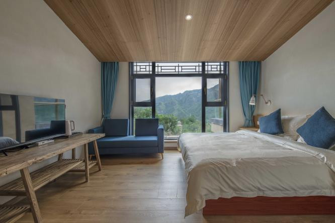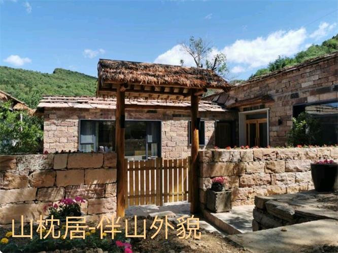 山枕居是一个独立的院落,包括伴山、隐山两个院落各5间房,隐秘而安静。整体建筑及室内风格原生态而质朴,既有大开大合的豪放,也有返璞归真的野趣。