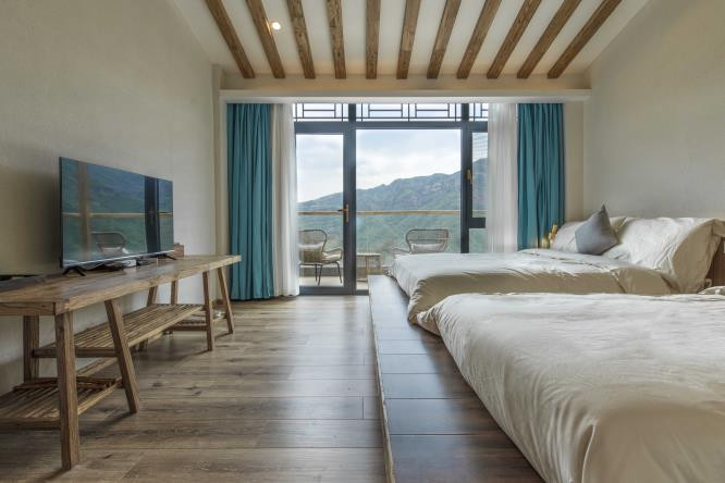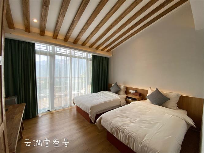 云湖堂共设客房8间,一层是前台接待大厅、餐饮、书吧,二层主要是客房。朝南一面的大露台,不论是等待住宿、 用餐、看书、绘画都能在配备的露台上得到醉佳的视角。凭栏远眺,视野开阔,与对面青山相看两相欢,置若春雨蒙蒙,山间云雾缭绕,如云海,似梦泽。