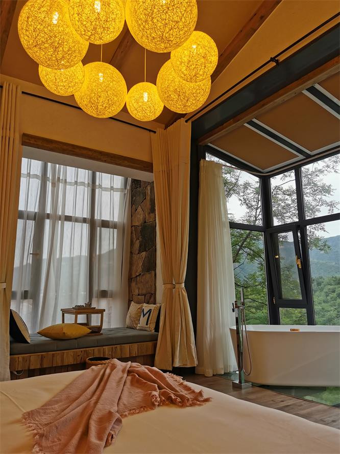 小院中接山地之气,自然天光;室内则另有一番姿态与自然对话。有时尚前沿颇具网红气质的玻璃房,有的吊床+沙发+榻榻米的野奢气质房,有一面山石入屋的原生态房,有附带茶室的套房。浣溪沙已经成为一房难求的旅行者的山居美宿。