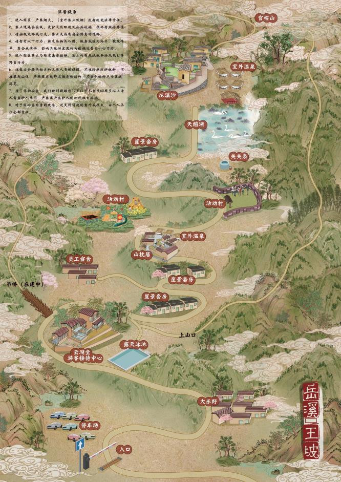 王坡民宿共分为5个建筑群落,分布在河北省邯郸市武安市活水乡口上村山麓,大乐野、云湖堂、观山月,山枕居、浣溪沙,共计21个院子。整个院落配有无边际泳池、温泉汤池、餐厅、茶舍、咖啡吧、图书室、儿童游乐场、环山步道等。古“王坡”地域,毗邻“京娘湖”风景区,依山就坡,傍水而设。
