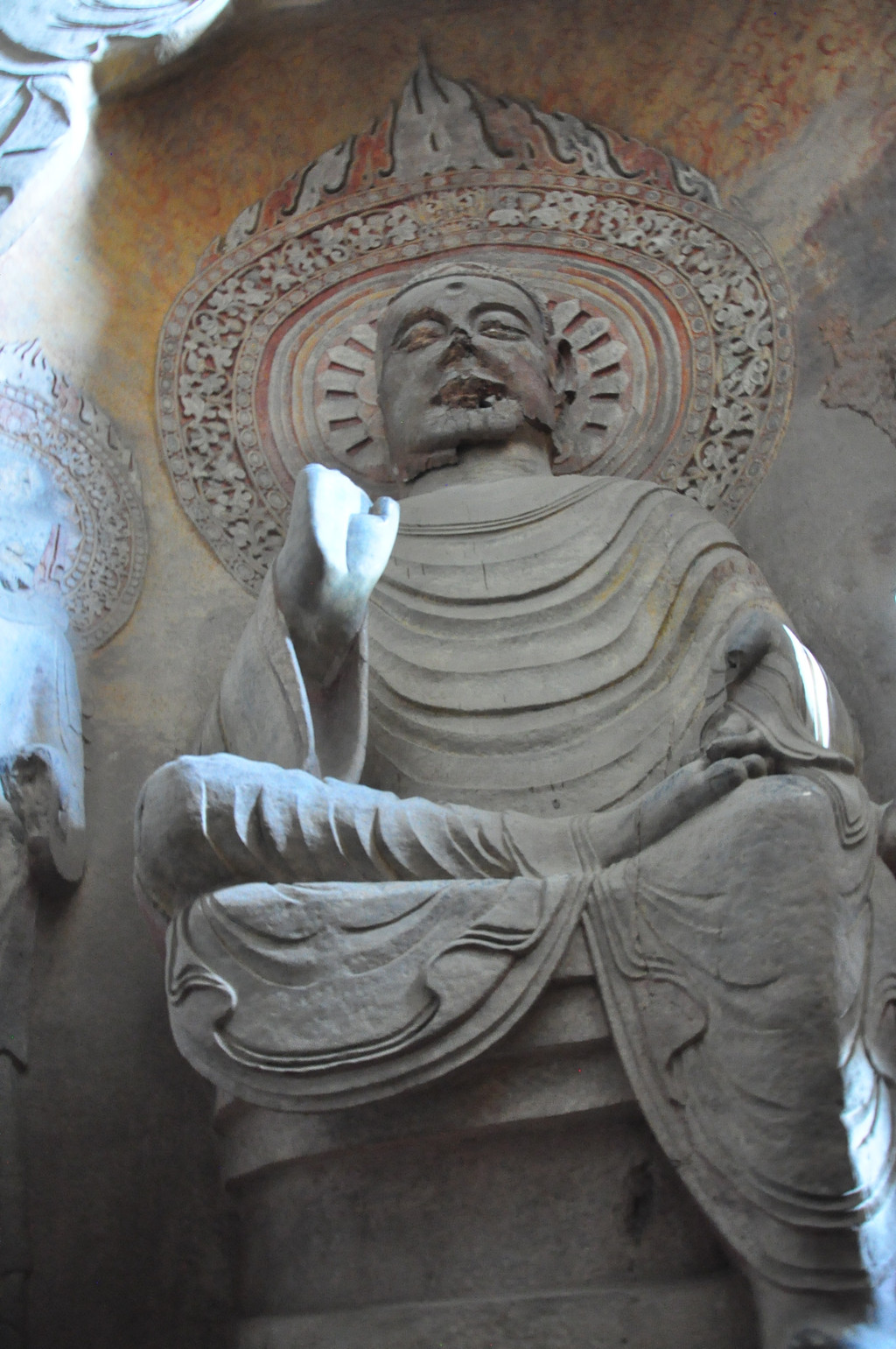 我们首先去的是距市区较远的北响堂山,北响堂位于和村镇鼓山西侧,建造在半山腰石壁之上。它草创于北魏建于北齐(公元550—577年),北齐后隋、唐、宋、元、明又均有续凿。现存石窟9座,(其它小龛不在其内)大小佛像725尊。石窟分南、中、北三组,每组皆有以北齐为代表的一个大窟。中国史学家范文澜在《中国通史》中写道“北响堂石空窟大佛洞可以与龙门石窑的宾阳洞、巩县石窟第五窟、云岗石窟的各大窟相媲美”。